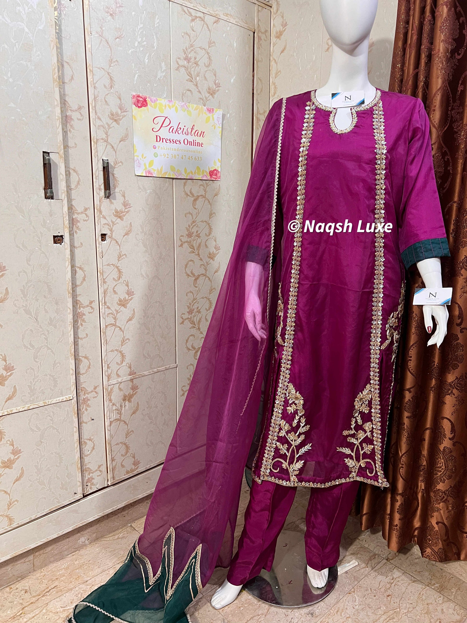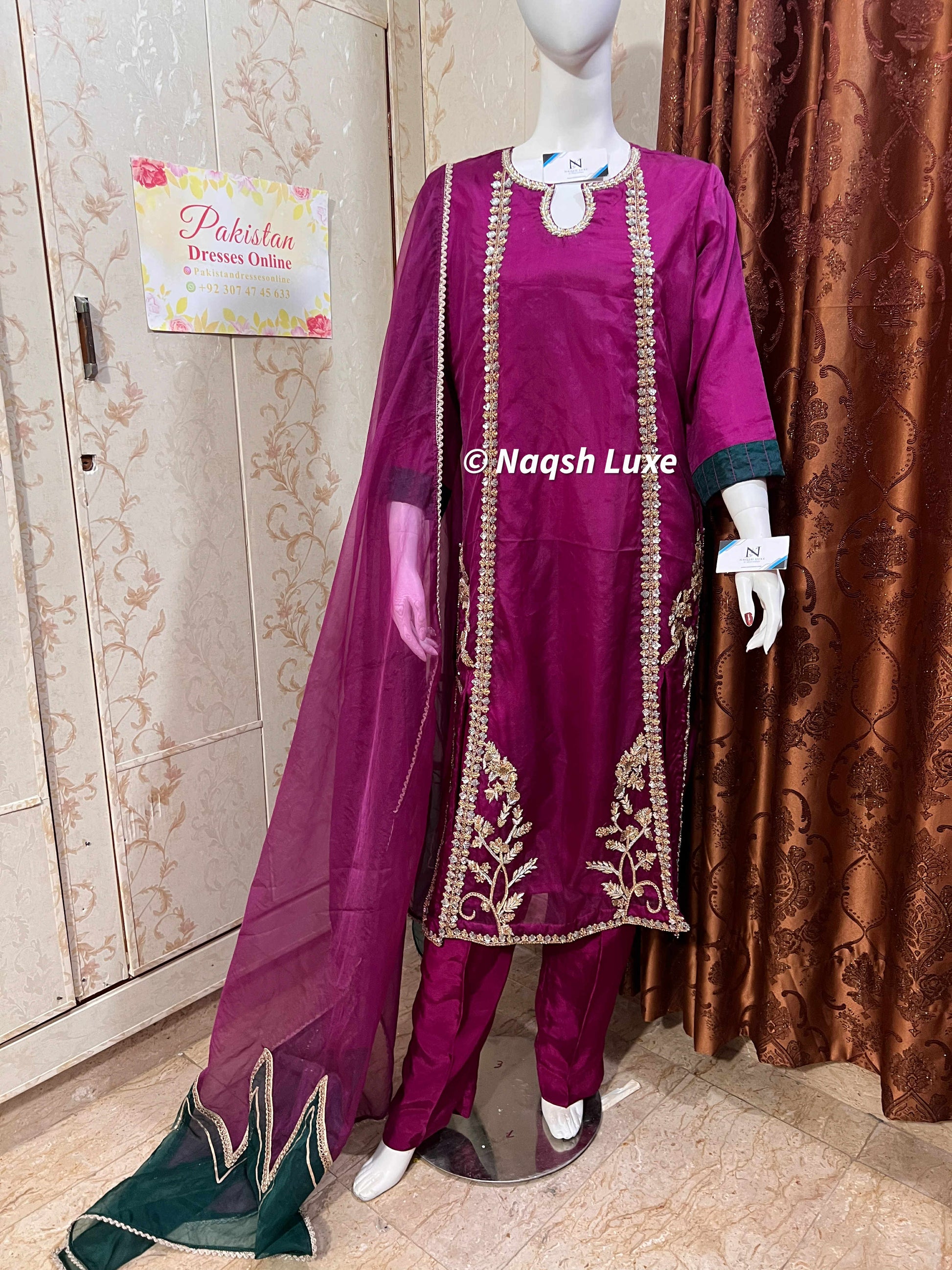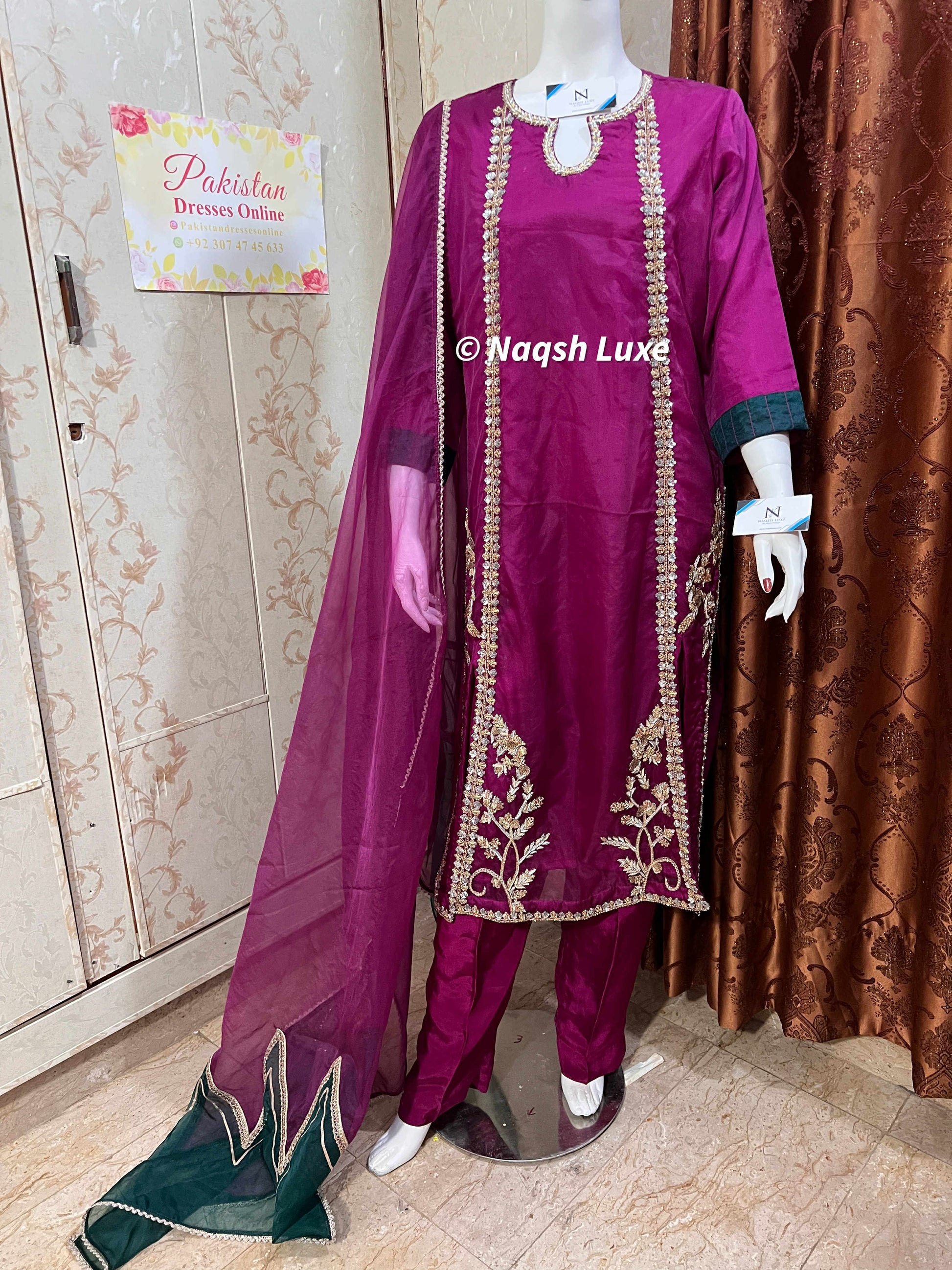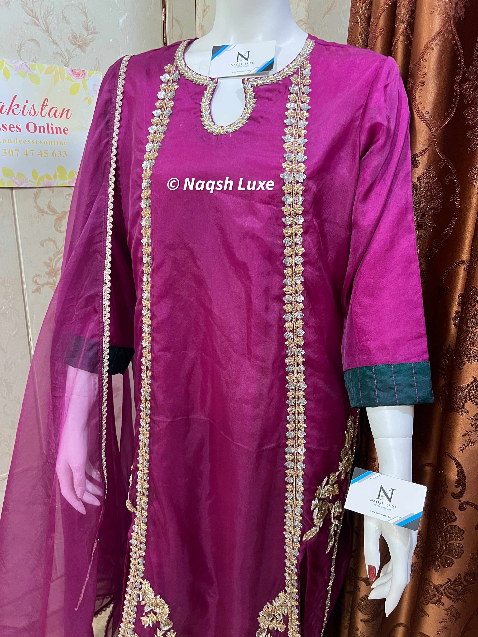 ‘The Pakistani dress is beautifully handcrafted with zari, kora, dabka, stones, pearls and sequins. All the embellishments are handsewn with double thread.