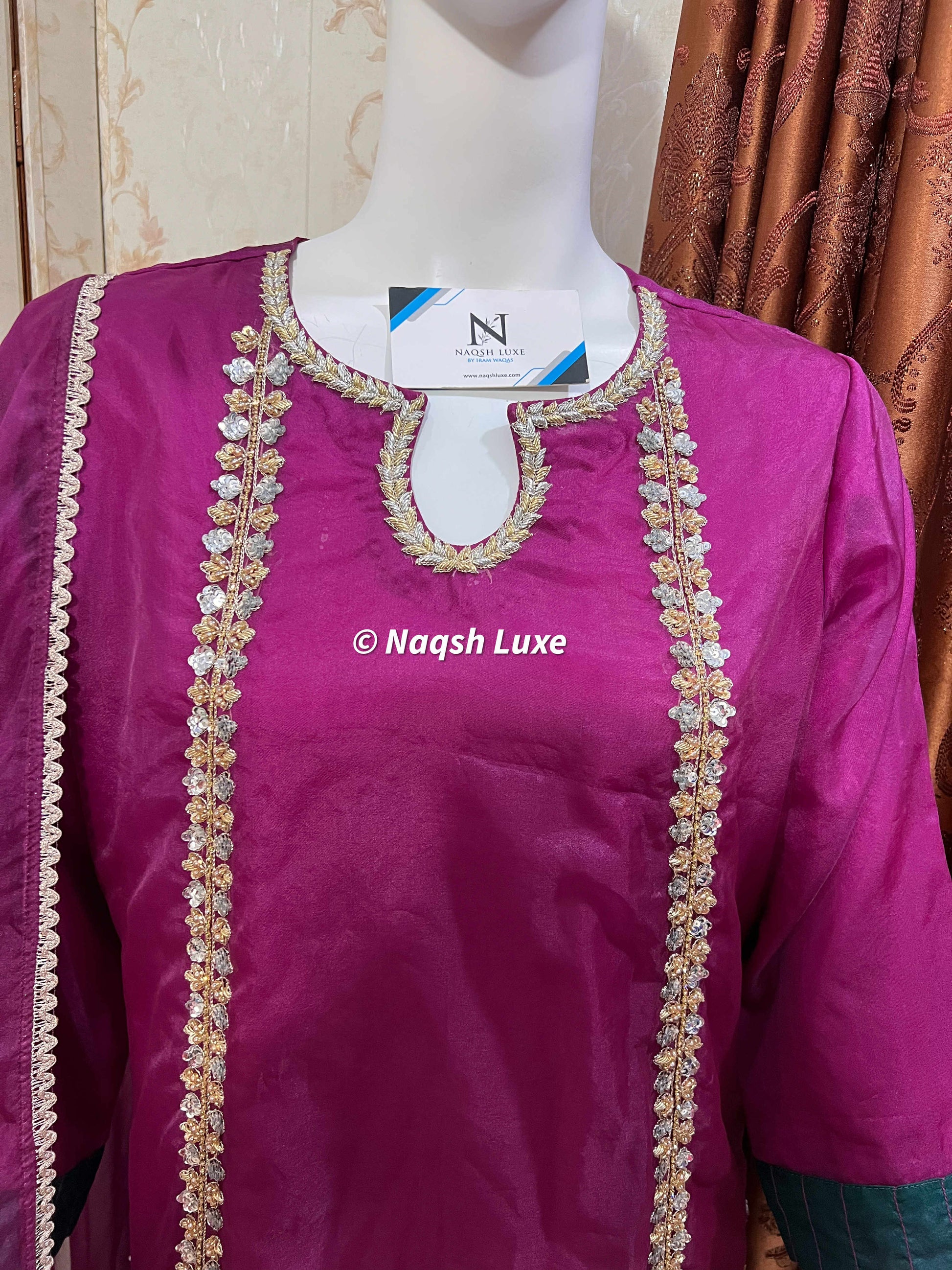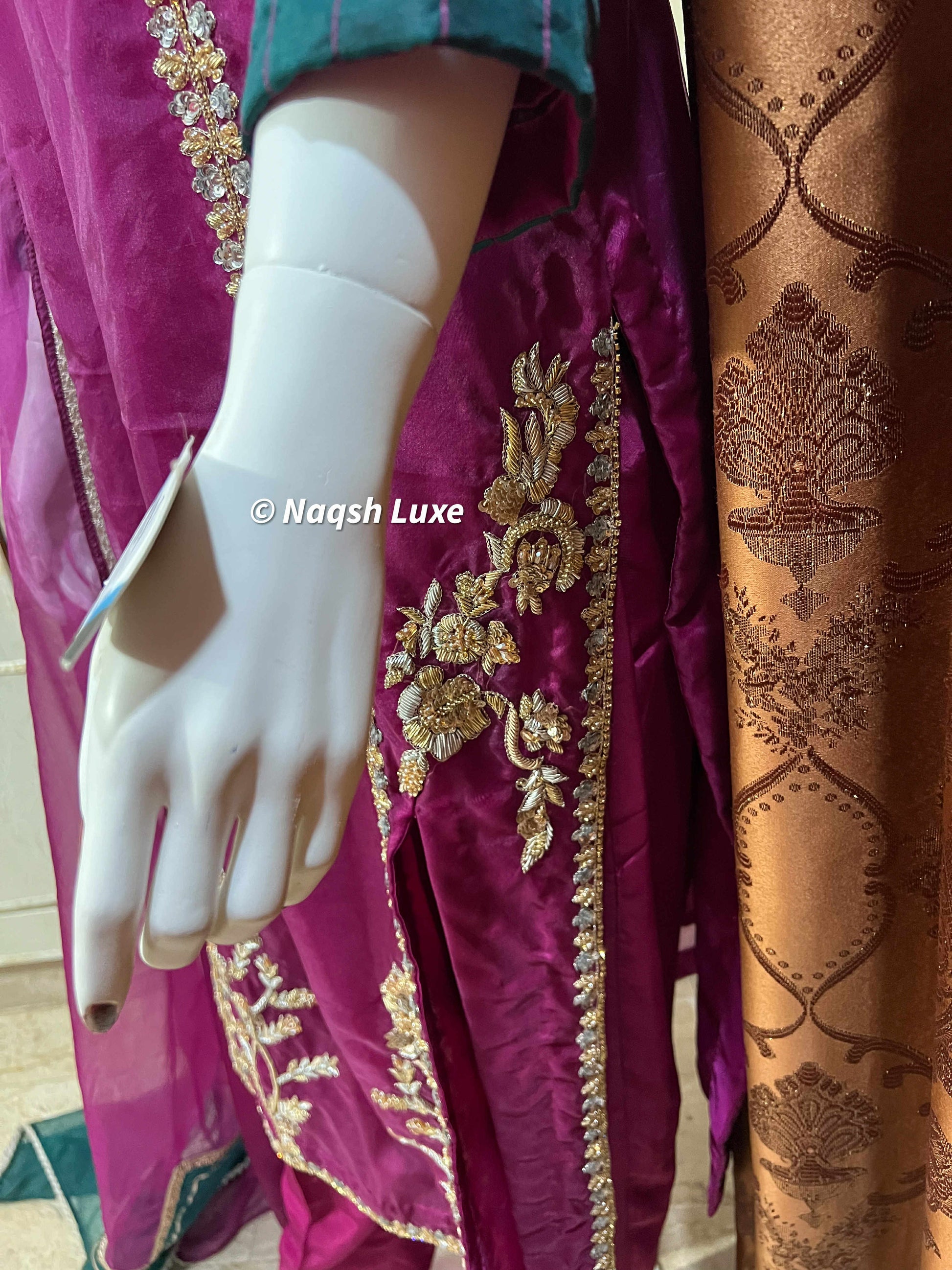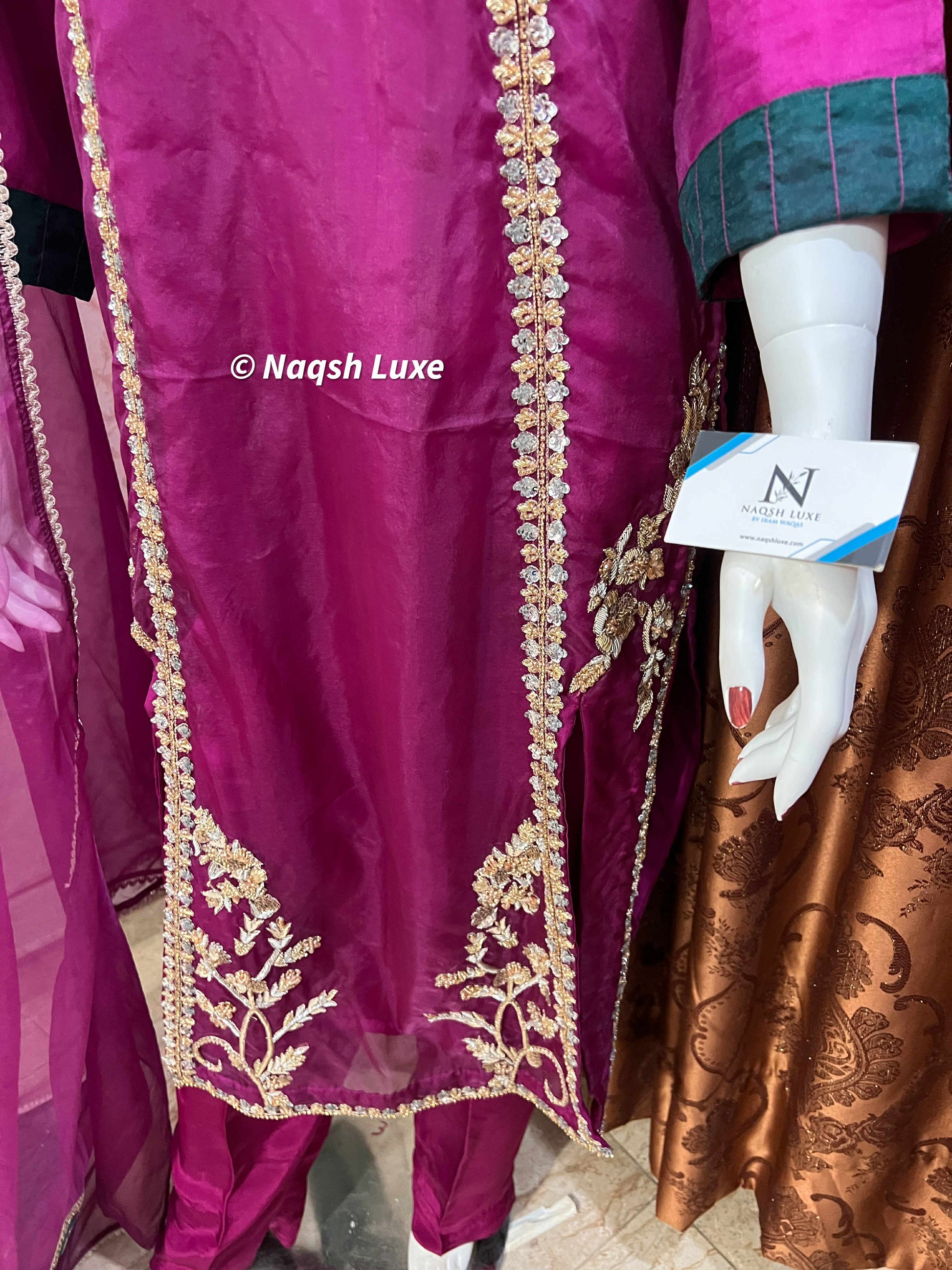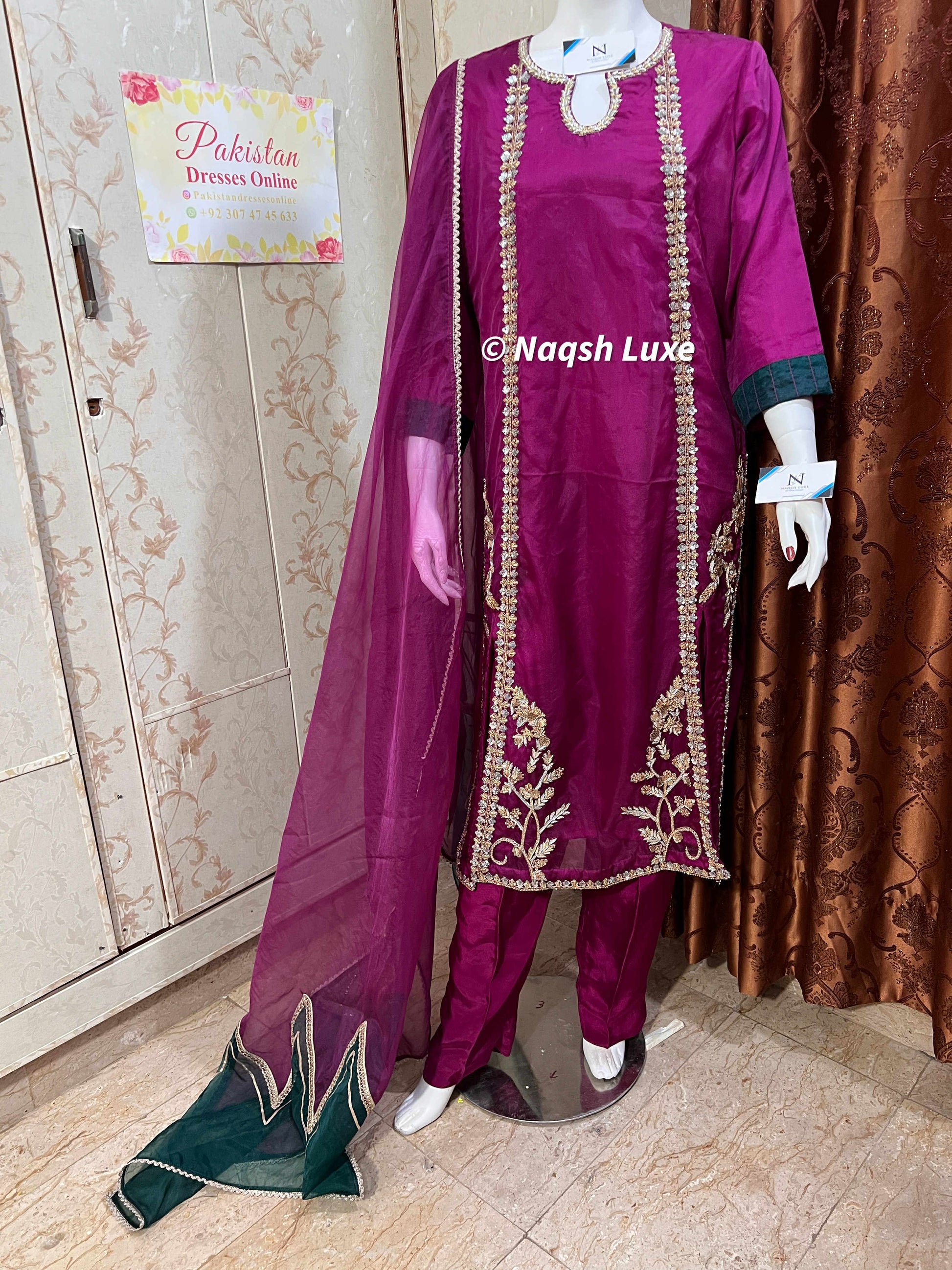 ‘The Pakistani dress is beautifully handcrafted with zari, kora, dabka, stones, pearls and sequins. All the embellishments are handsewn with double thread.