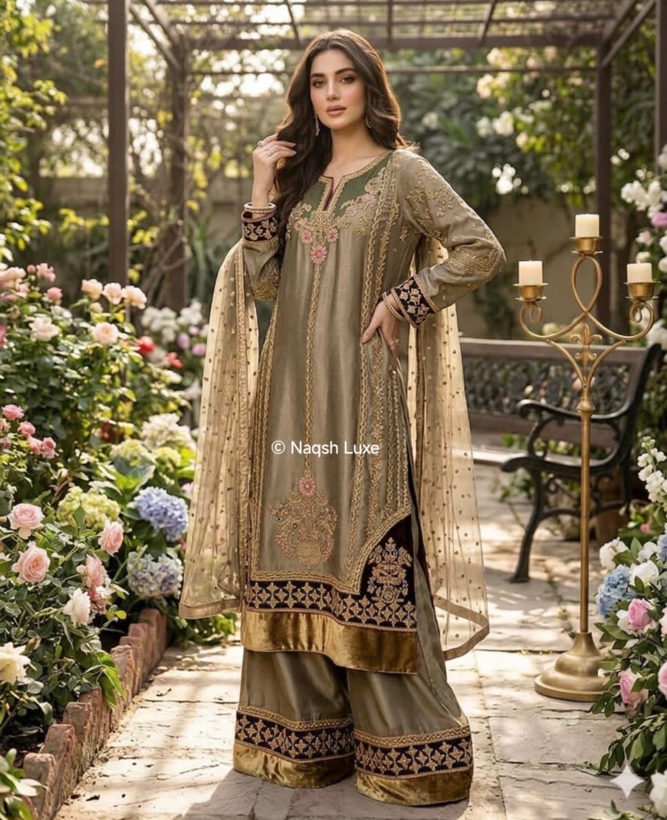 An enchanting olive-toned ensemble adorned with intricate hand embroidery, delicate floral accents, and regal borders that echo timeless craftsmanship. Gracefully tailored with a flowing dupatta and luxurious detailing, this design embodies quiet opulence and sophisticated charm - perfect for moments that deserve understated grandeur.