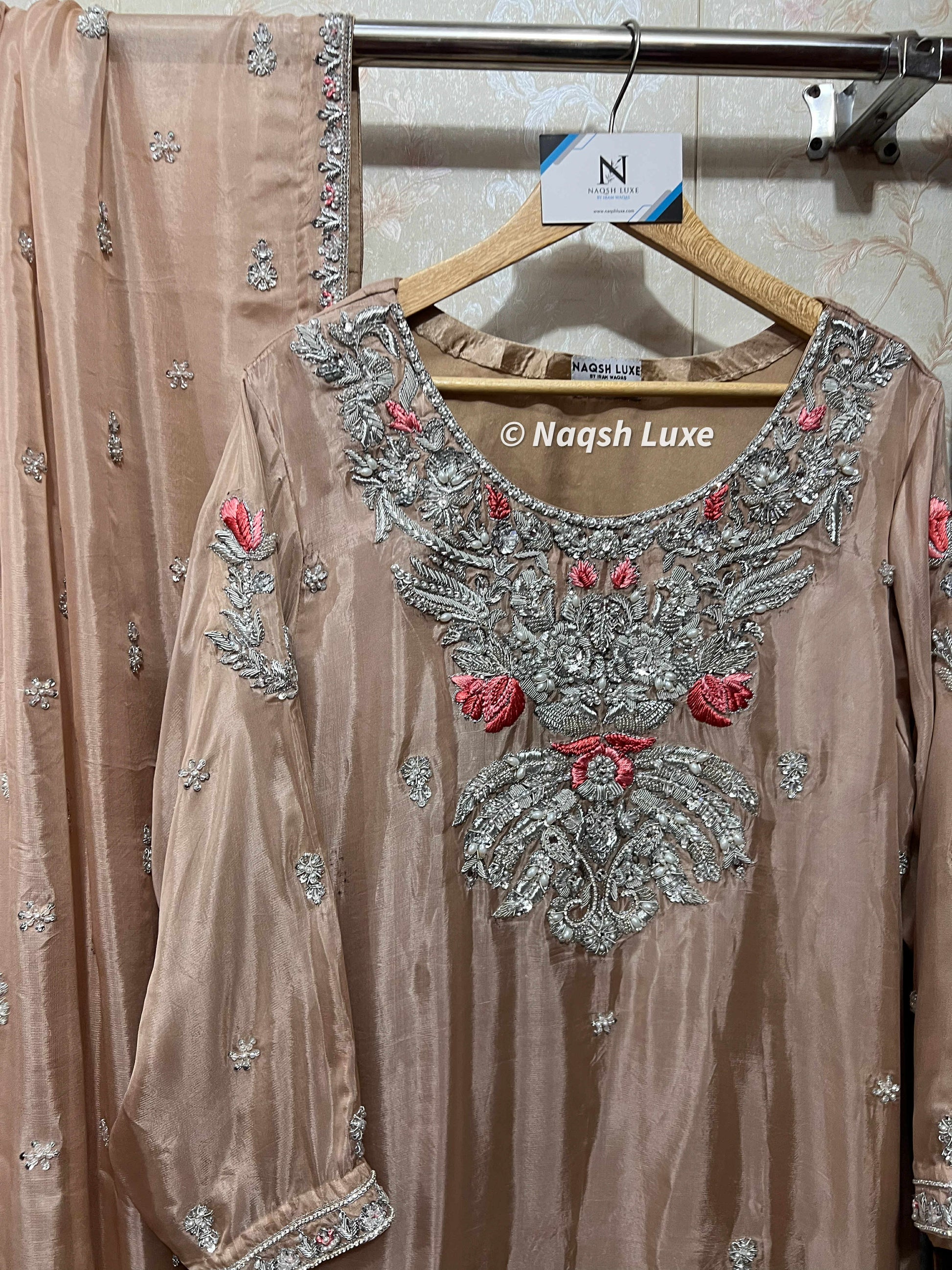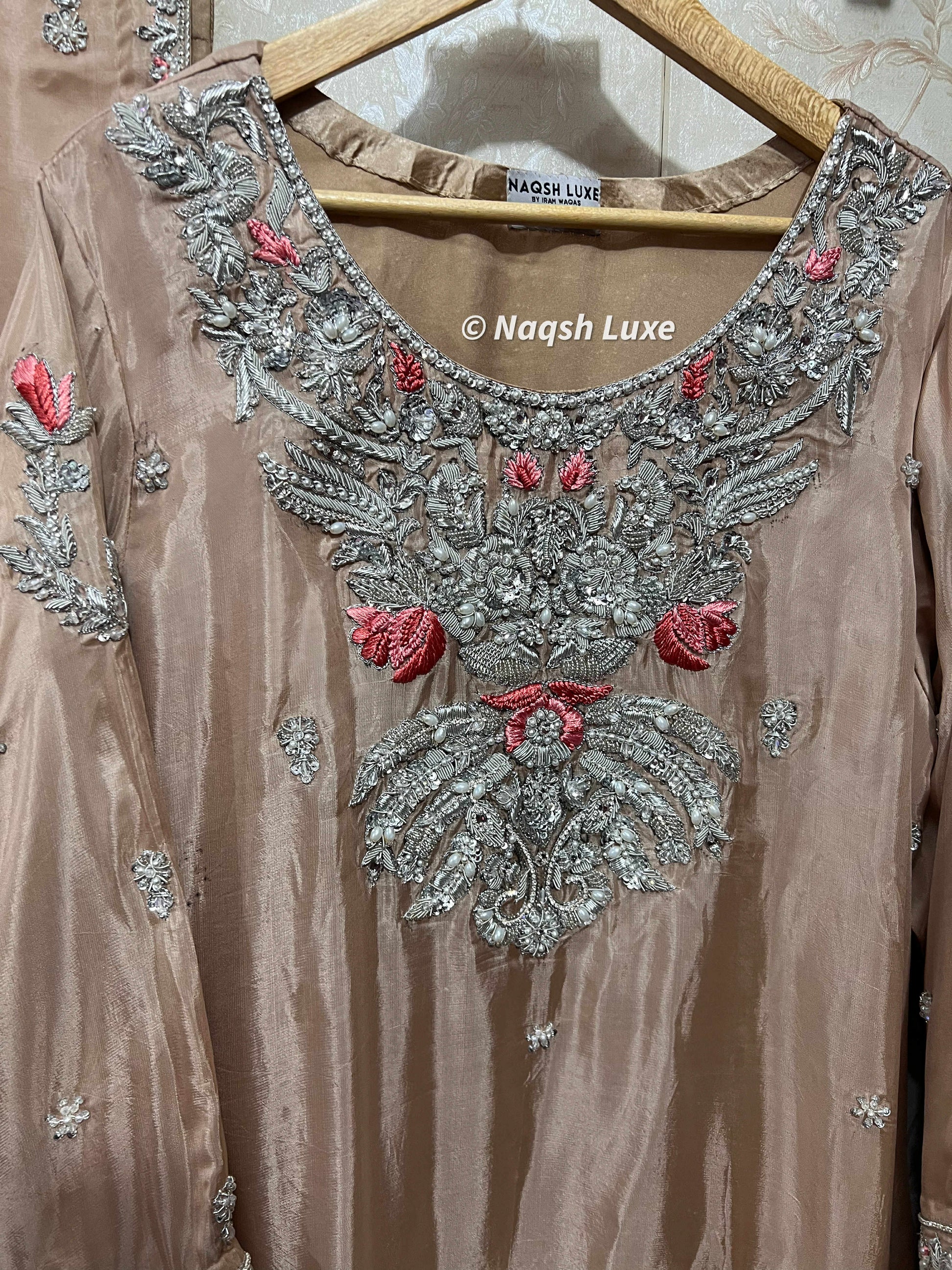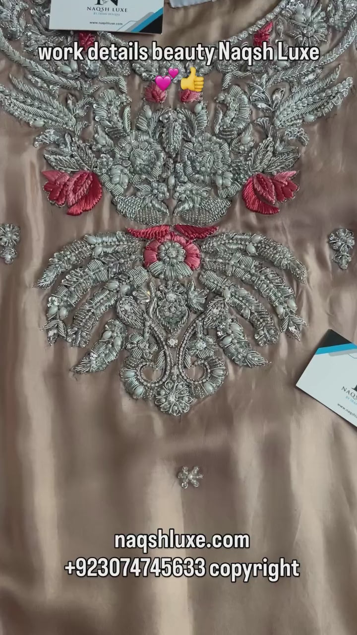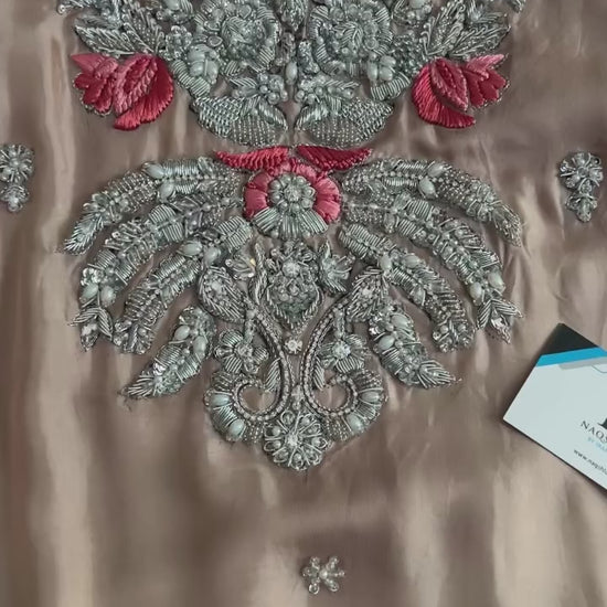 ‘The Pakistani dress is beautifully handcrafted with zari, kora, dabka, stones, pearls and sequins. All the embellishments are handsewn with double thread.