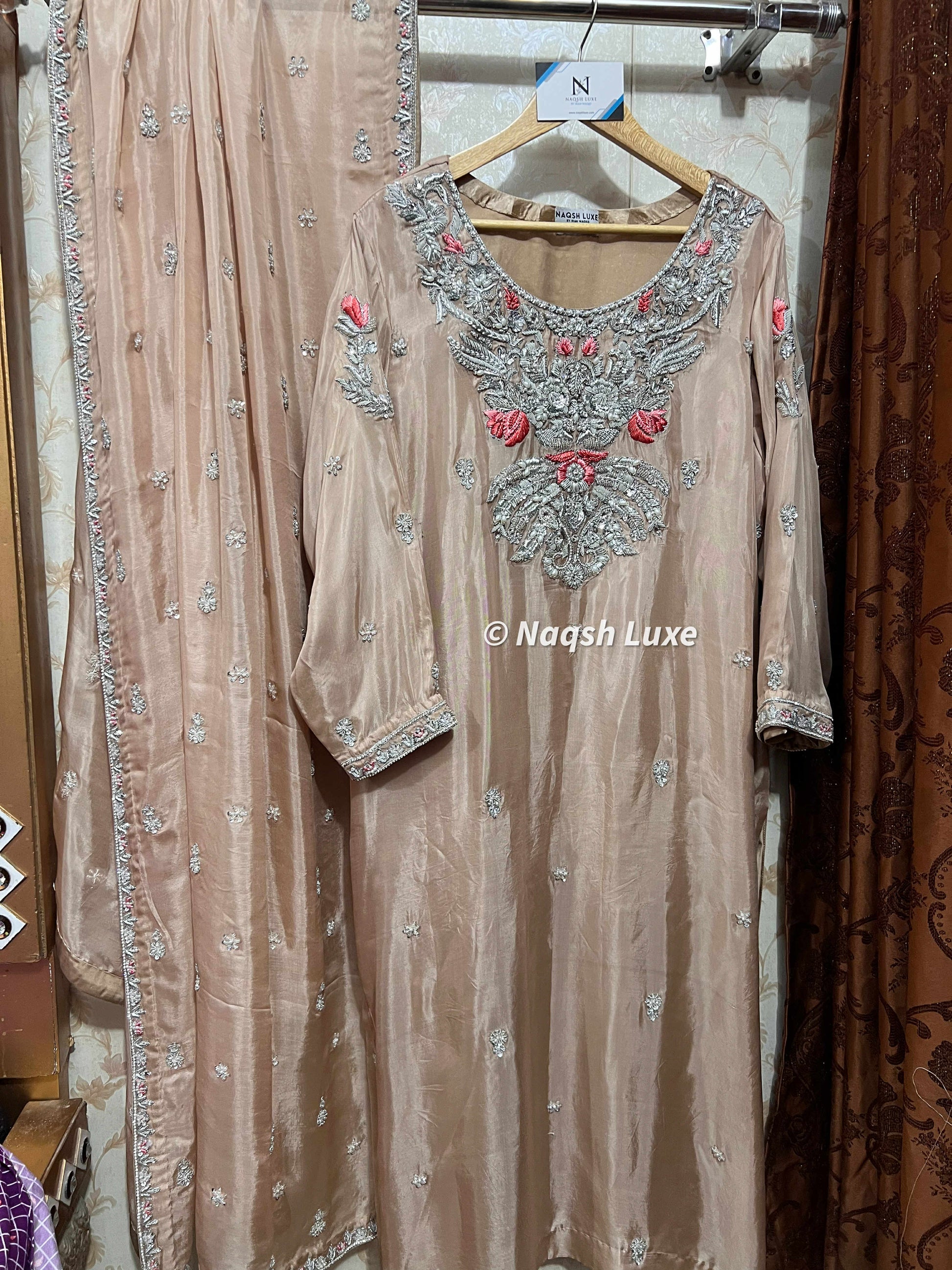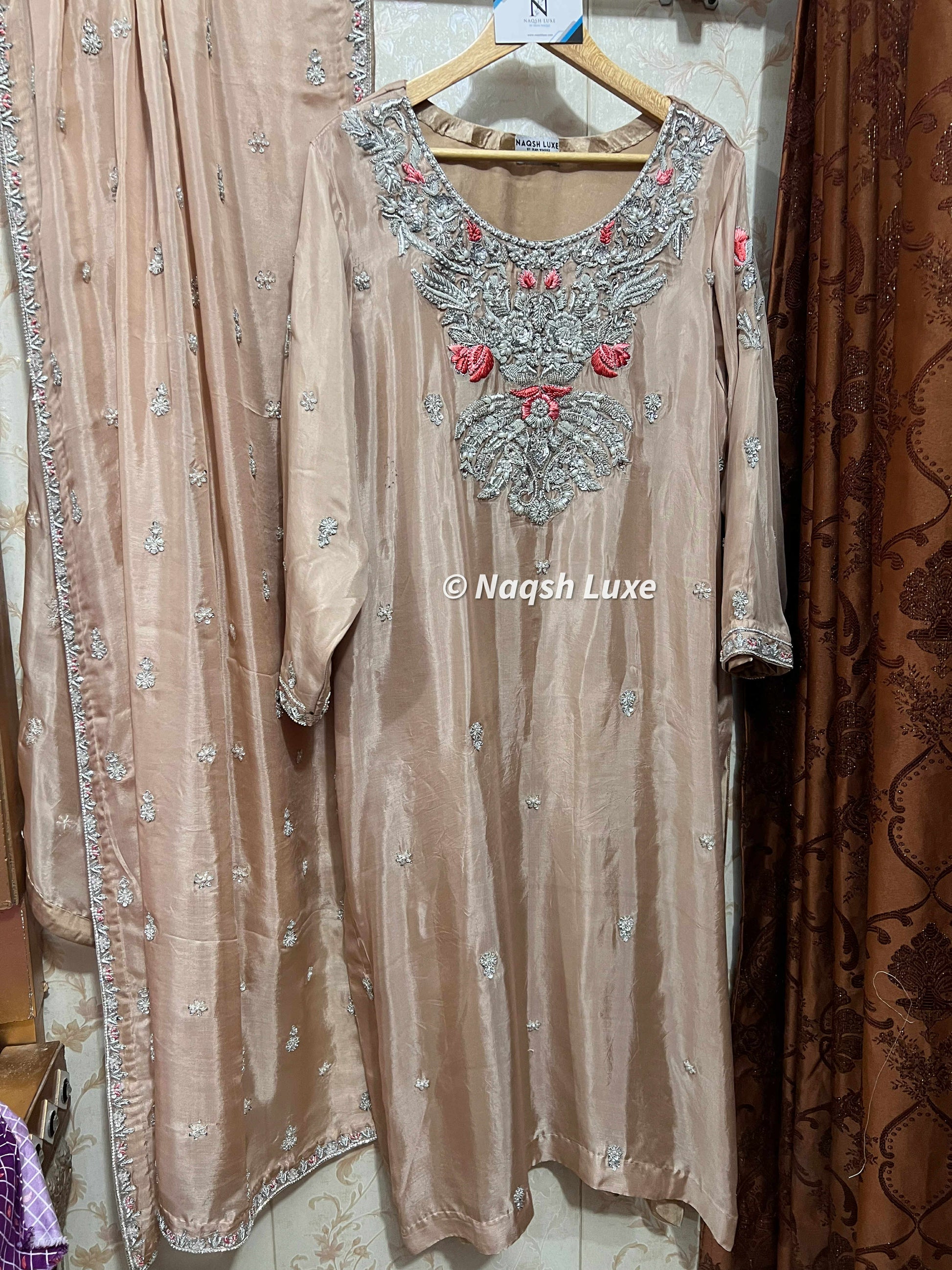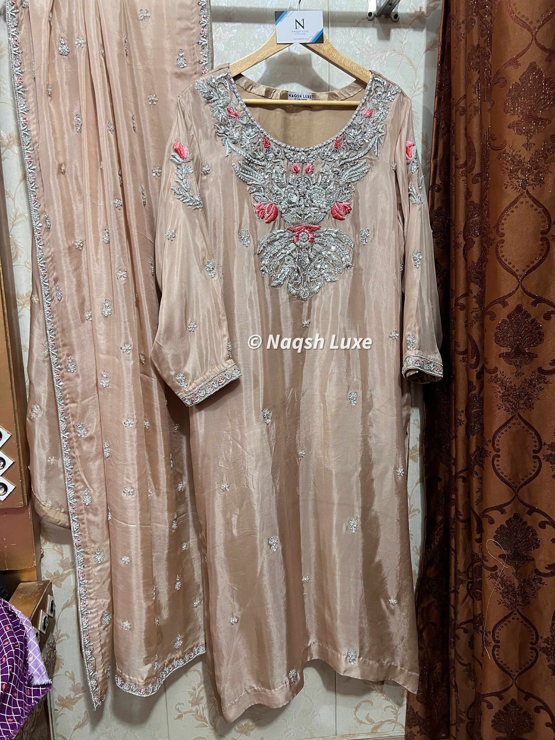‘The Pakistani dress is beautifully handcrafted with zari, kora, dabka, stones, pearls and sequins. All the embellishments are handsewn with double thread.
