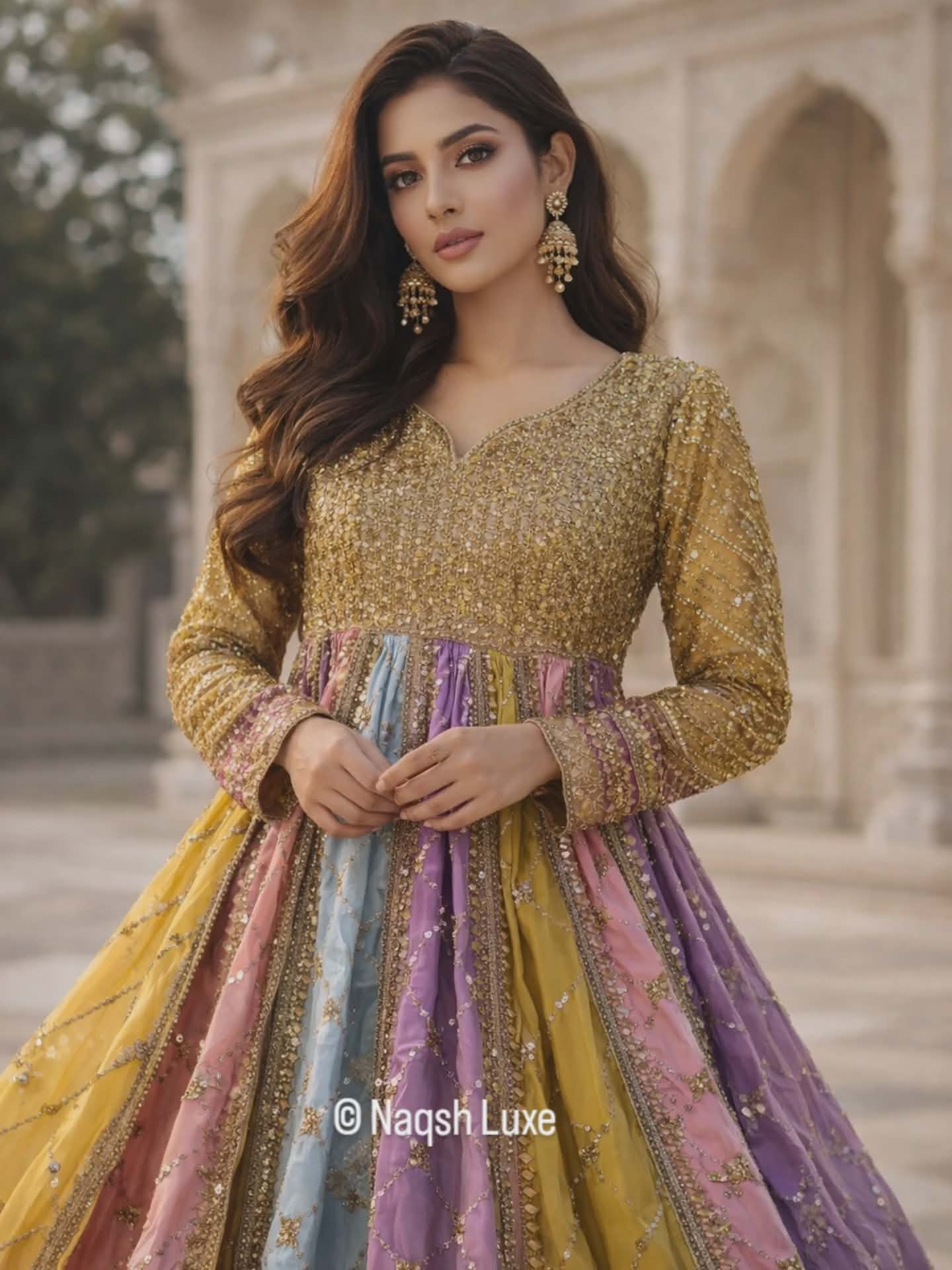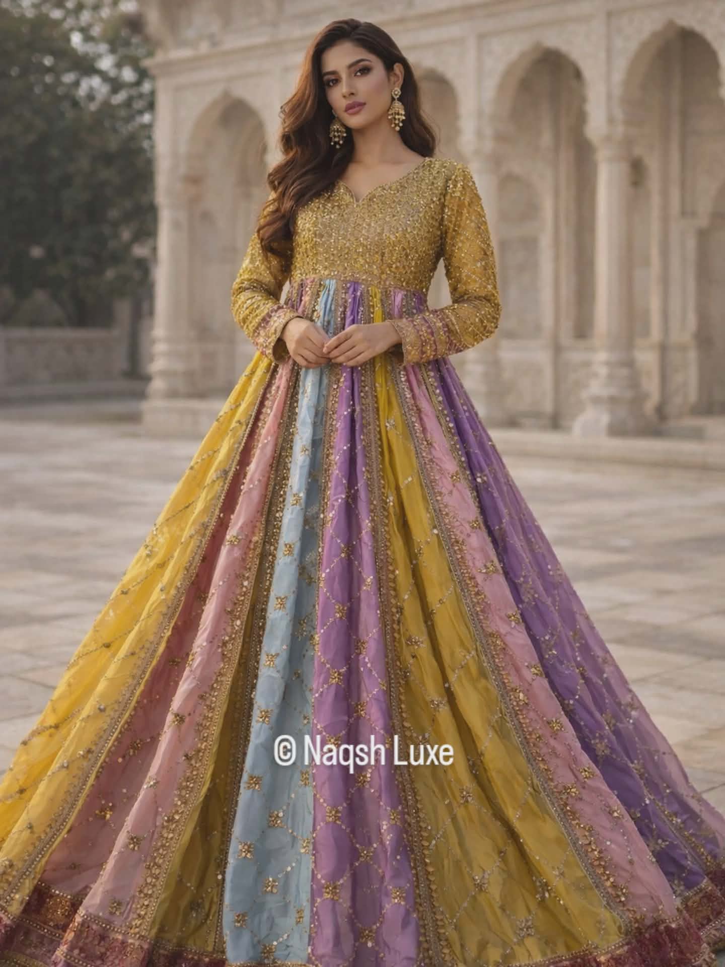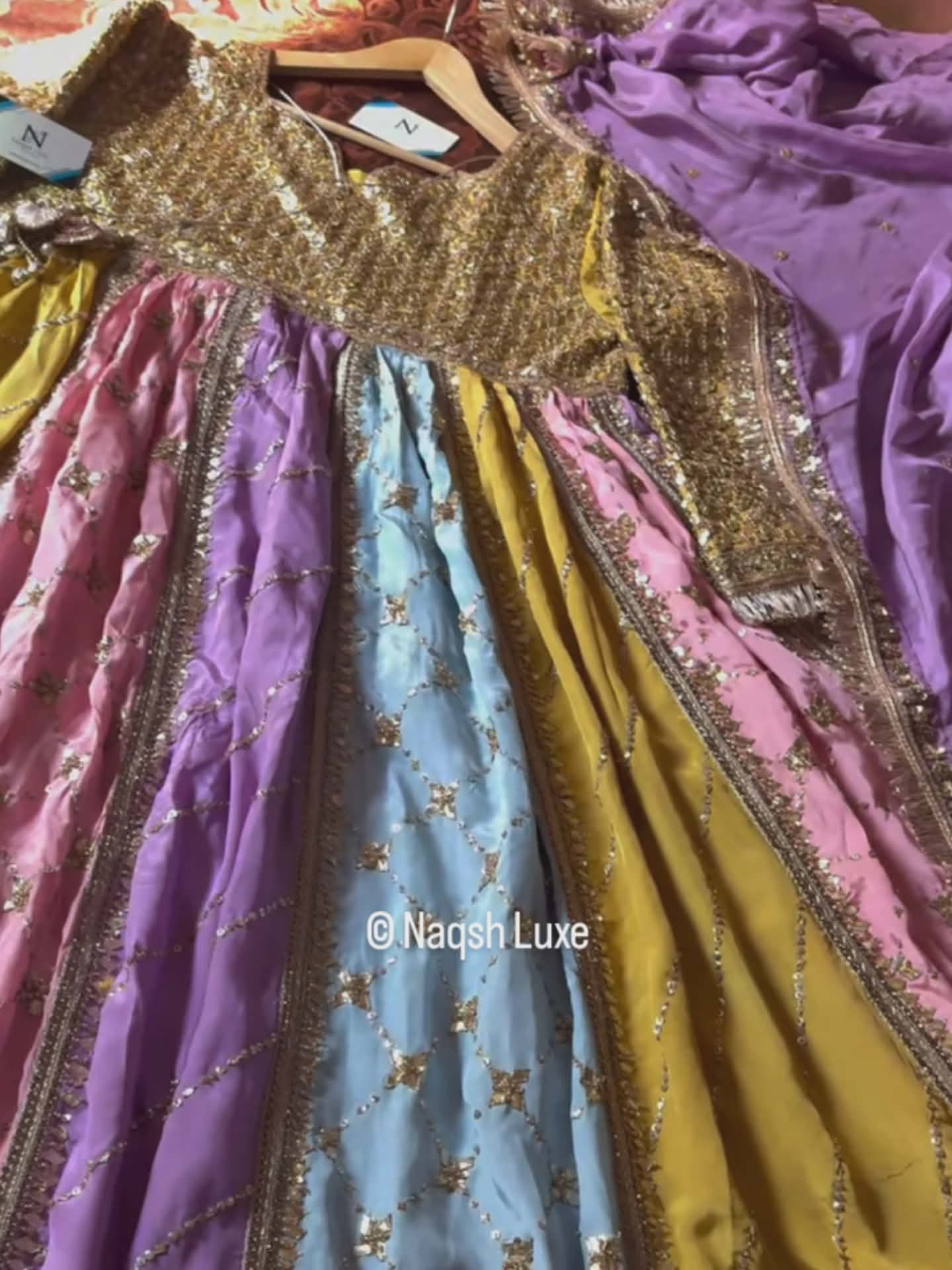 Materials Used: Dabka, zardozi, kora, sequins, crystals, pearls, tilla, stones.