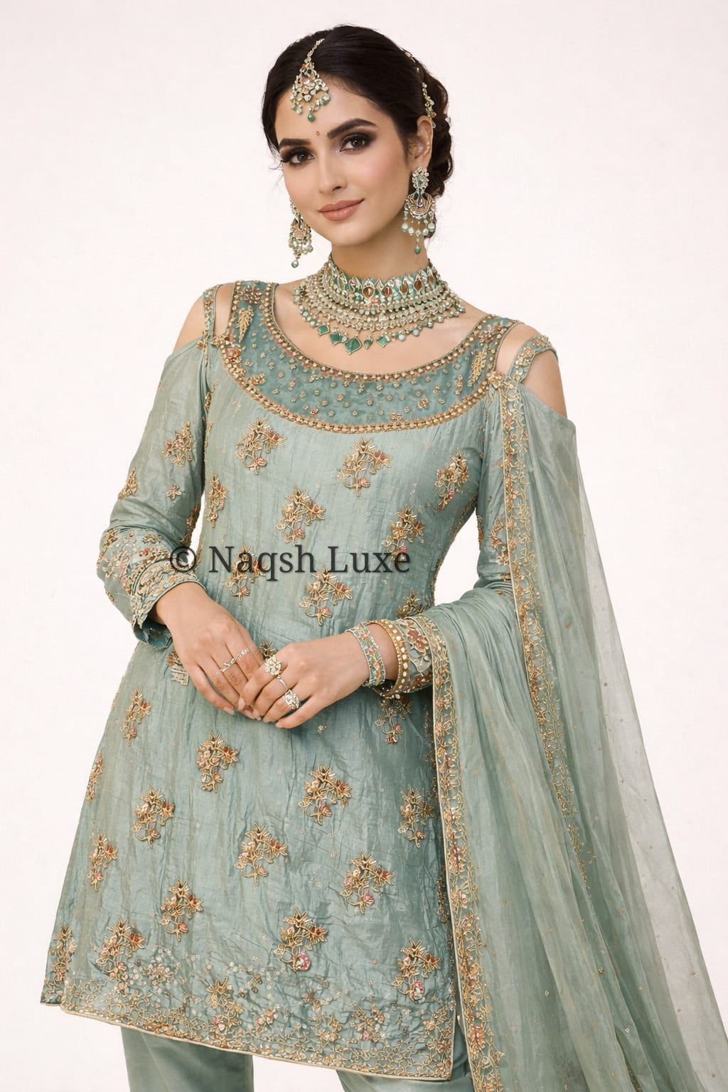 The Pakistani Dress is beautifully handcrafted with zari, kora, dabka, stones, pearls and sequins. All the embellishments are handsewn with double thread.
