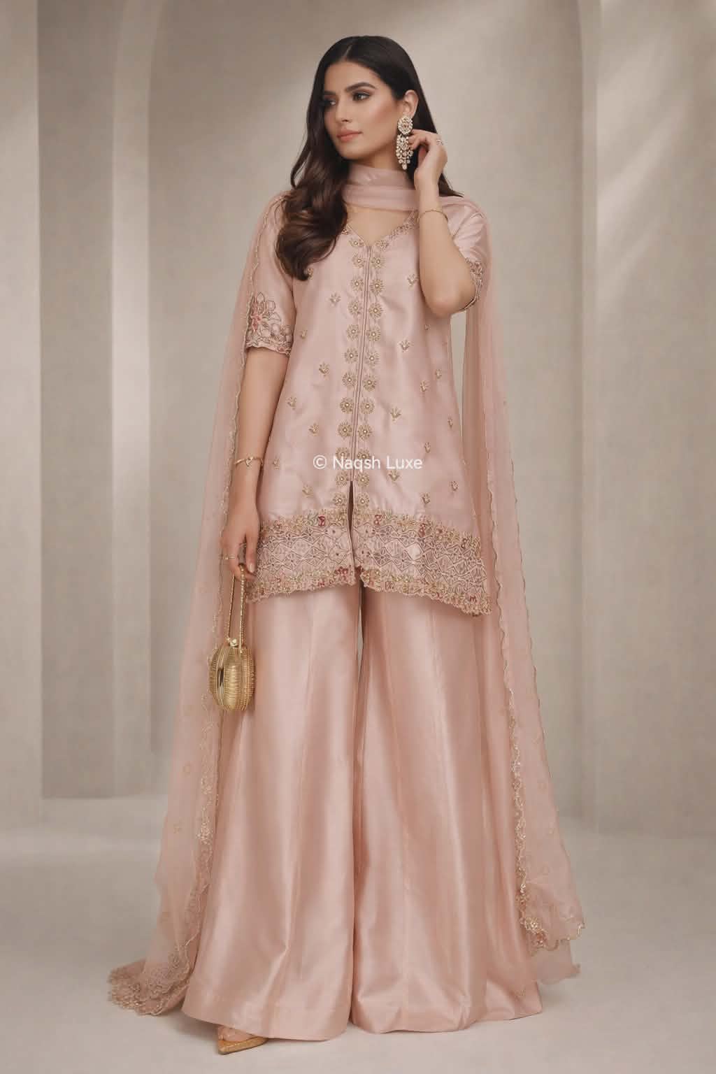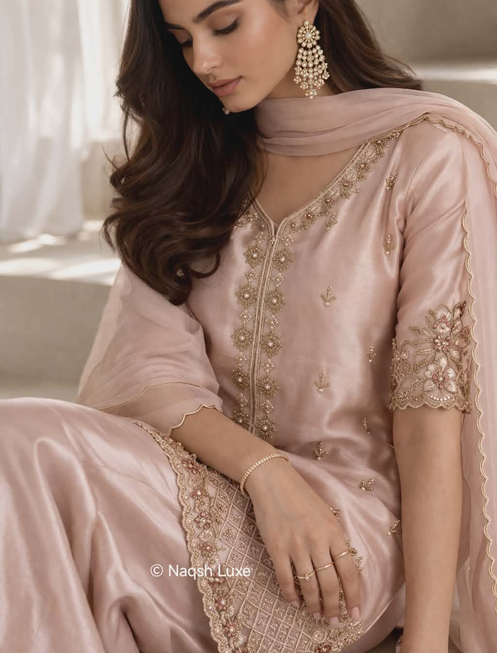A poetic expression of powder blush elegance, adorned with intricate dabka craftsmanship and a fluid silhouette. Finished with a delicately scalloped dupatta, Avelisse Blush embodies modern luxury with timeless grace — a signature statement from Naqsh Luxe.