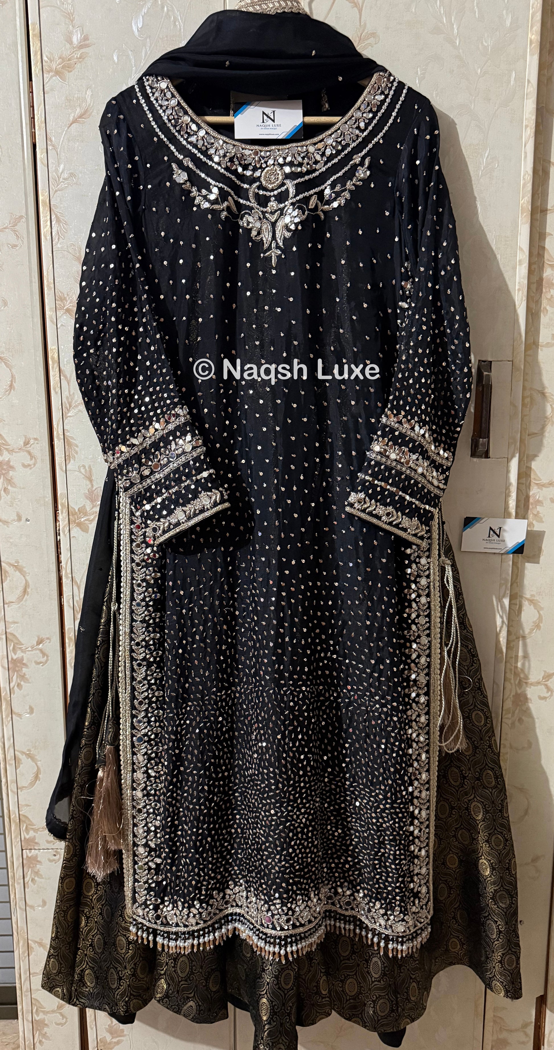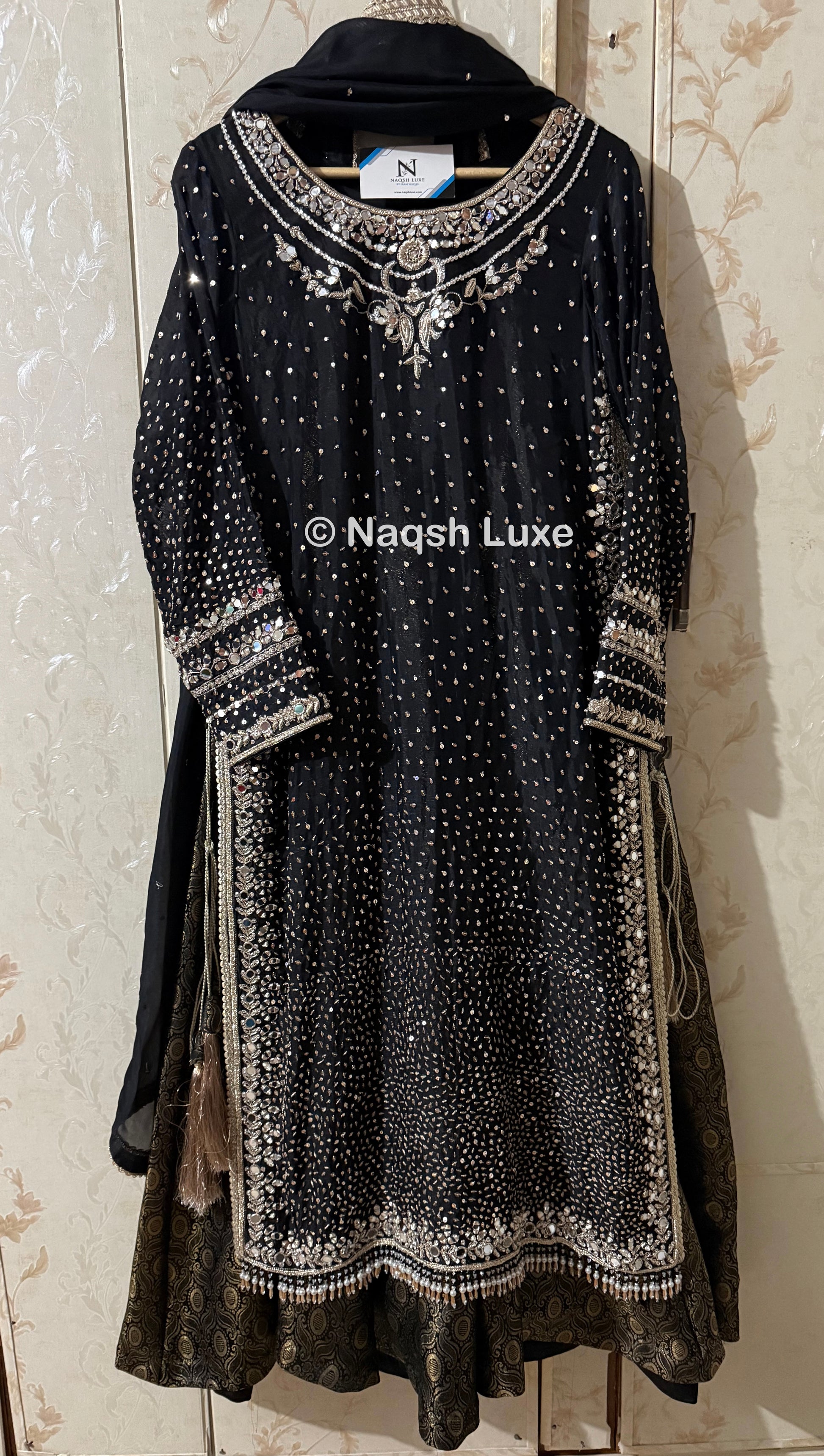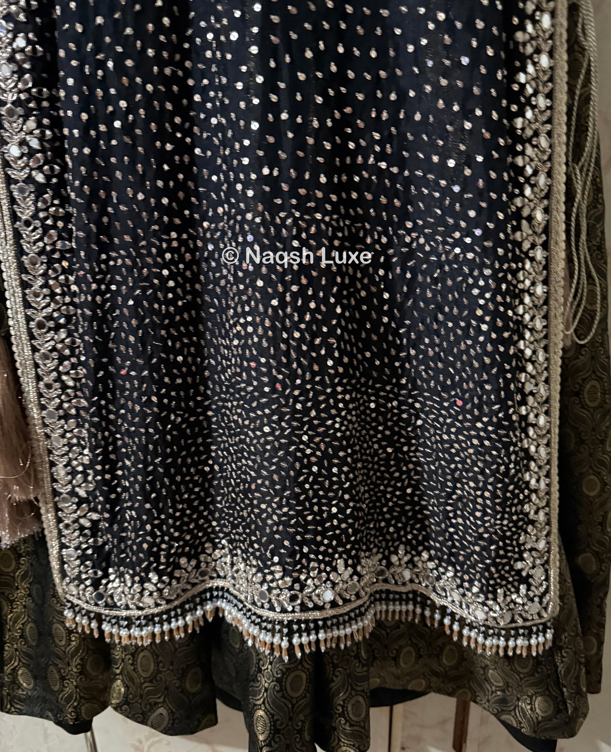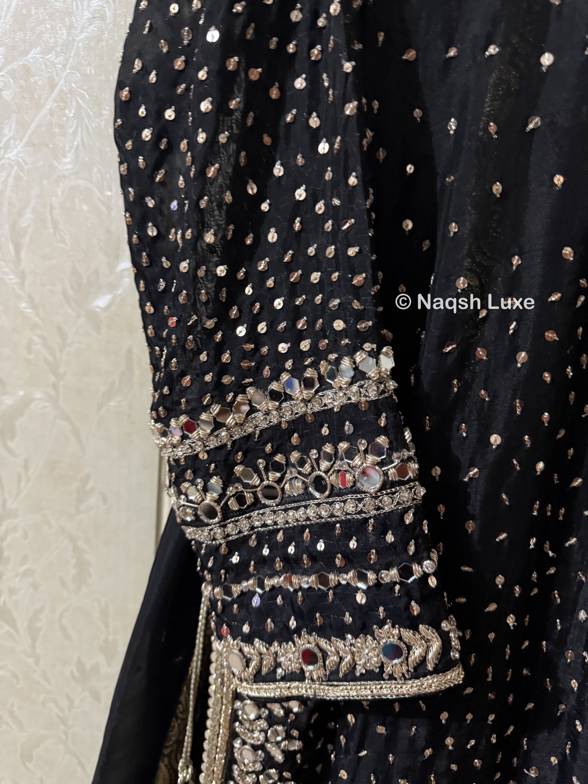 Materials Used: Dabka, zardozi, kora, sequins, crystals, pearls, tilla, stones.