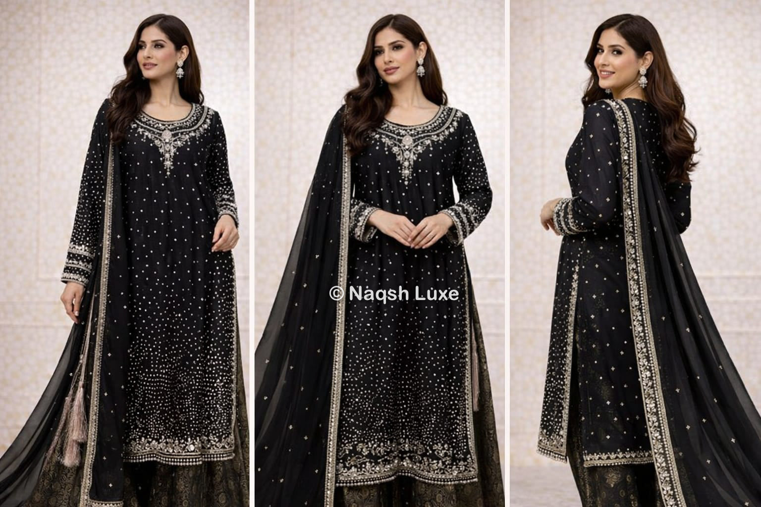The Pakistani dress is beautifully handcrafted with zari, kora, dabka, stones, pearls and sequins. All the embellishments handsewn with double thread.