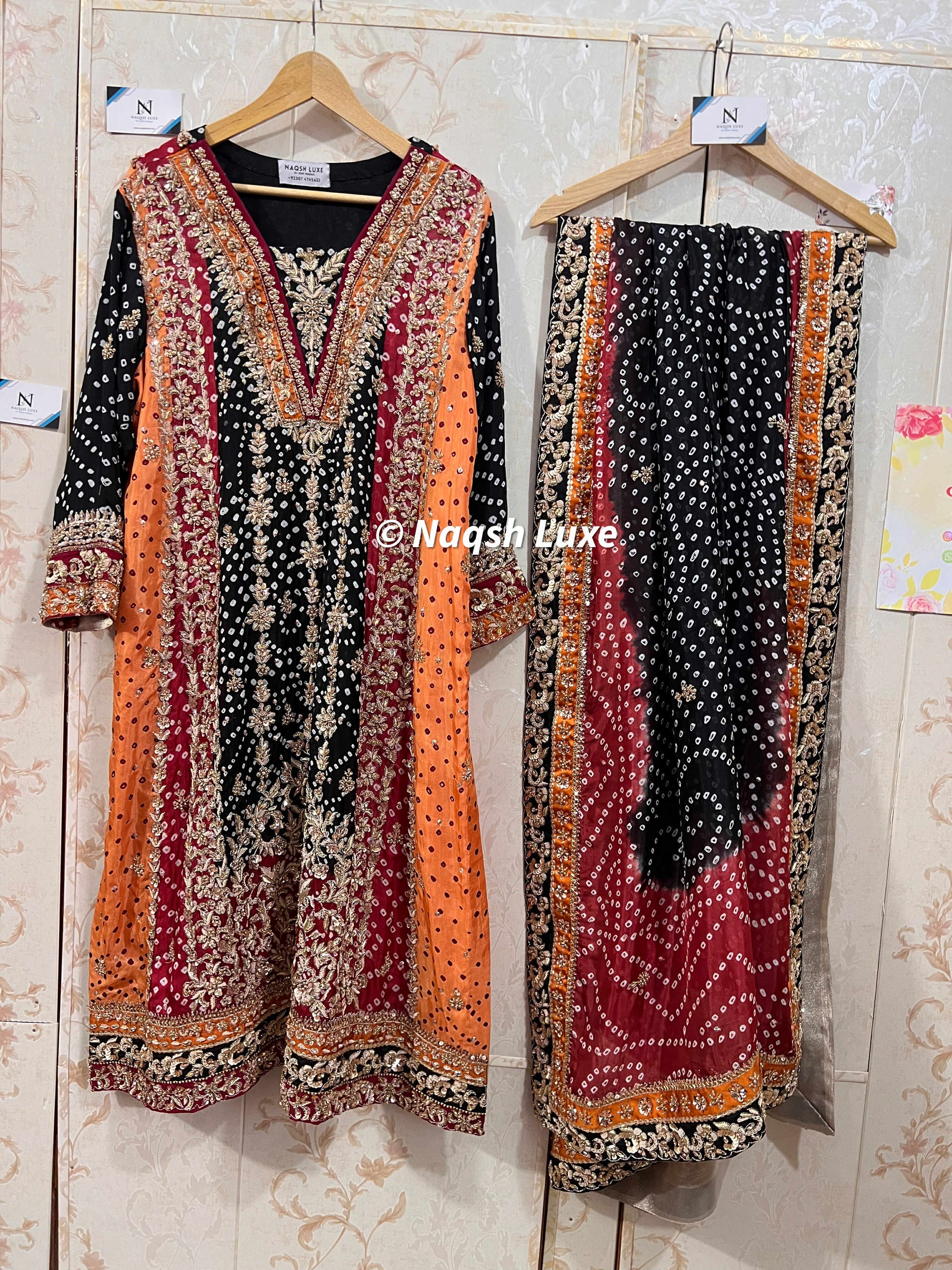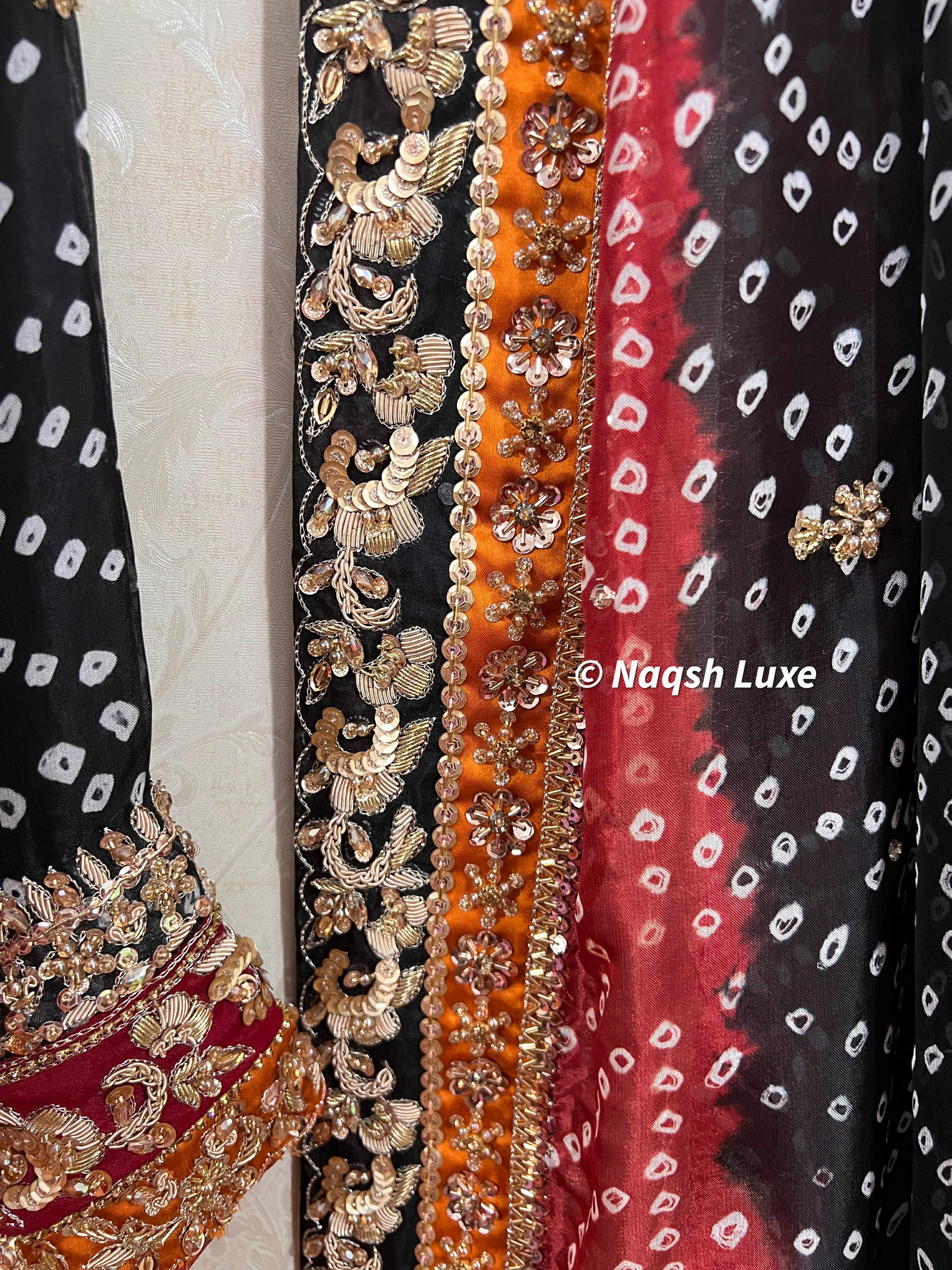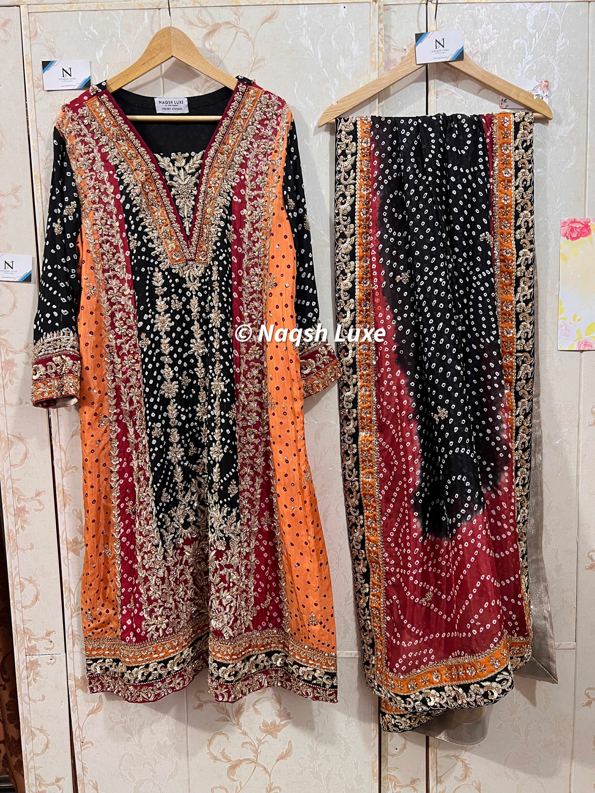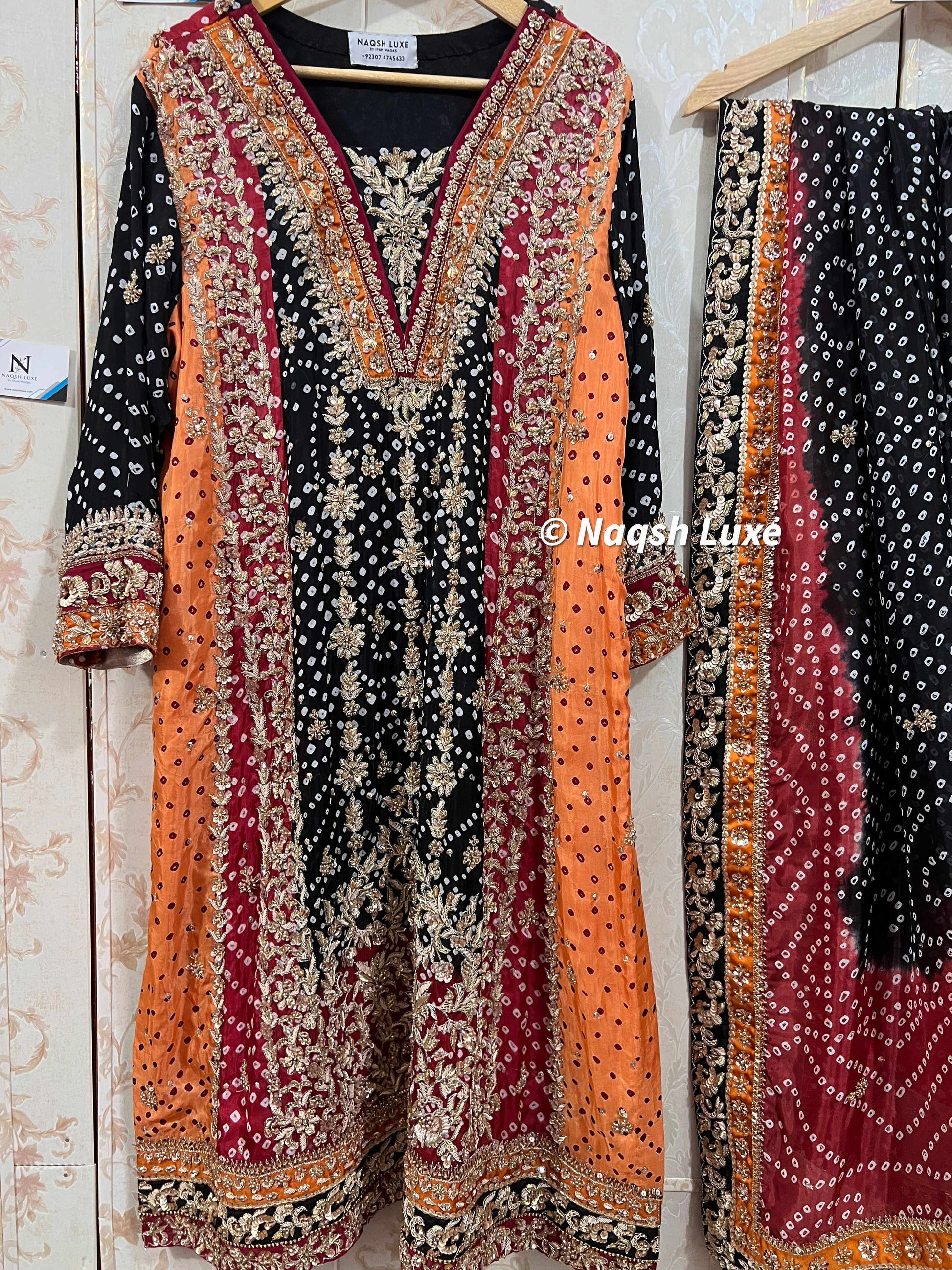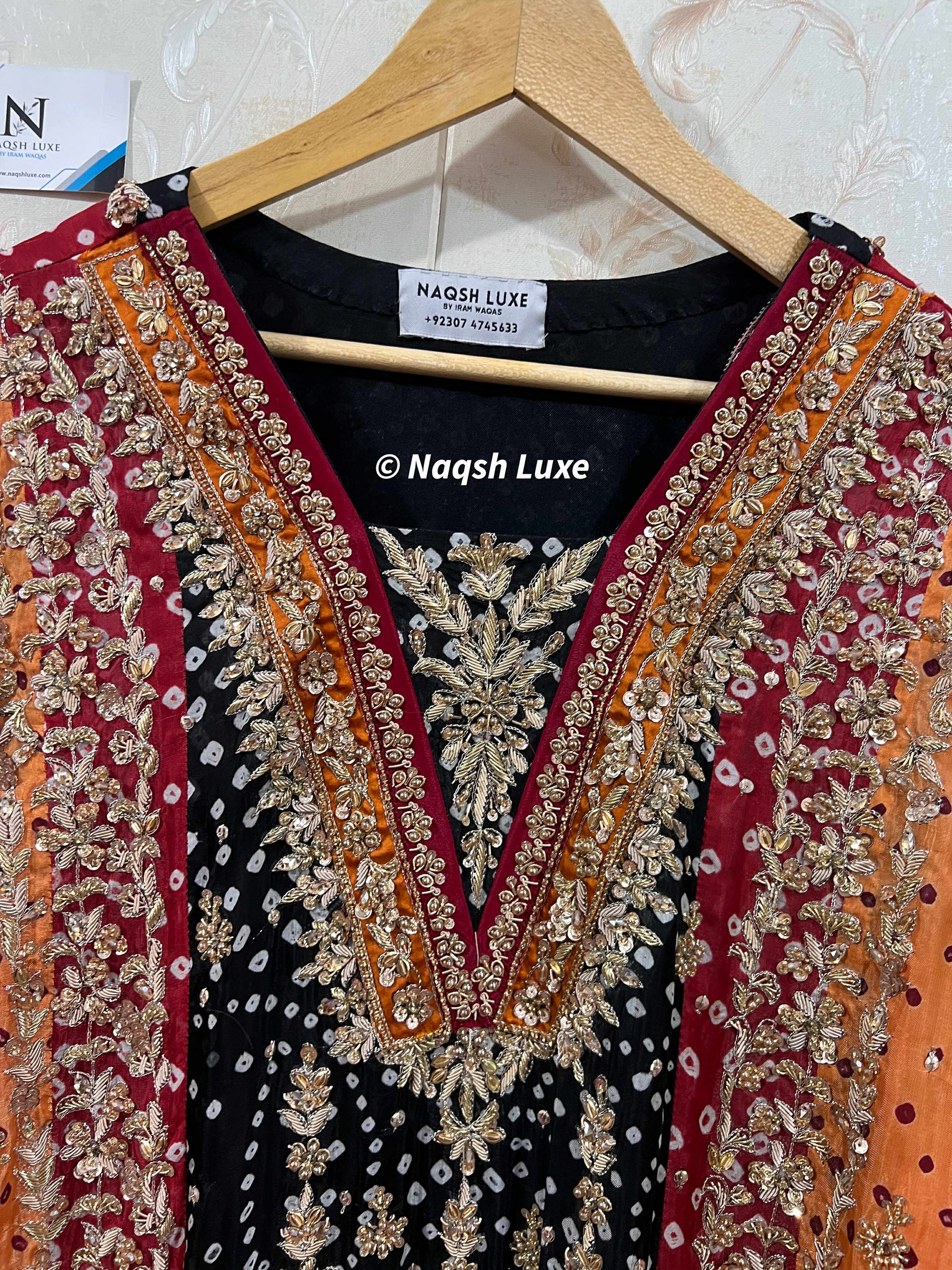 ‘The Pakistani dress is beautifully handcrafted with zari, kora, dabka, stones, pearls and sequins. All the embellishments are handsewn with double thread.