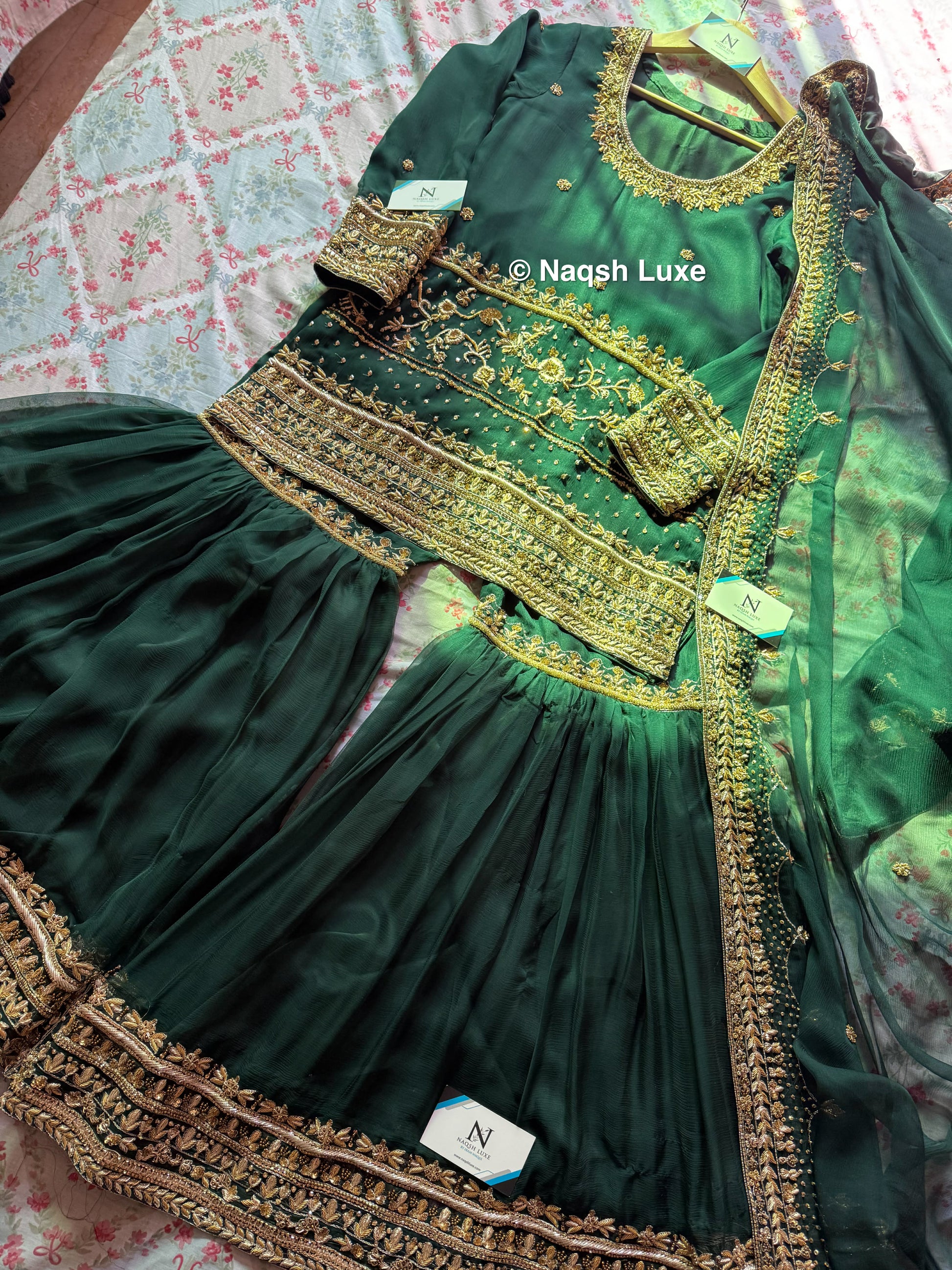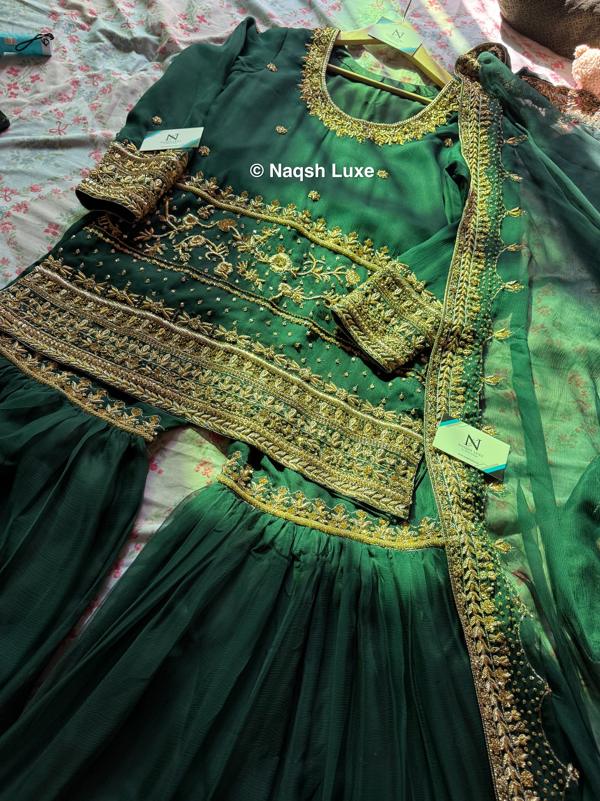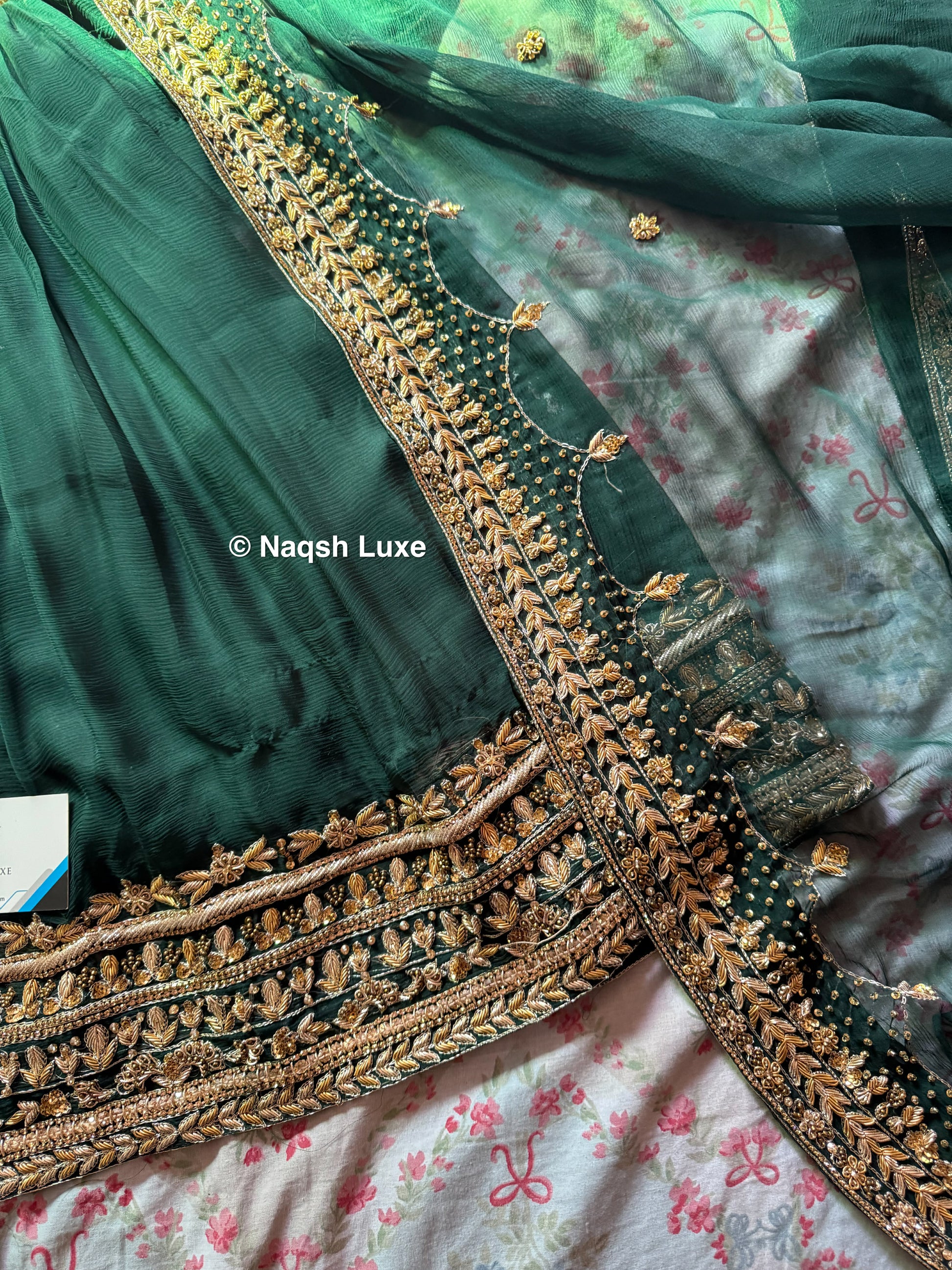 Materials Used: Dabka, zardozi, kora, sequins, crystals, pearls, tilla, stones, resham.