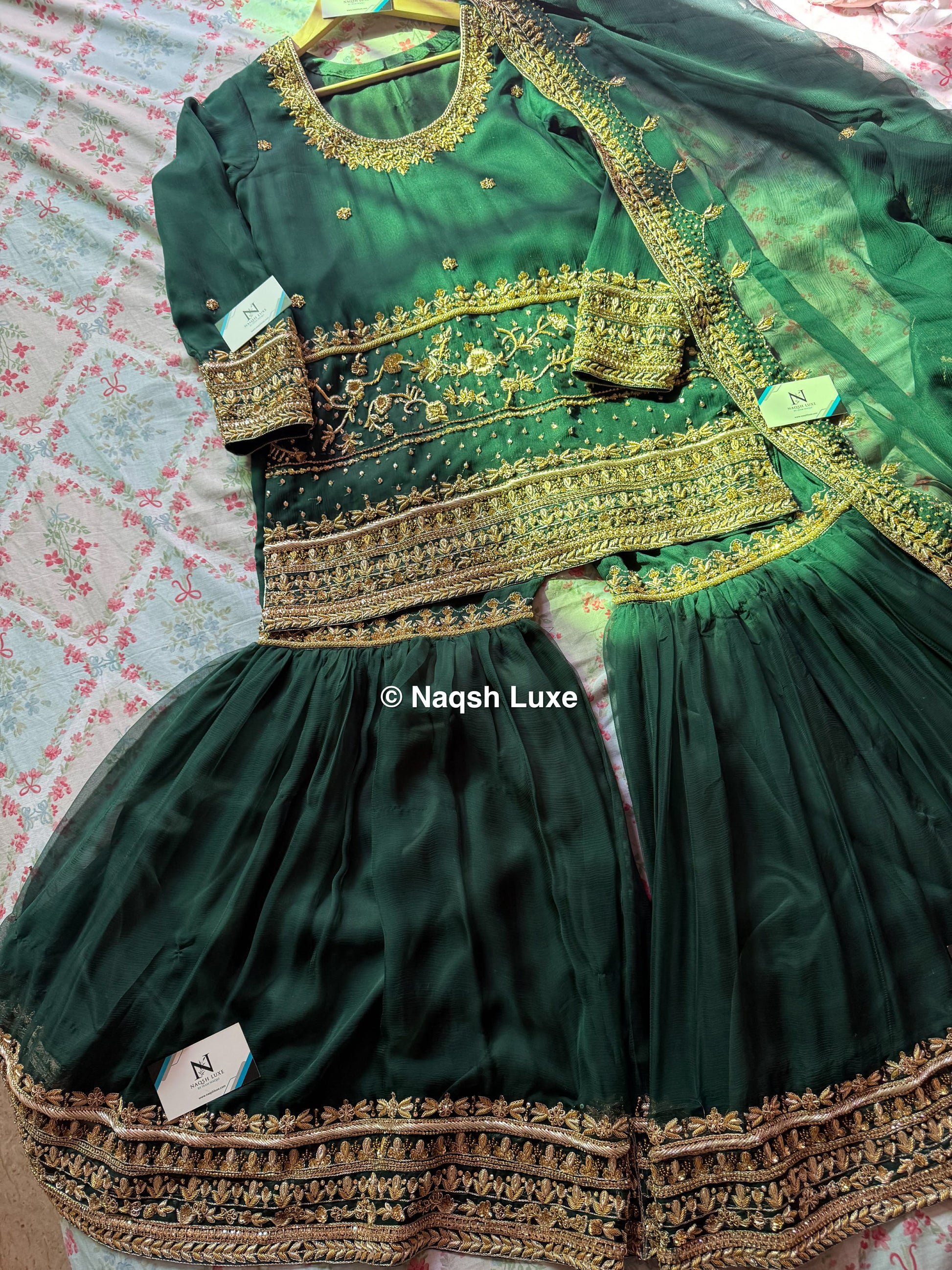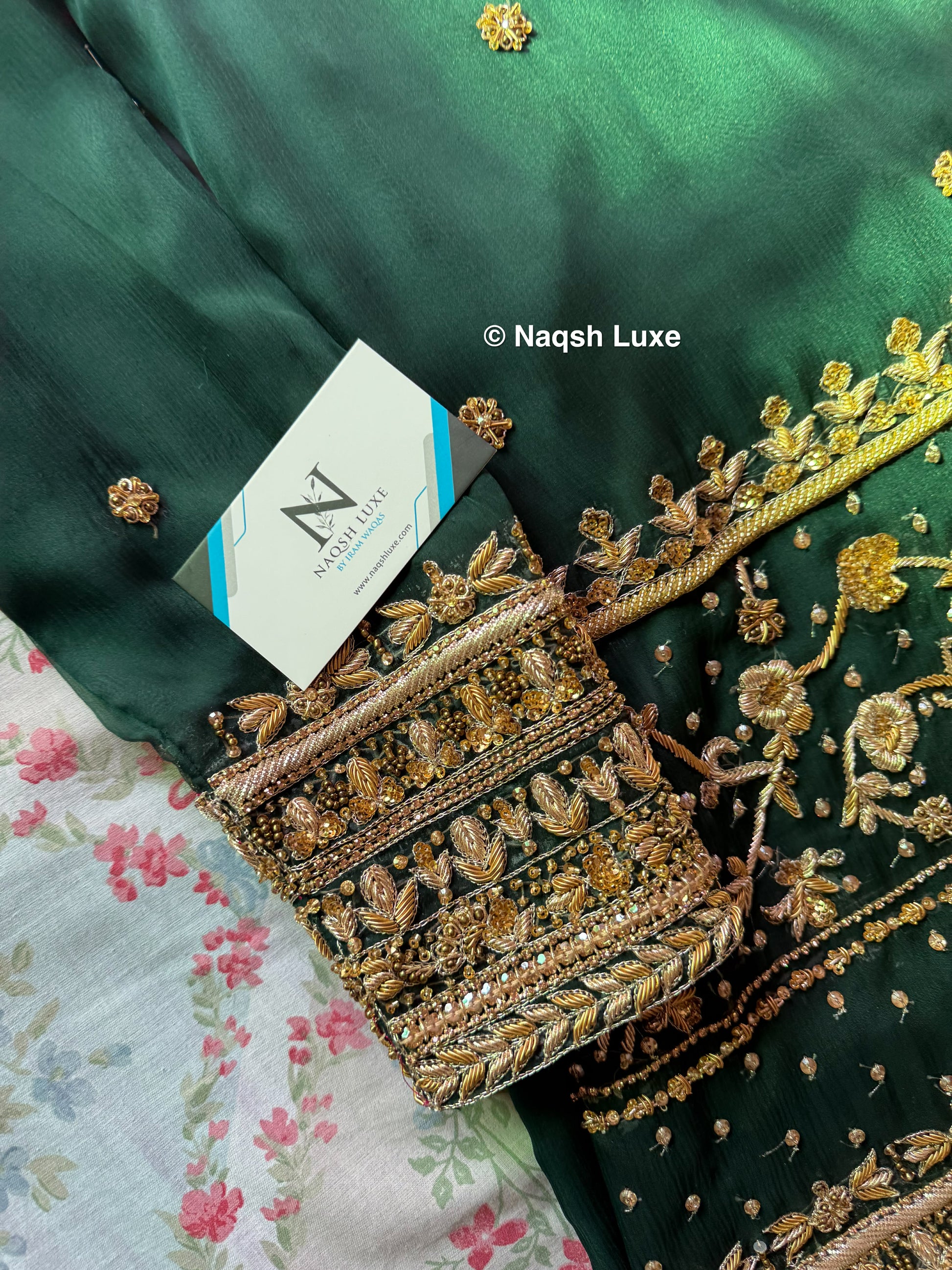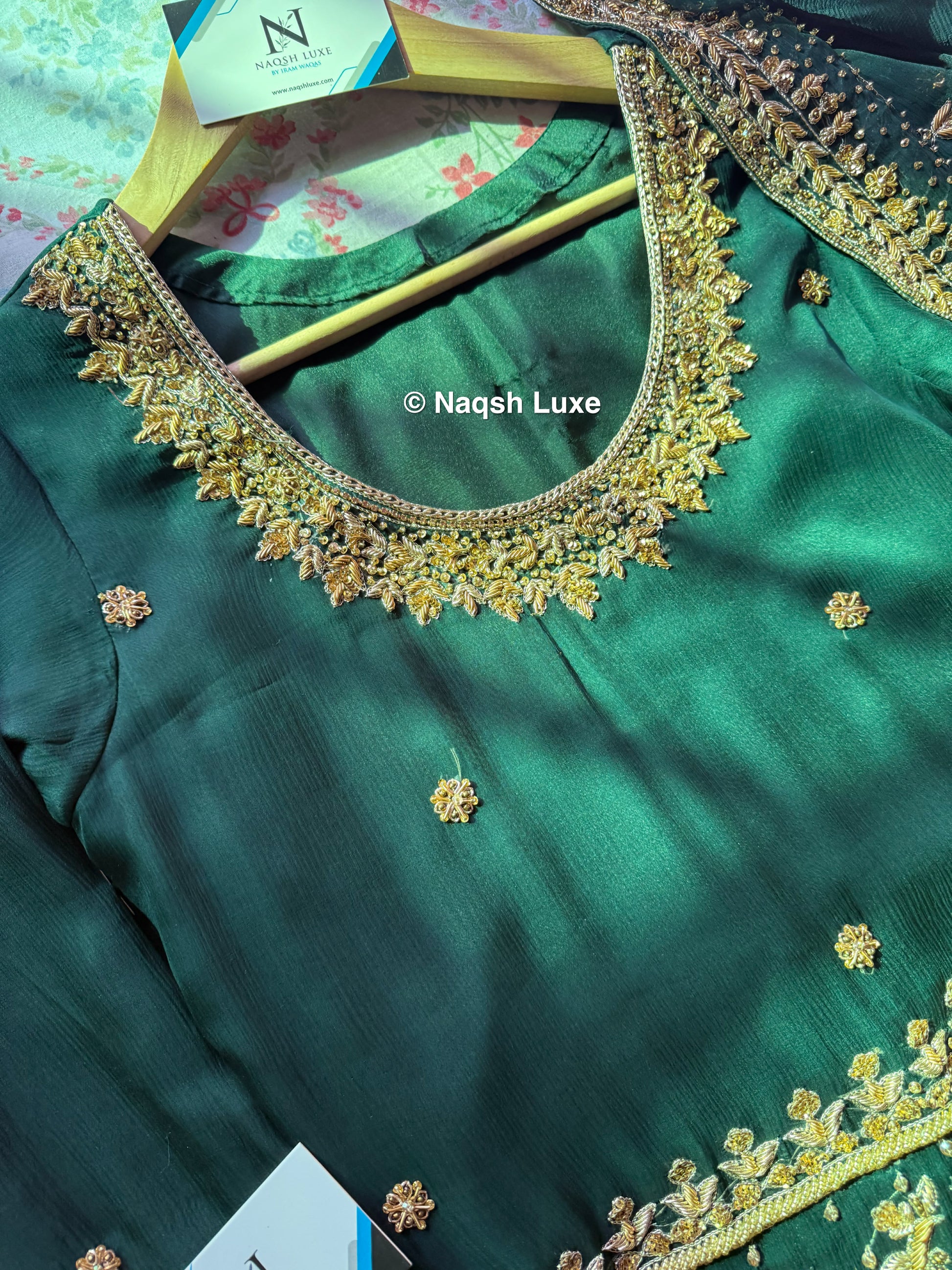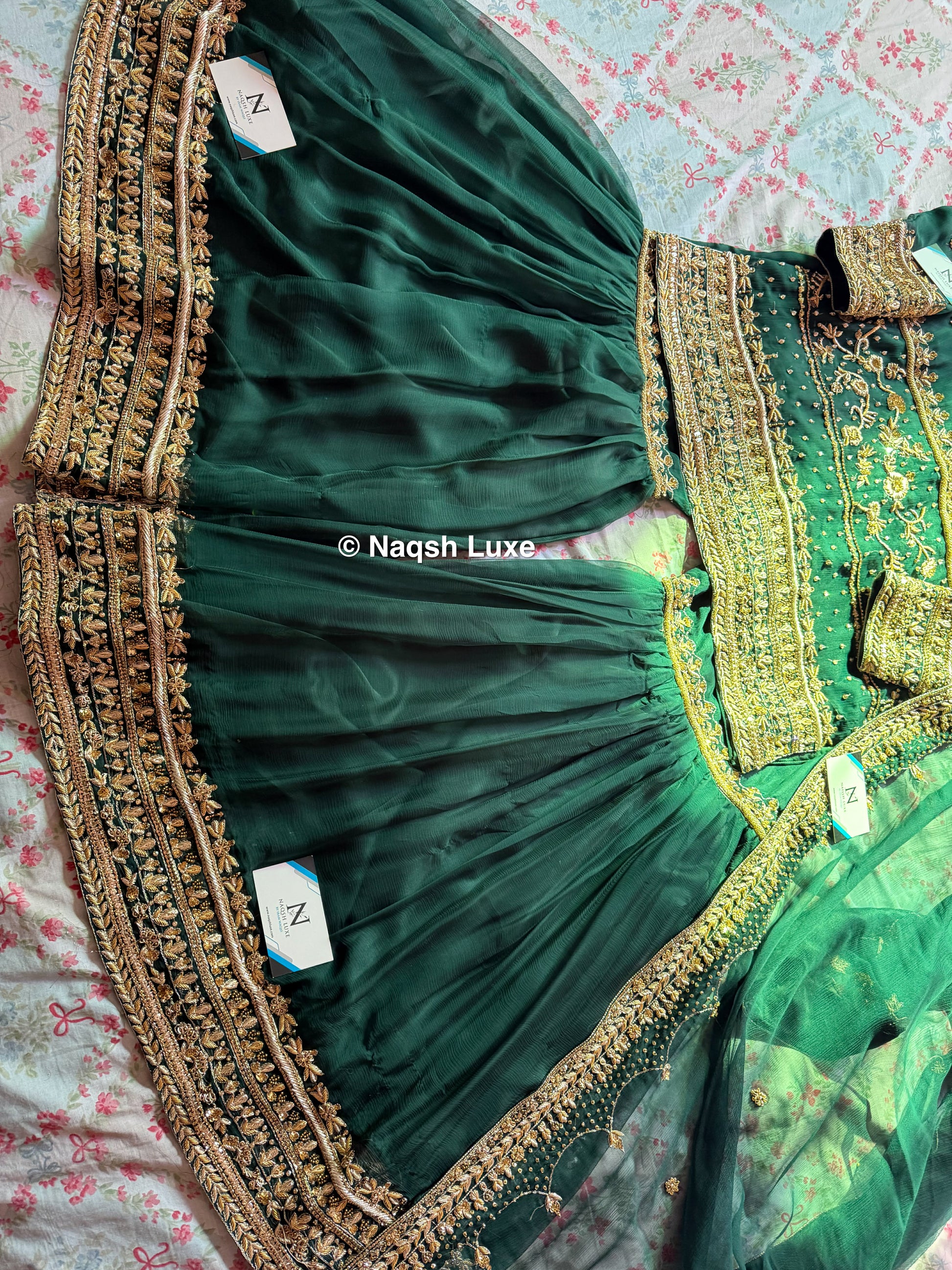Materials Used: Dabka, zardozi, kora, sequins, crystals, pearls, tilla, stones, resham.