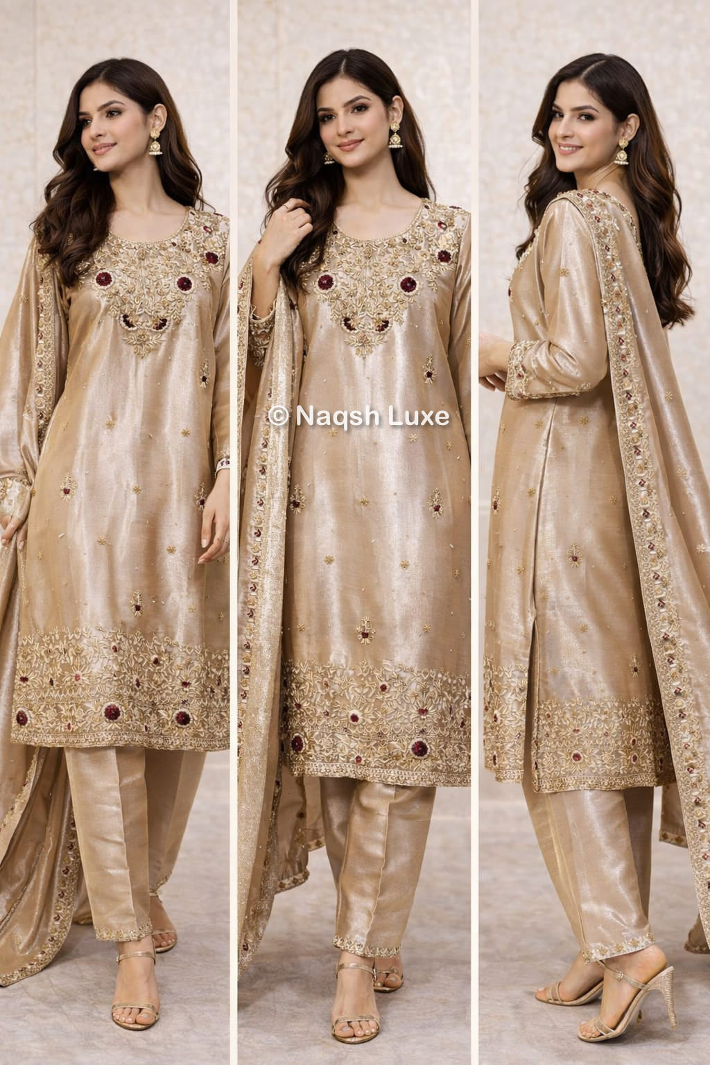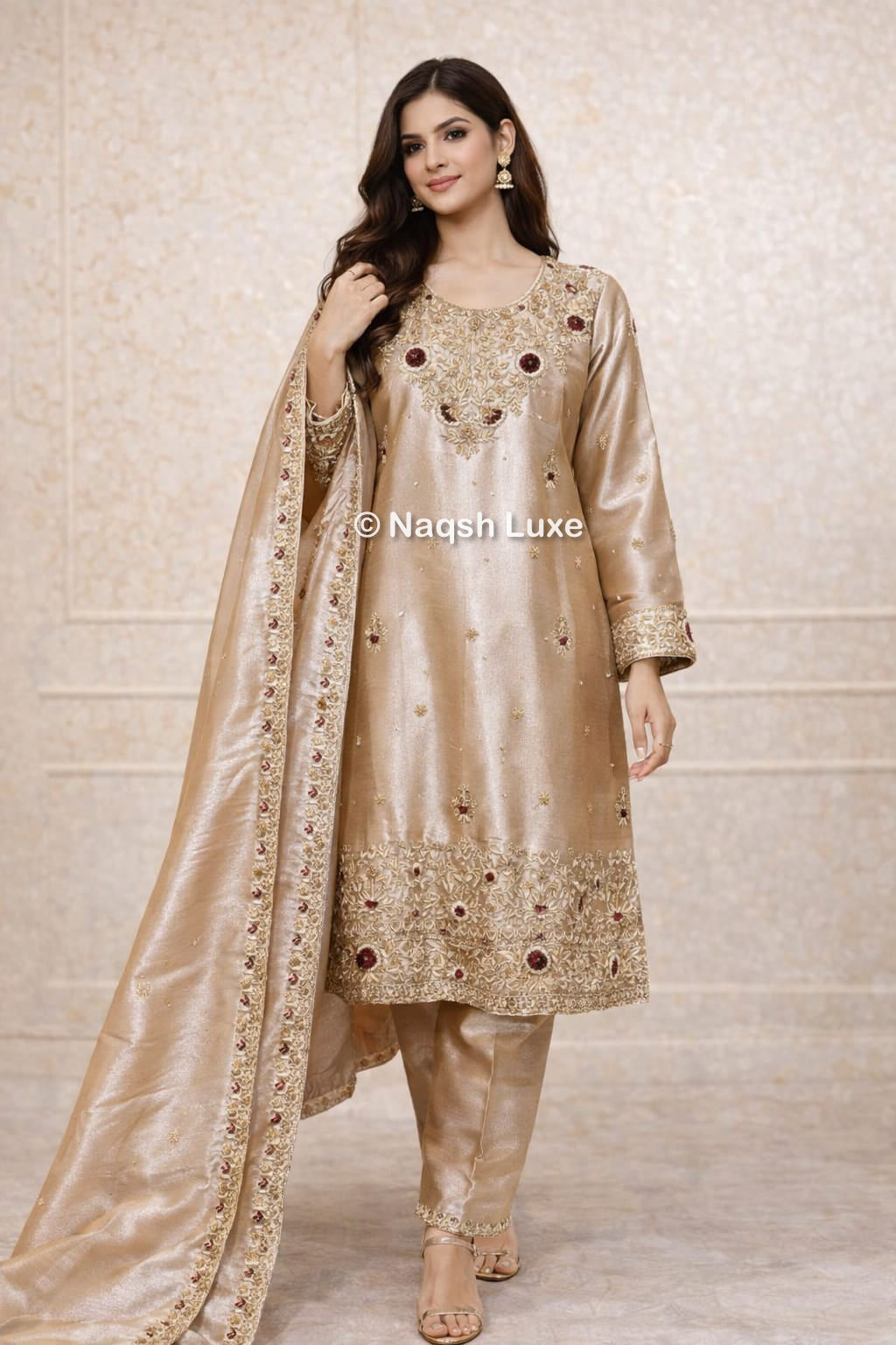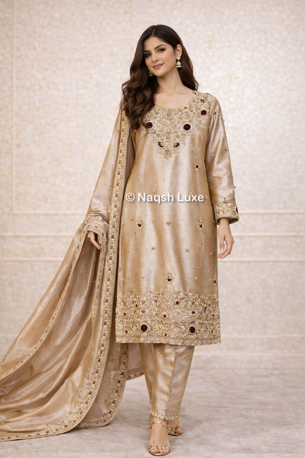 The Pakistani dress is beautifully handcrafted with zari, kora, dabka, stones, pearls and sequins. All the embellishments handsewn with double thread.