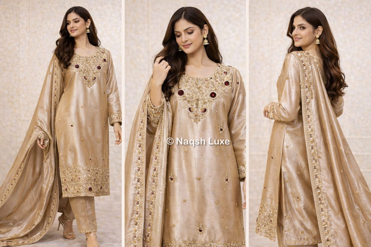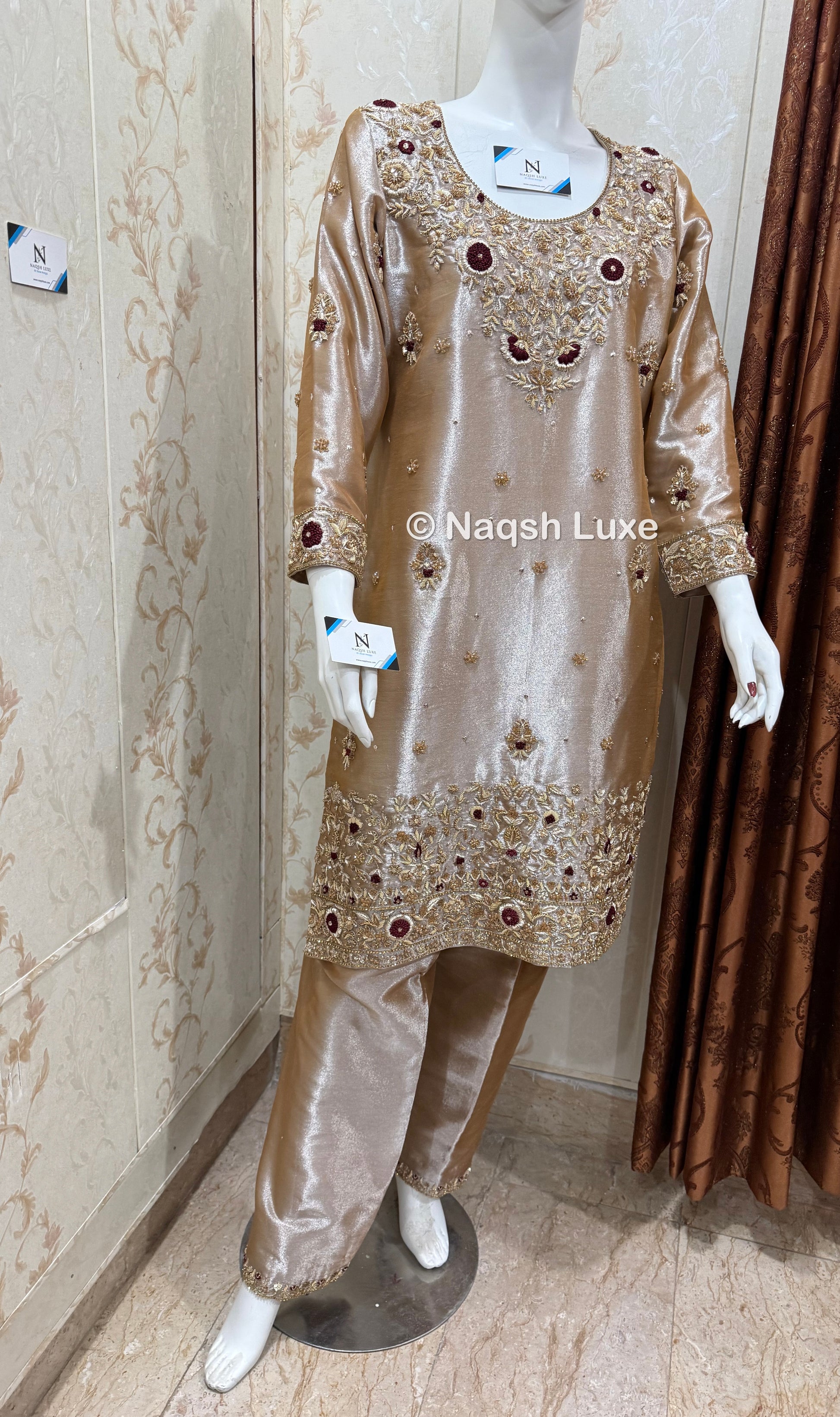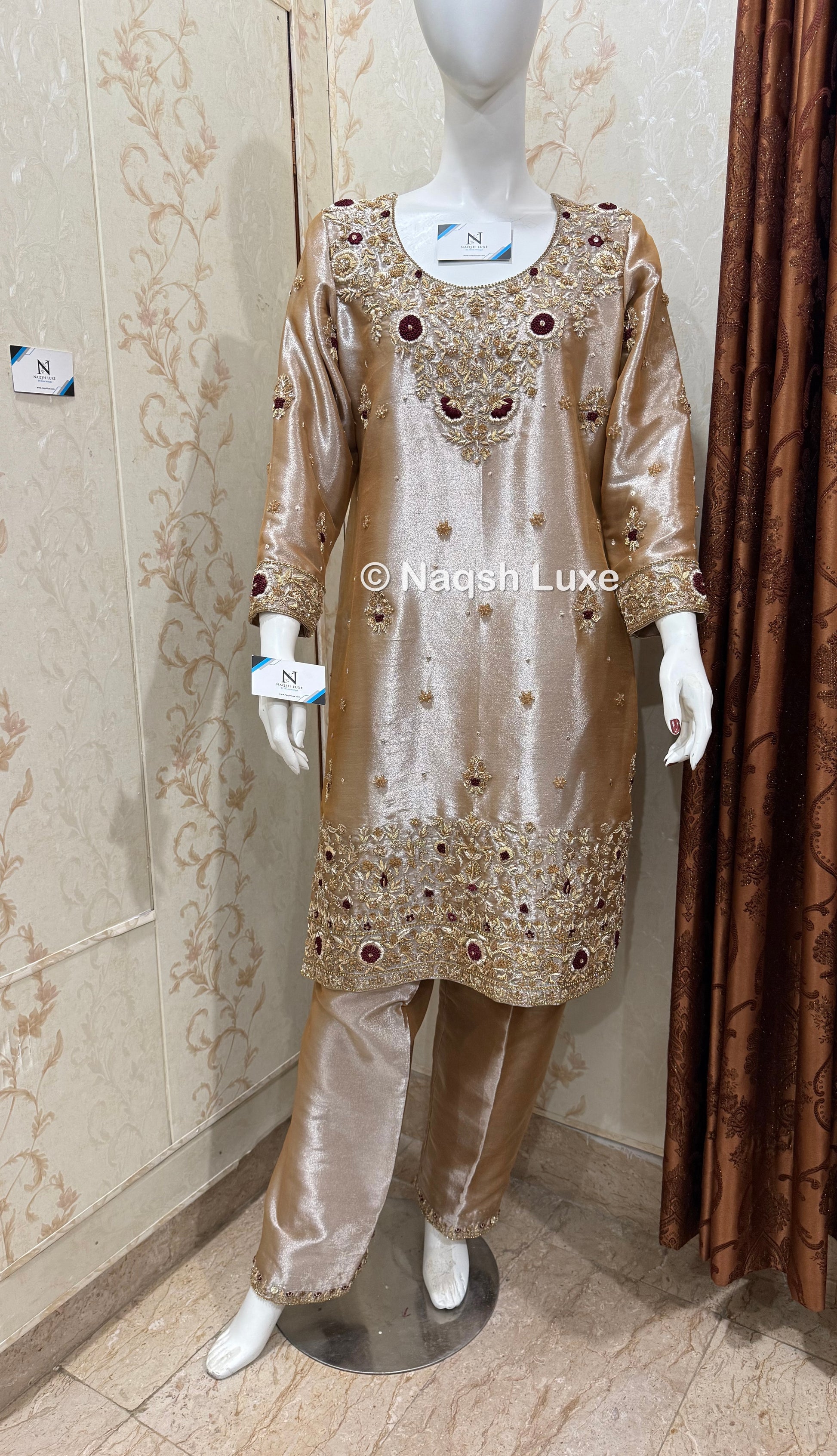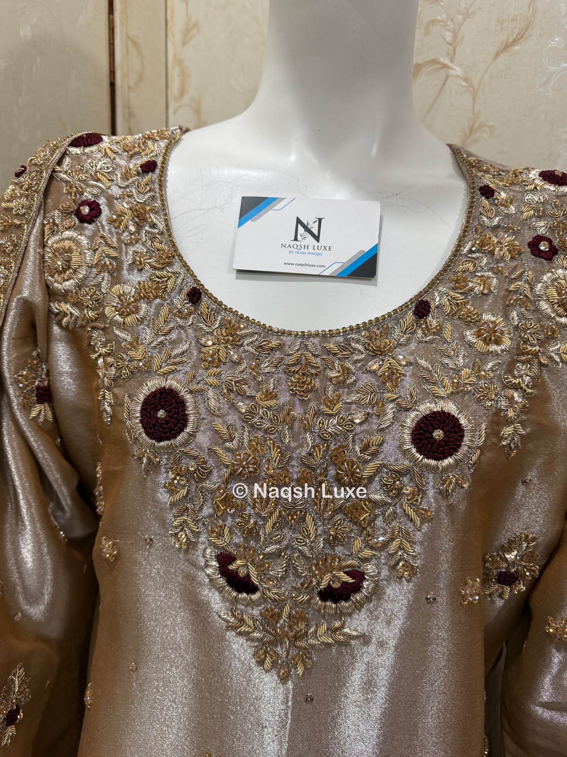 The Pakistani dress is beautifully handcrafted with zari, kora, dabka, stones, pearls and sequins. All the embellishments handsewn with double thread.
