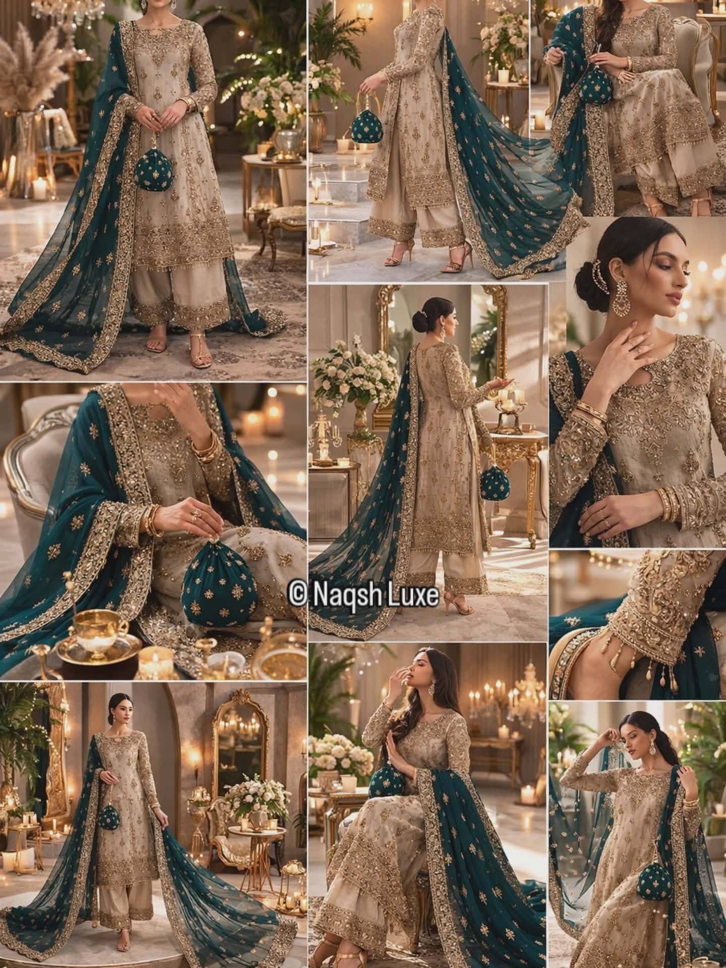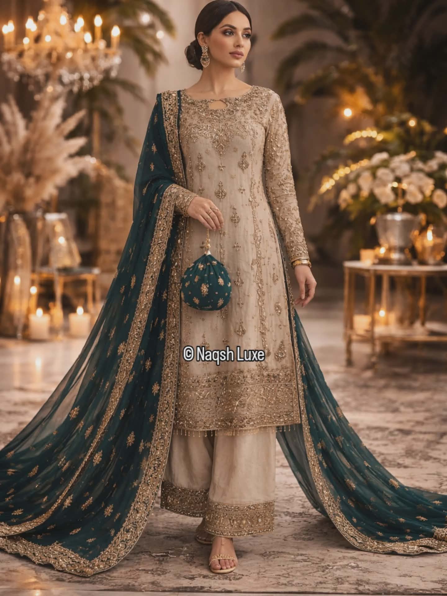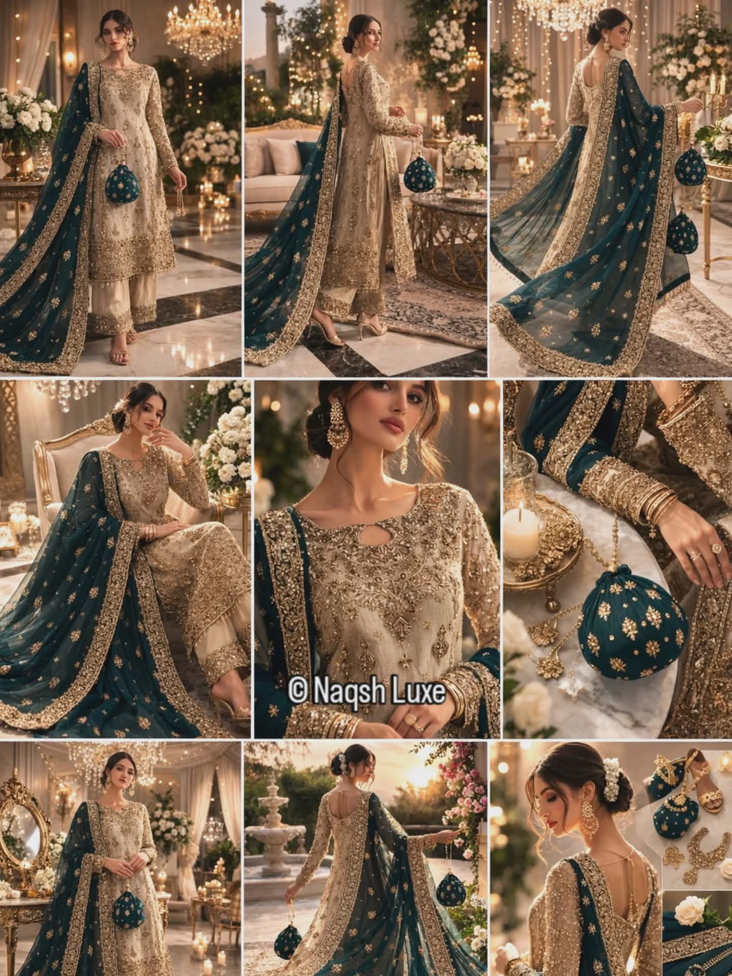 Imperial Reverie — where timeless craftsmanship meets regal elegance. Intricately hand-embellished with luminous gold dabka on a soft ivory canvas, paired with a deep emerald chiffon silk dupatta that flows like poetry. A statement of heritage, grace, and modern royalty for the woman who owns every room she walks into. ✨