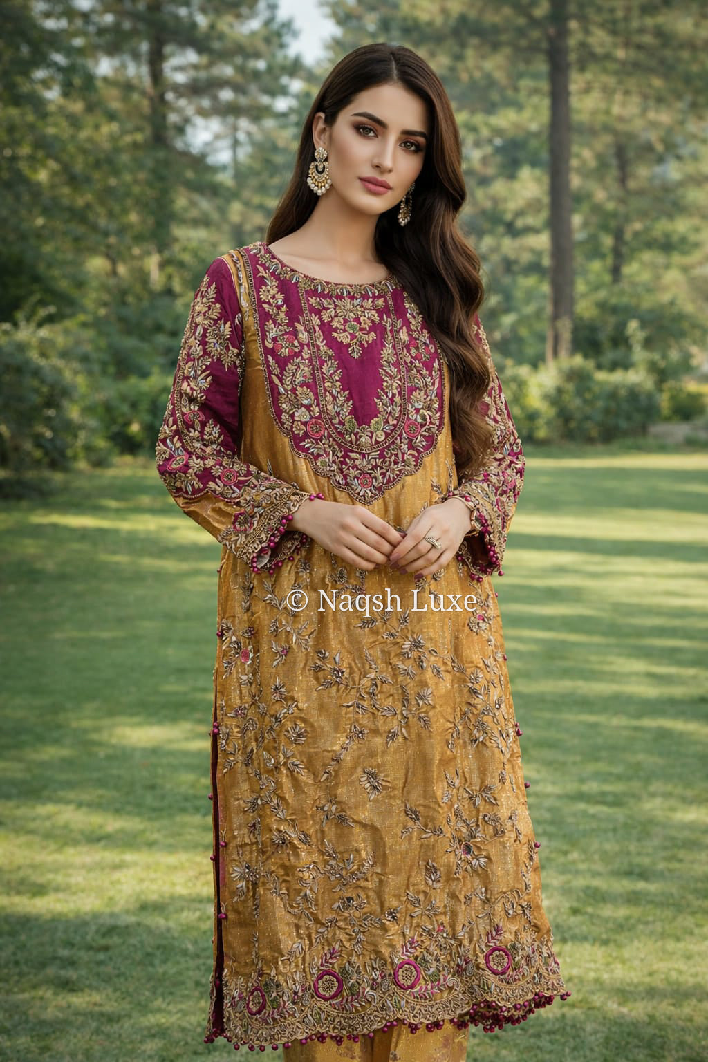 ‘The Pakistani dress is beautifully handcrafted with zari, kora, dabka, stones, pearls and sequins. All the embellishments are handsewn with double thread. Detailed Description Materials Used: Dabka, zardozi, kora, sequins, crystals, pearls, tilla, stones.