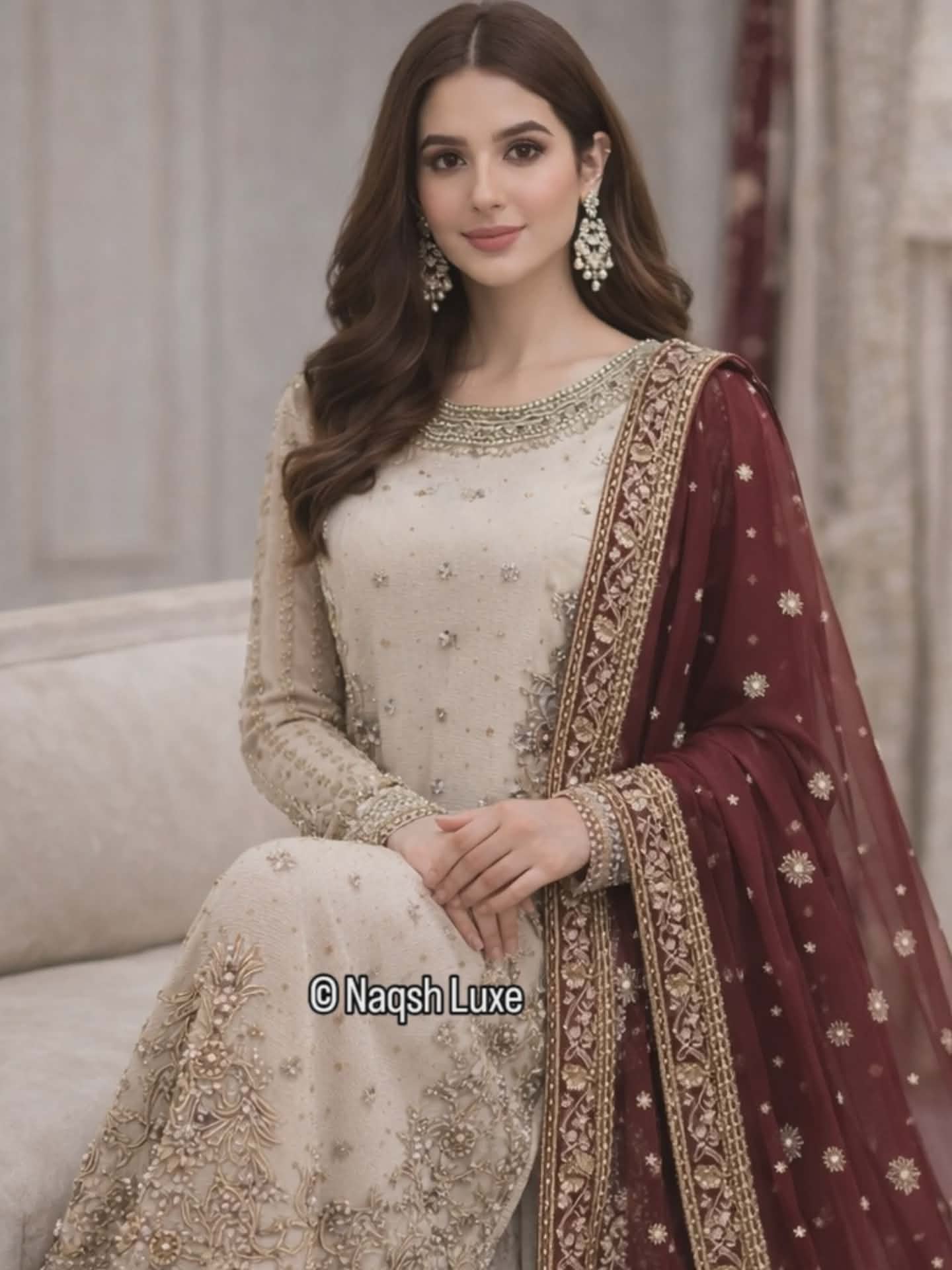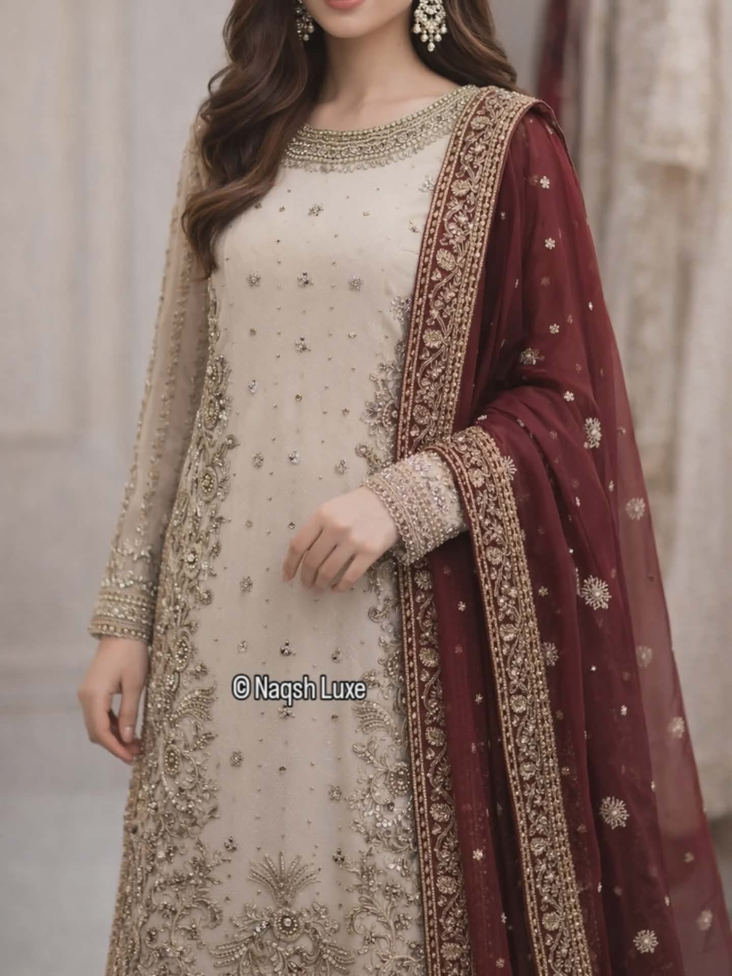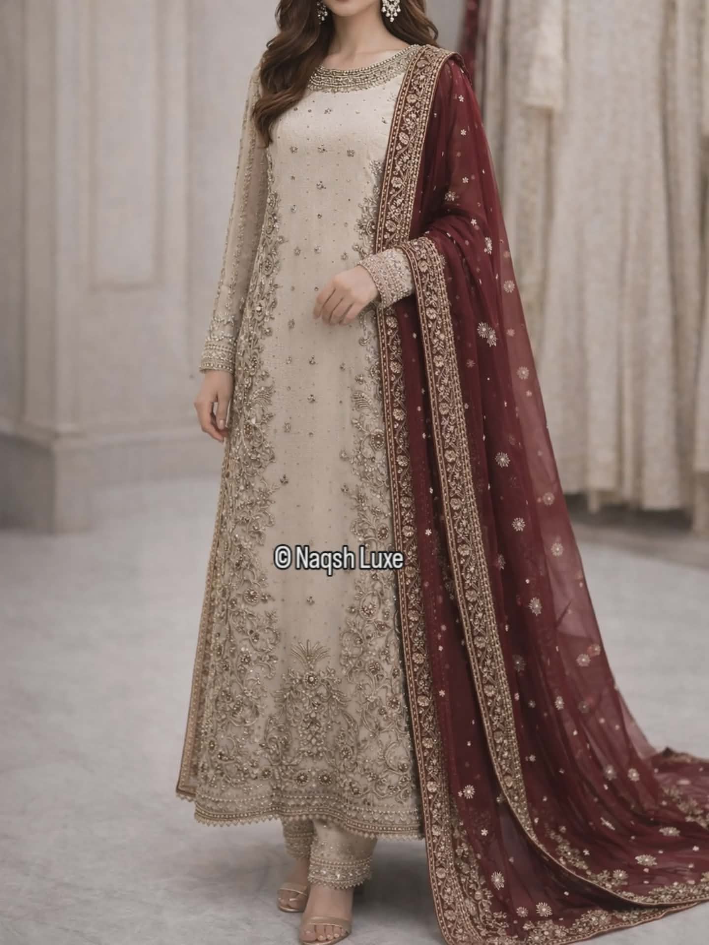 Ivory Prestige is a breathtaking kora dabka & zardozi hand-embroidered ensemble crafted on a timeless ivory base, paired with a rich deep maroon dupatta for a regal contrast.