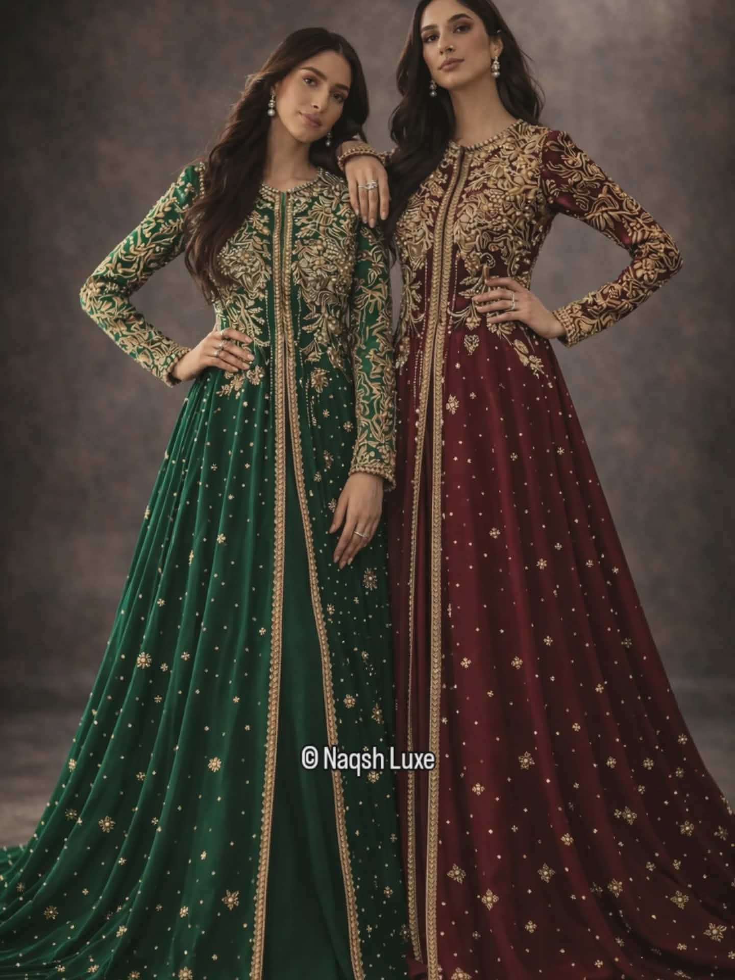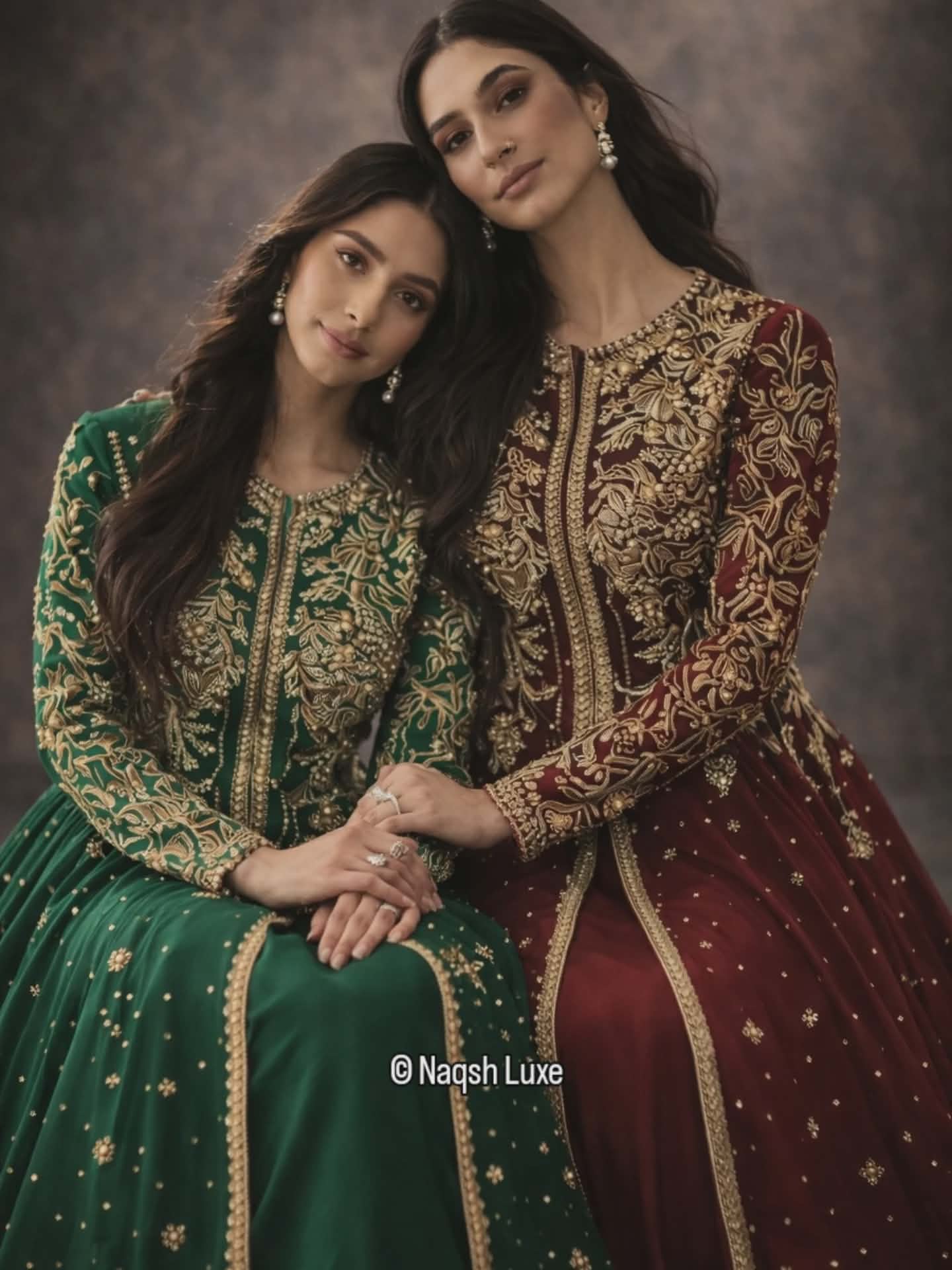 Where emerald grace meets maroon royalty and rust elegance. A timeless zardozi statement crafted for women who carry tradition with power and poise. Intricate gold handwork, flowing silhouettes, and pure festive luxury — designed to own every spotlight.