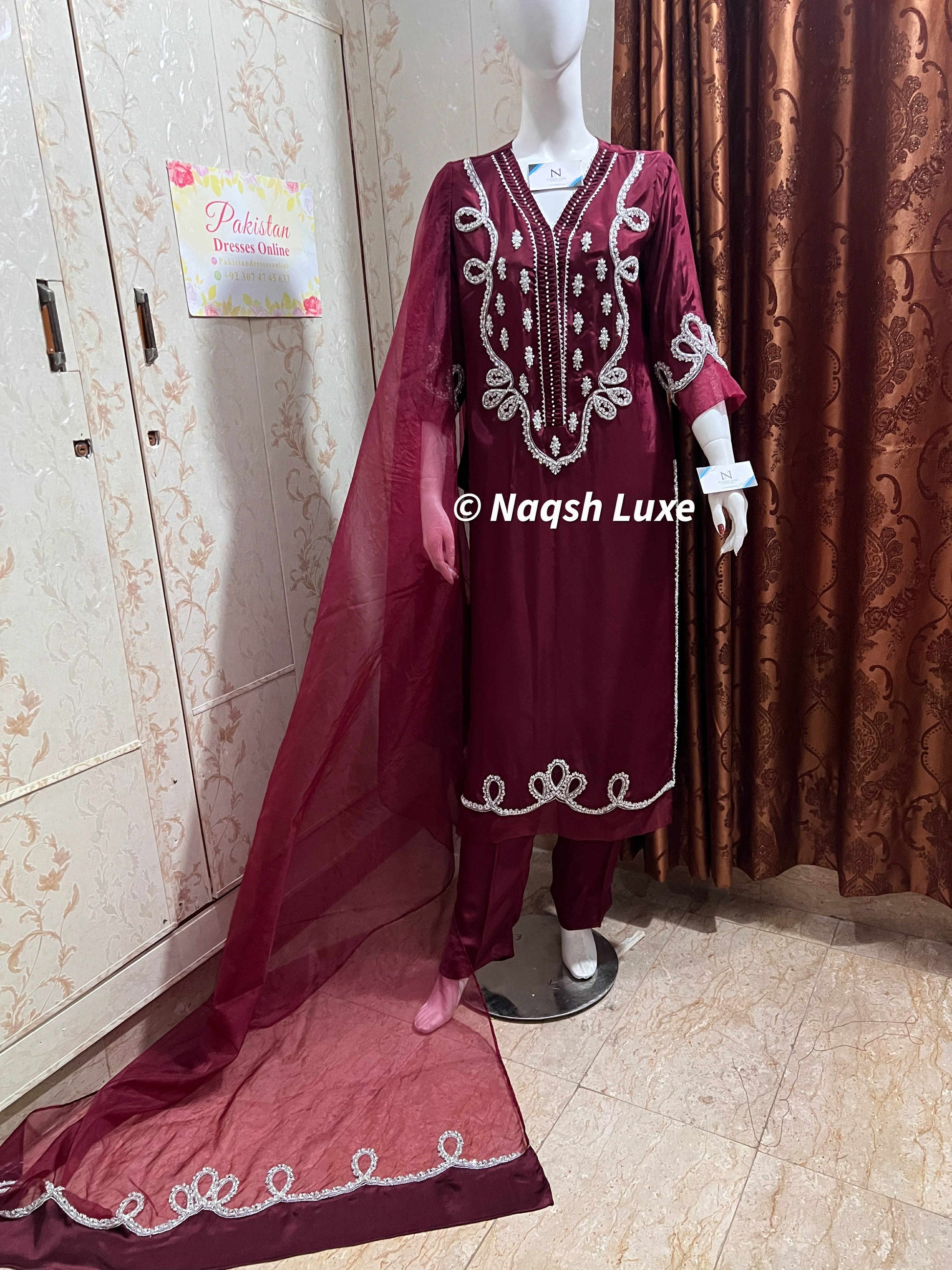 ‘The Pakistani dress is beautifully handcrafted with zari, kora, dabka, stones, pearls and sequins. All the embellishments are handsewn with double thread.