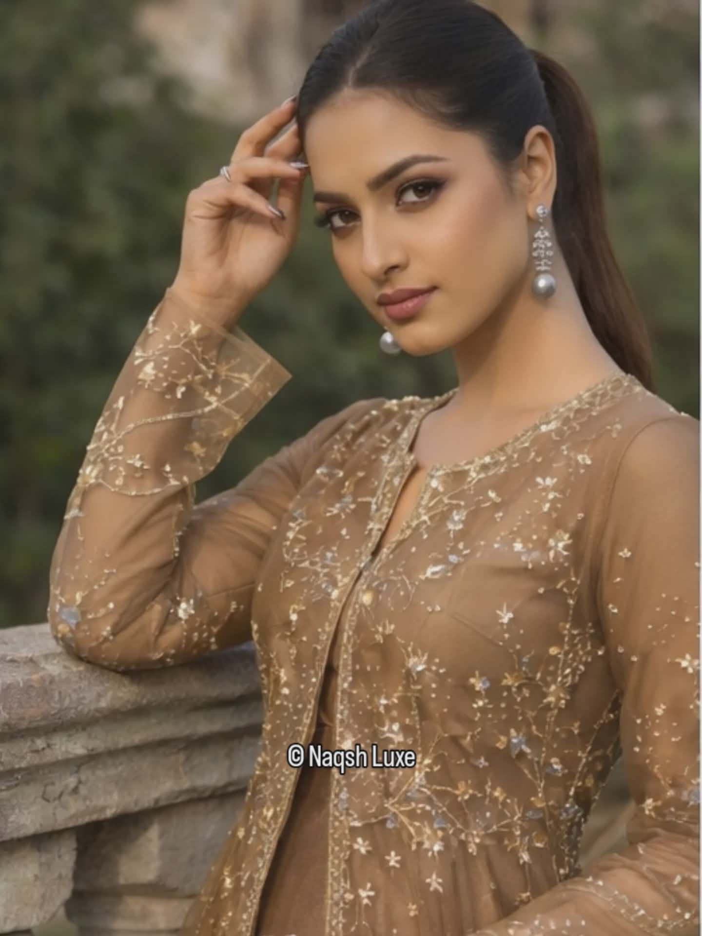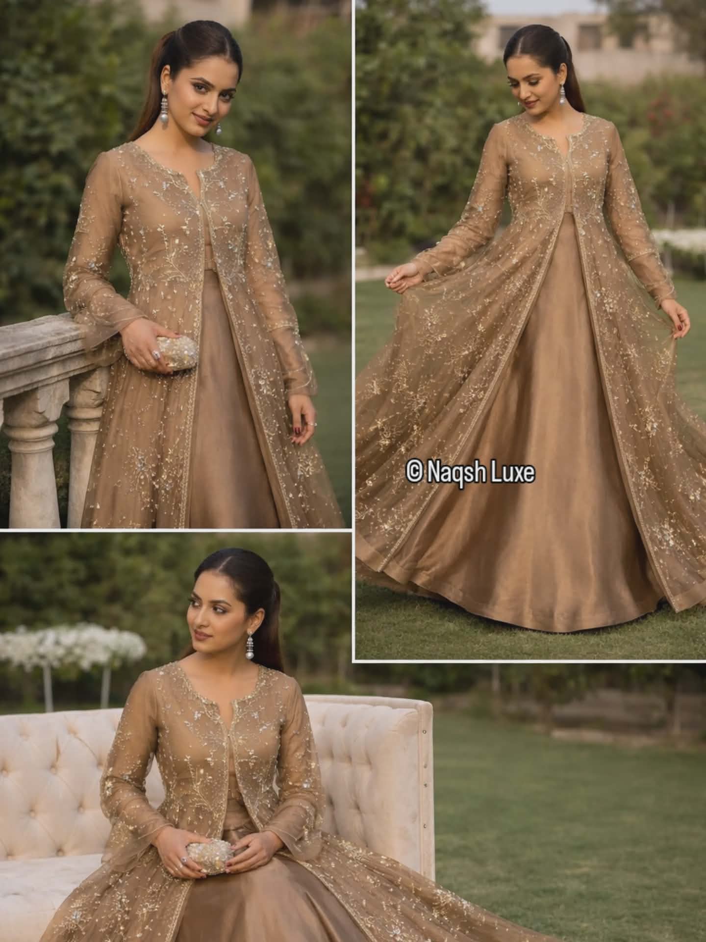 A vision of understated luxury in warm bronze gold. This elegant jacket-style ensemble features delicate hand-embellished dabka, zari and sequin work on sheer organza layered over a flowing silk gown. The soft shimmer and graceful silhouette create a timeless statement for festive soirées and formal evenings.