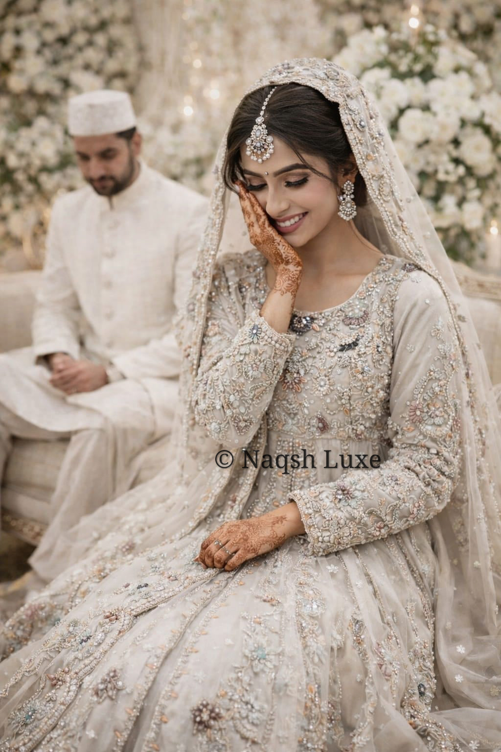 ‘The Pakistani dress is beautifully handcrafted with zari, kora, dabka, stones, pearls and sequins. All the embellishments are handsewn with double thread.