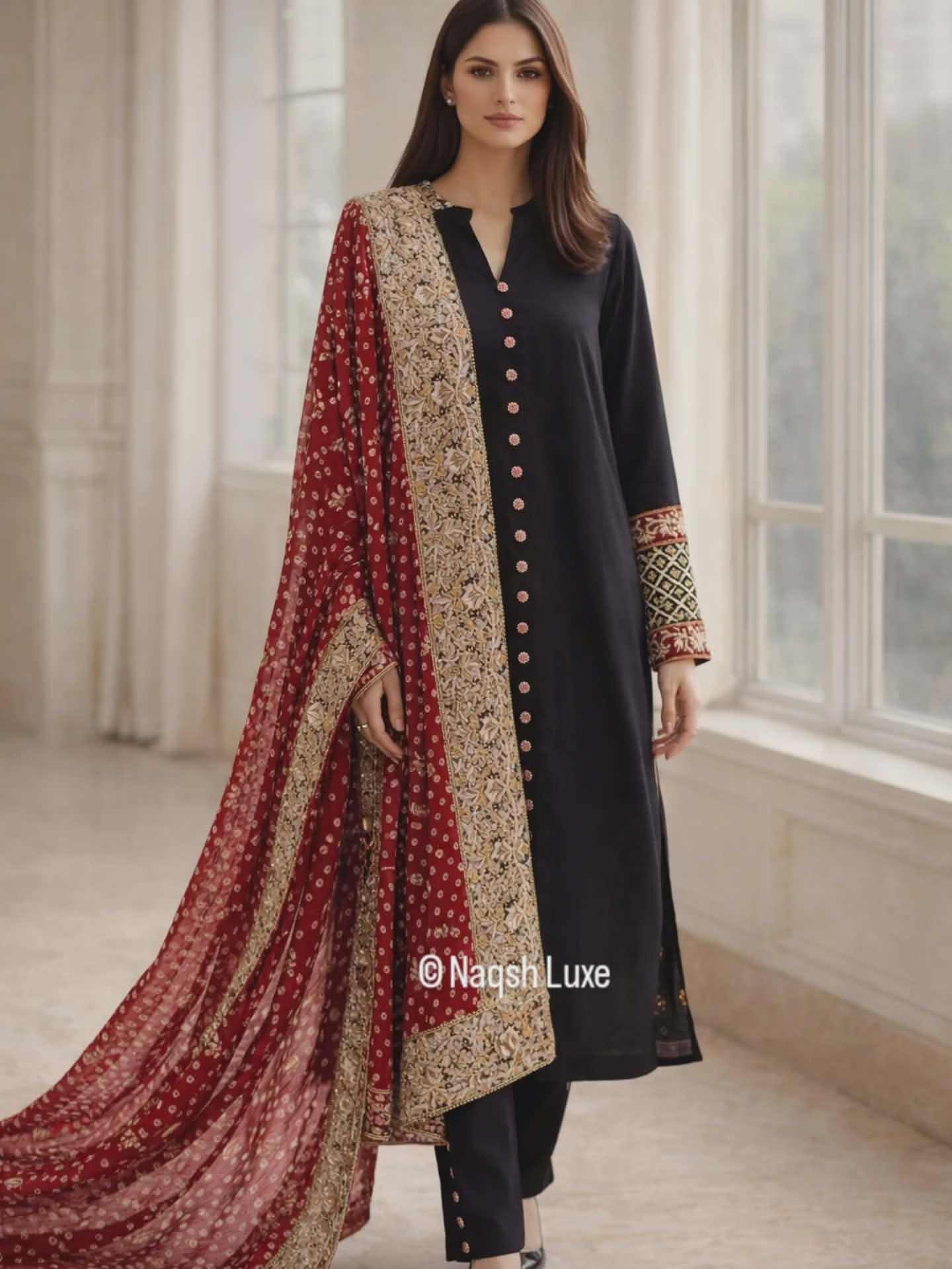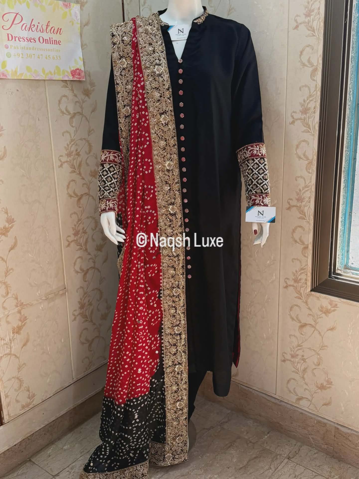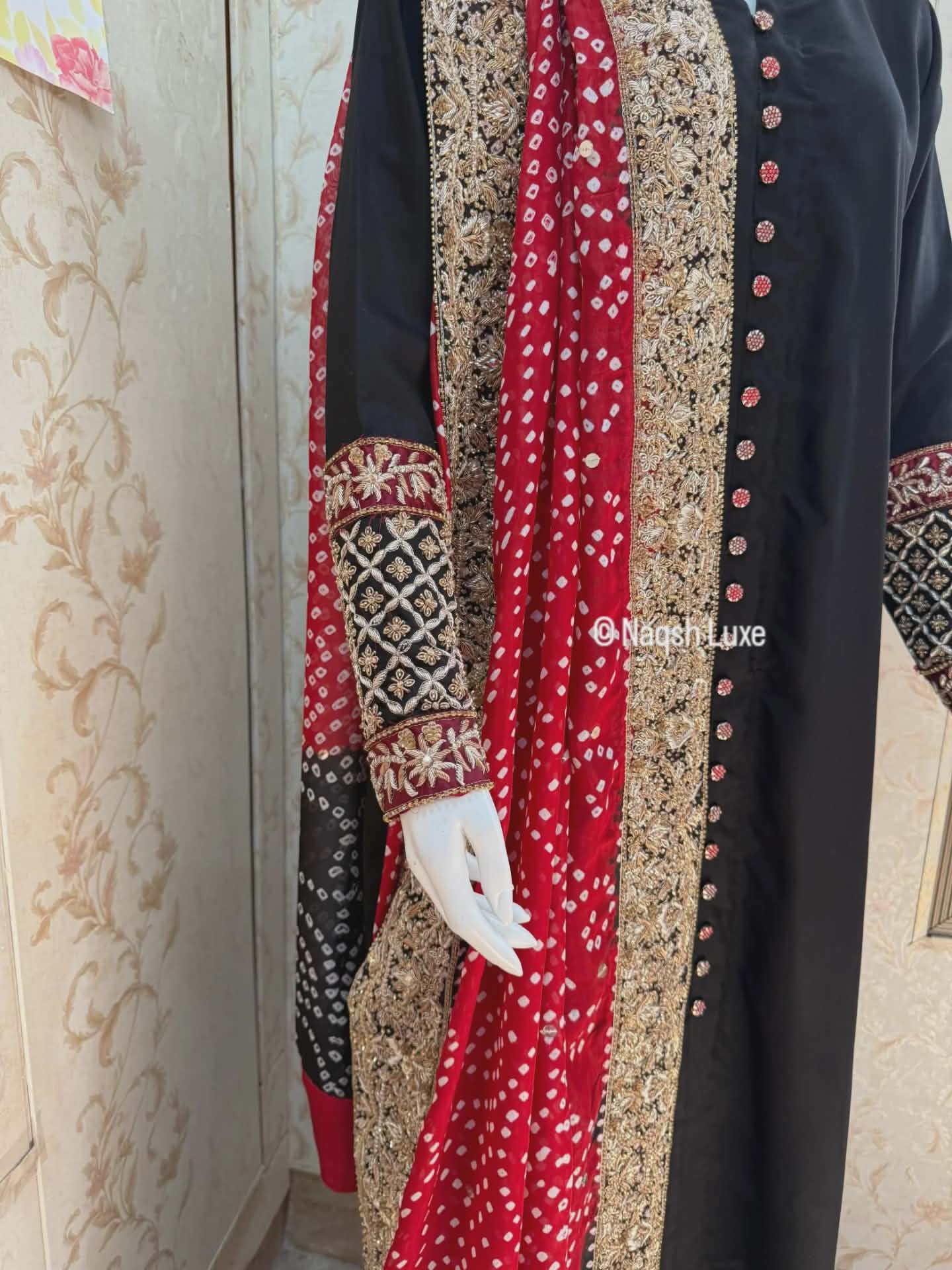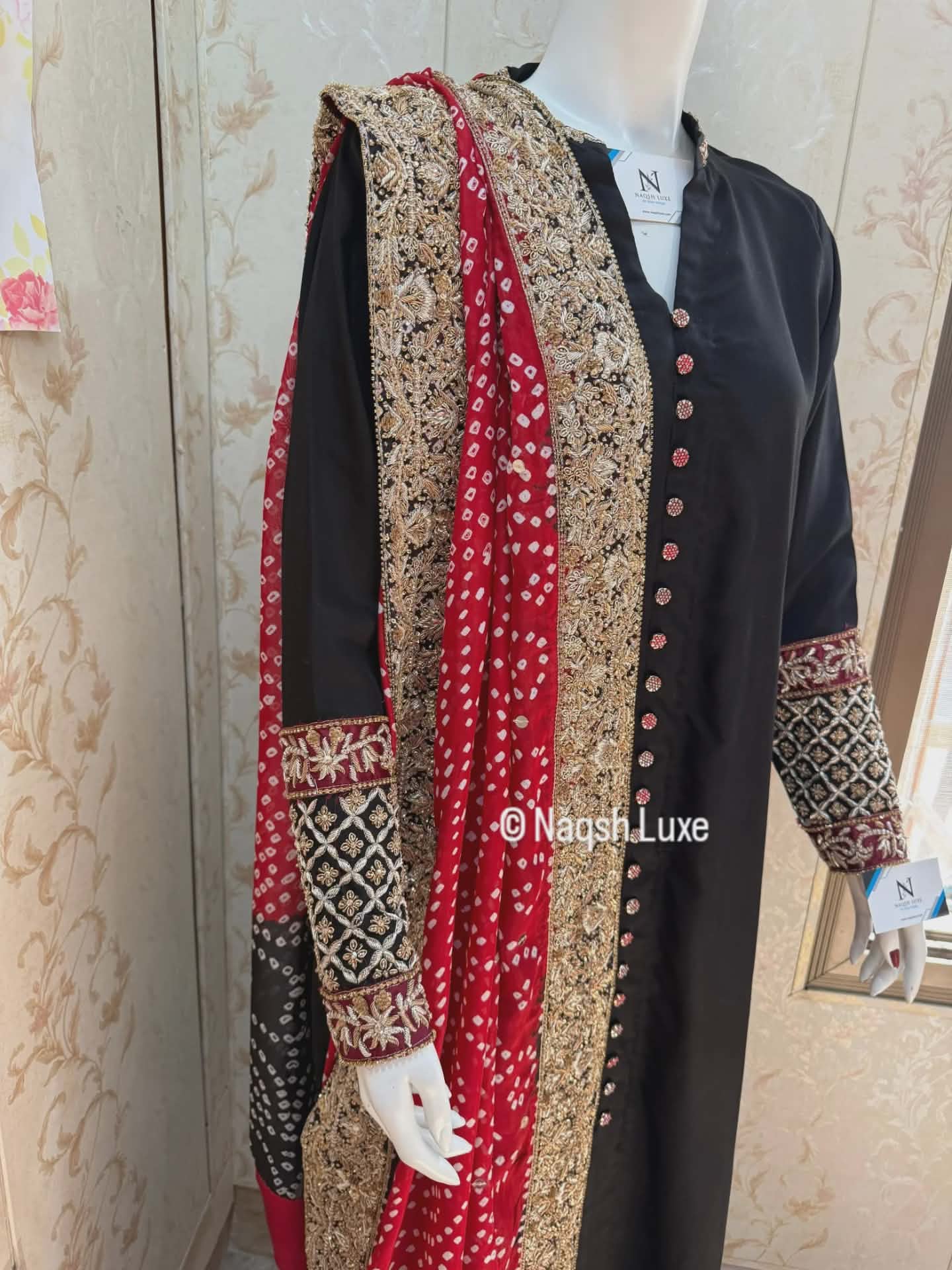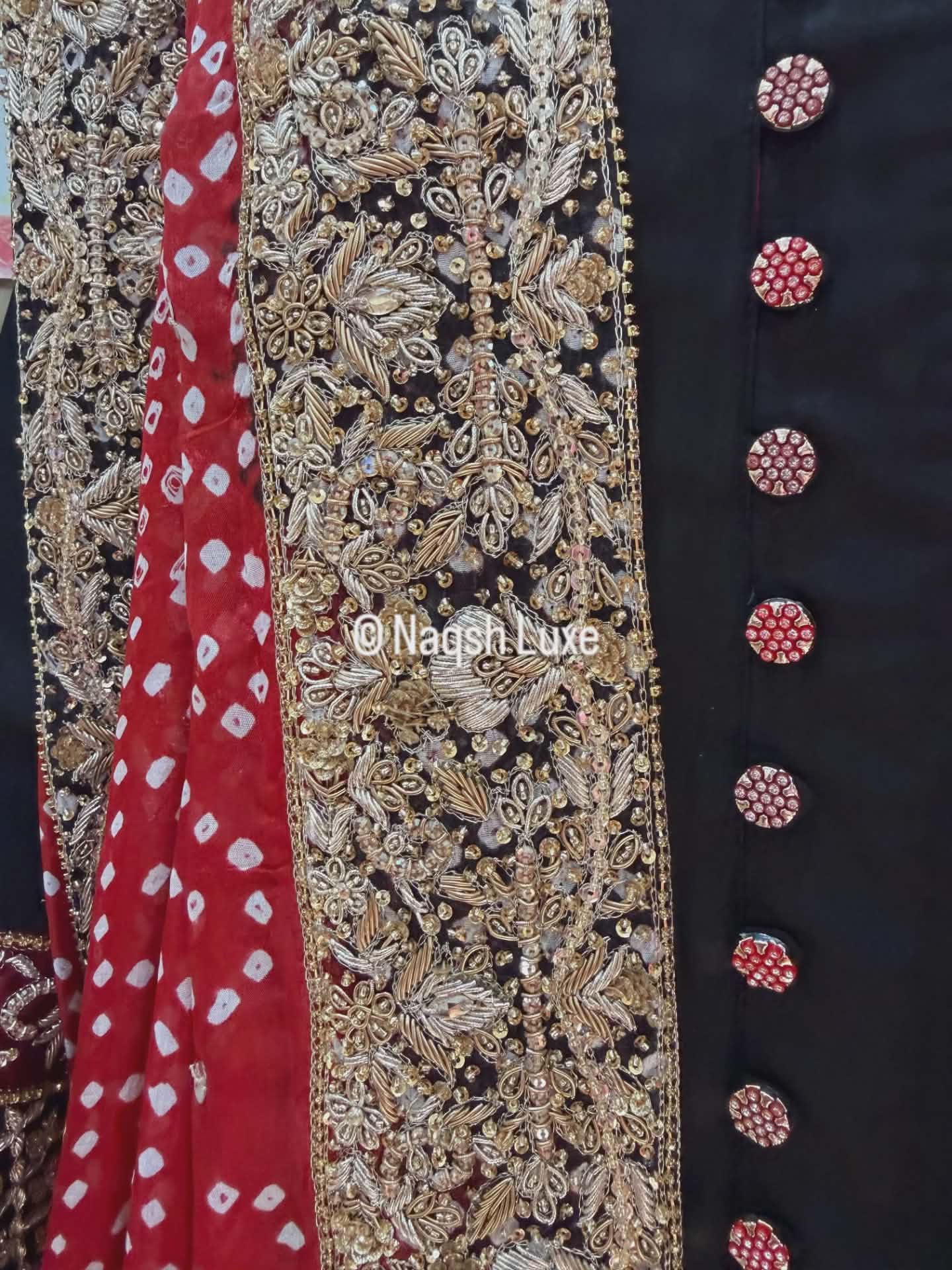 Draped in timeless black with a striking red chunri mukesh dupatta, this ensemble is a celebration of heritage and luxury. Intricate gold dabka and tilla work on the sleeves and borders adds regal charm, making it perfect for festive soirées and wedding evenings. A classic silhouette with bold traditional accents — made for the woman who owns the night.