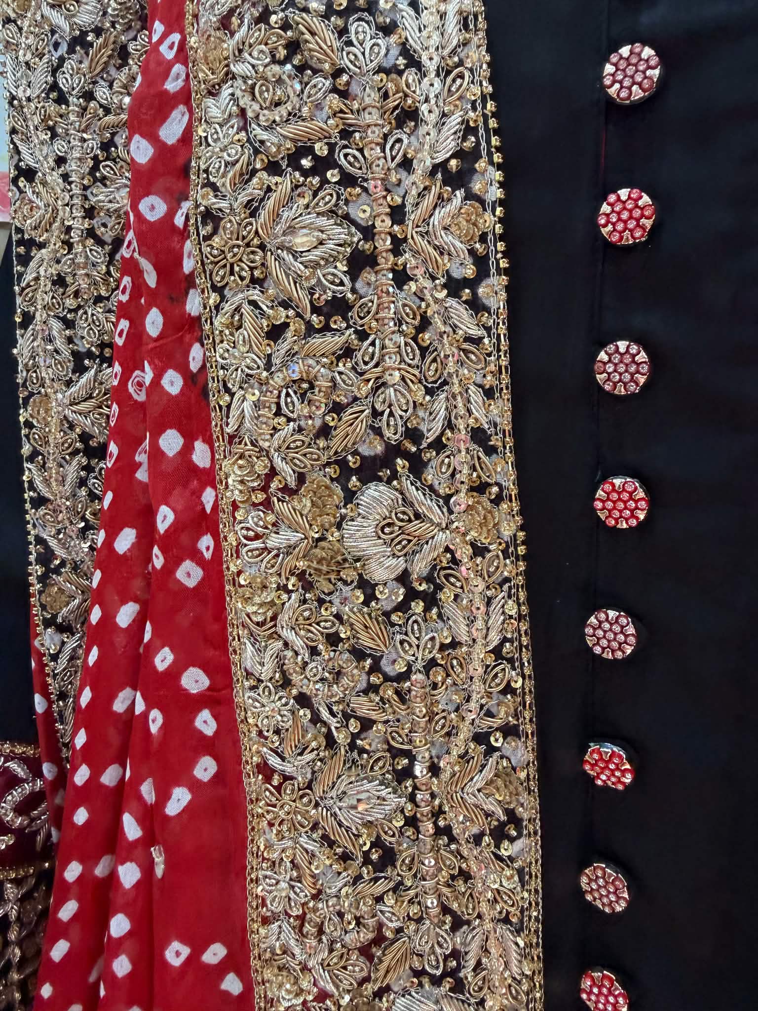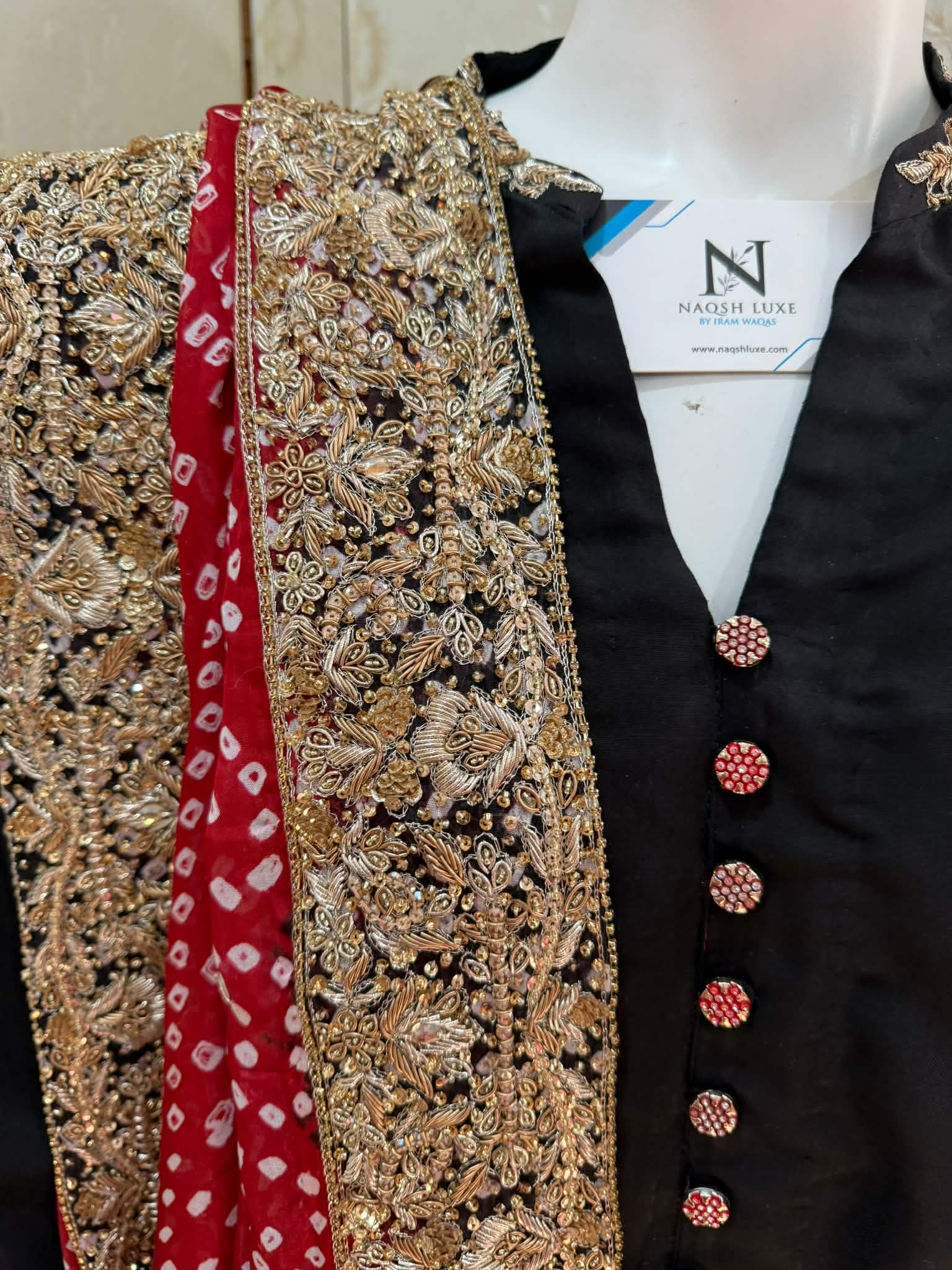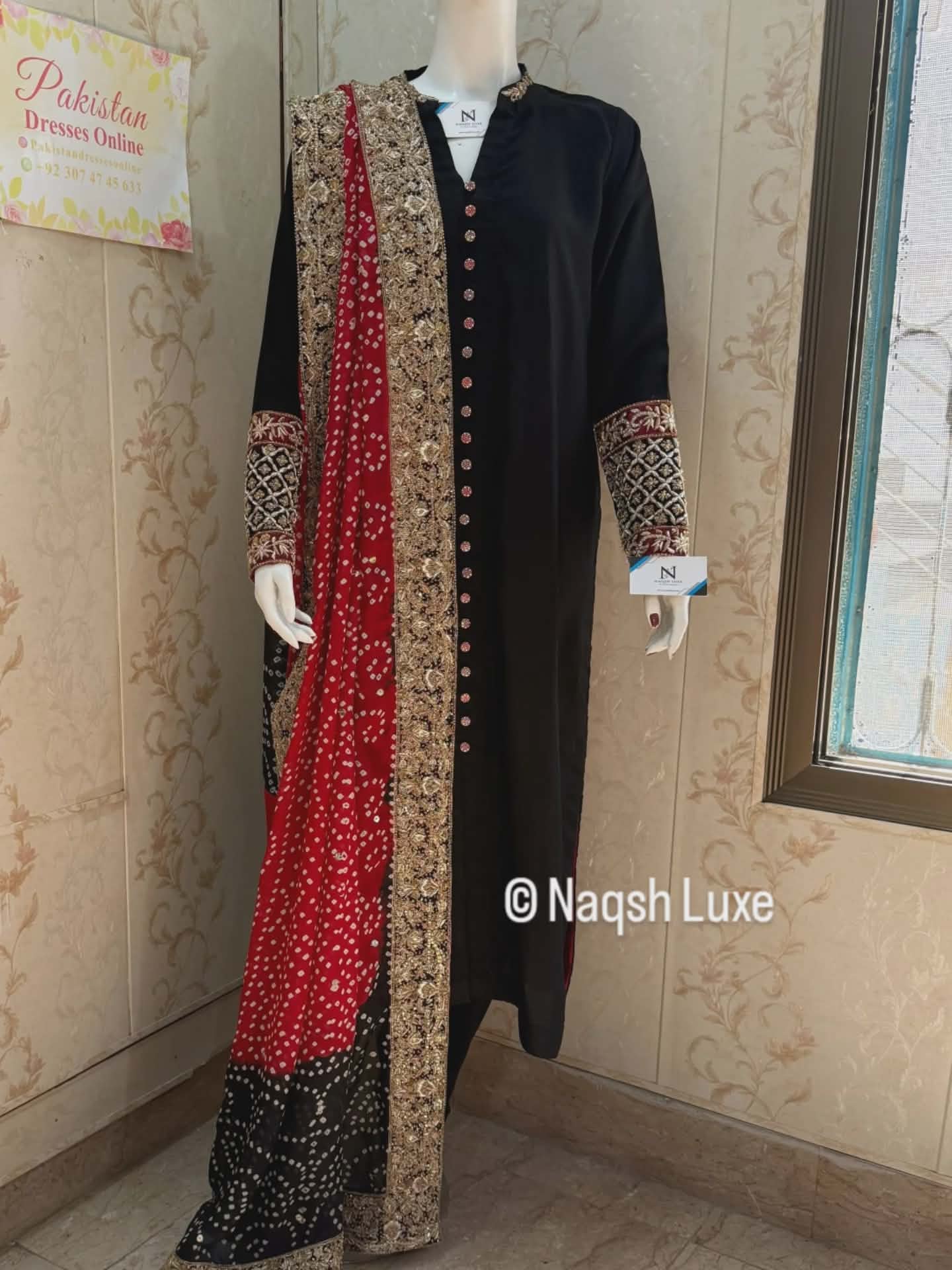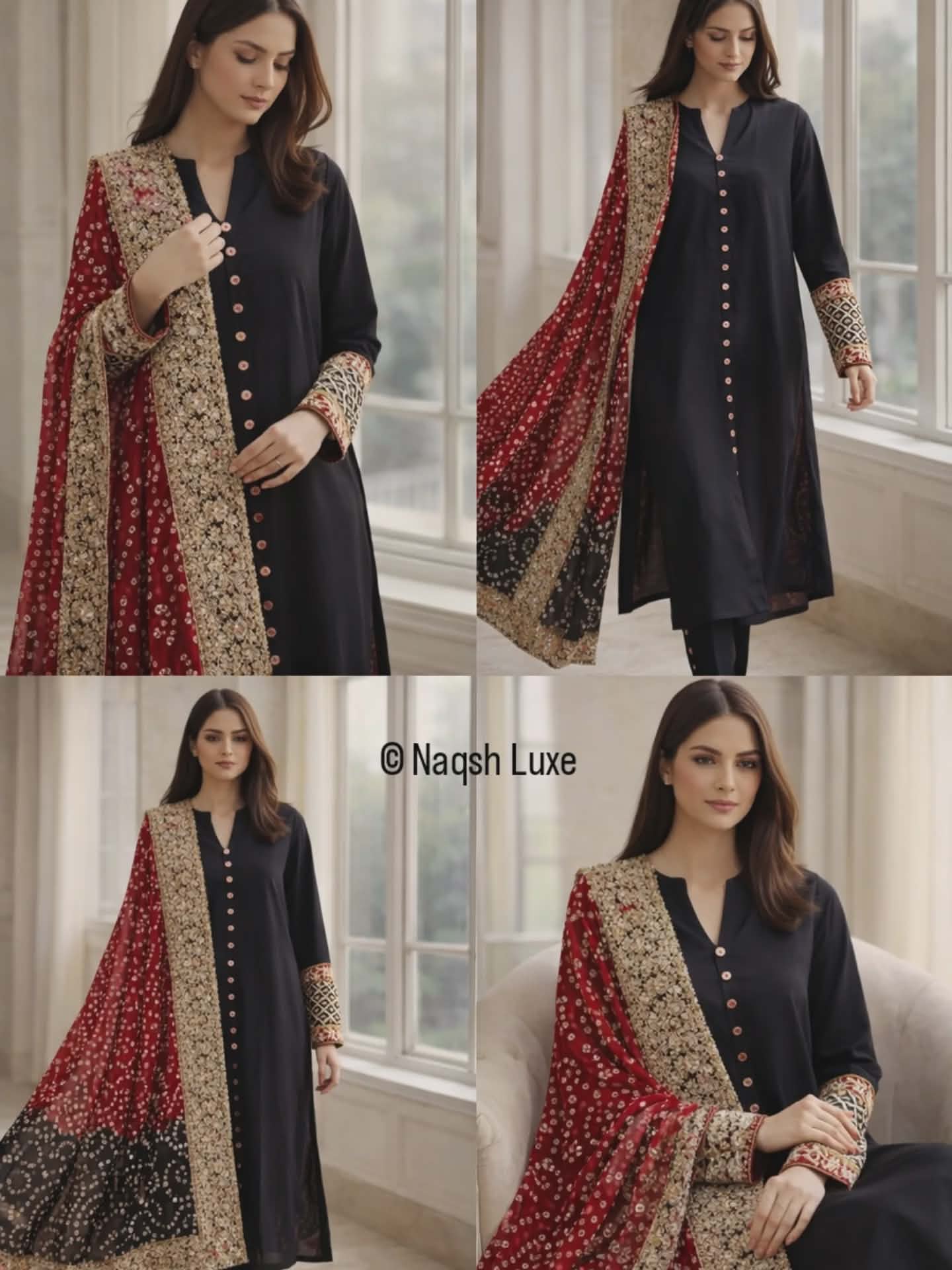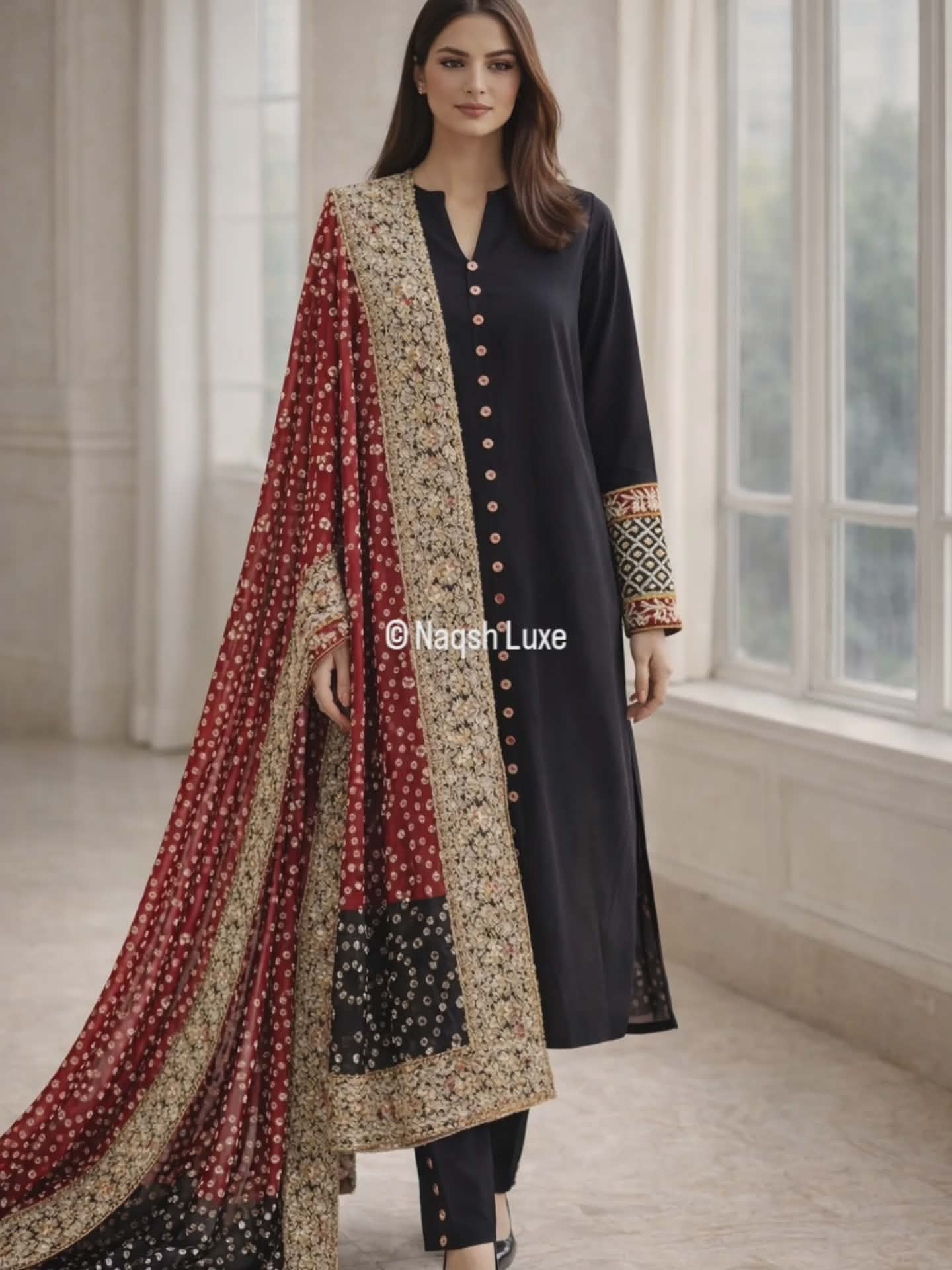 Draped in timeless black with a striking red chunri mukesh dupatta, this ensemble is a celebration of heritage and luxury. Intricate gold dabka and tilla work on the sleeves and borders adds regal charm, making it perfect for festive soirées and wedding evenings. A classic silhouette with bold traditional accents — made for the woman who owns the night.