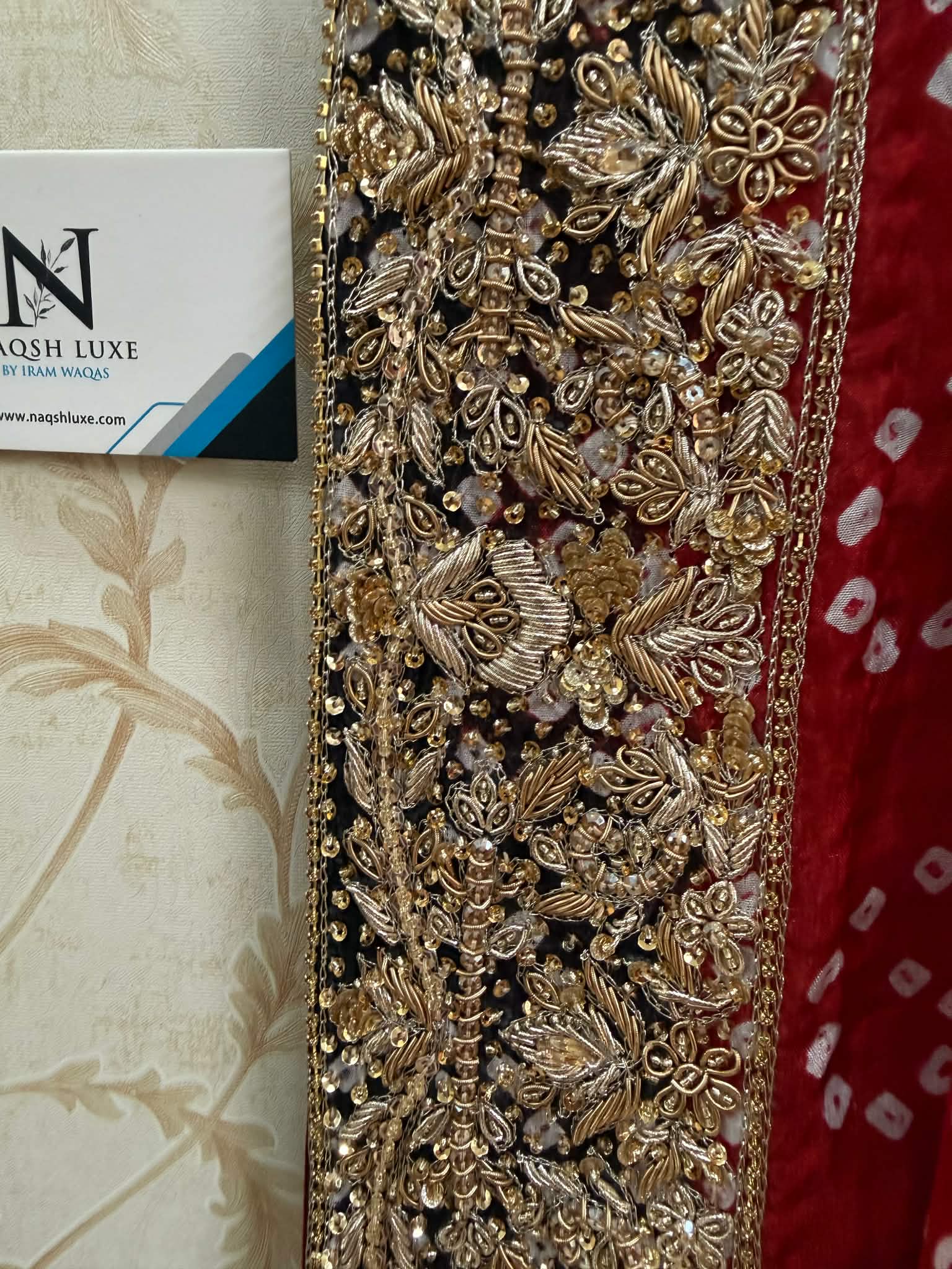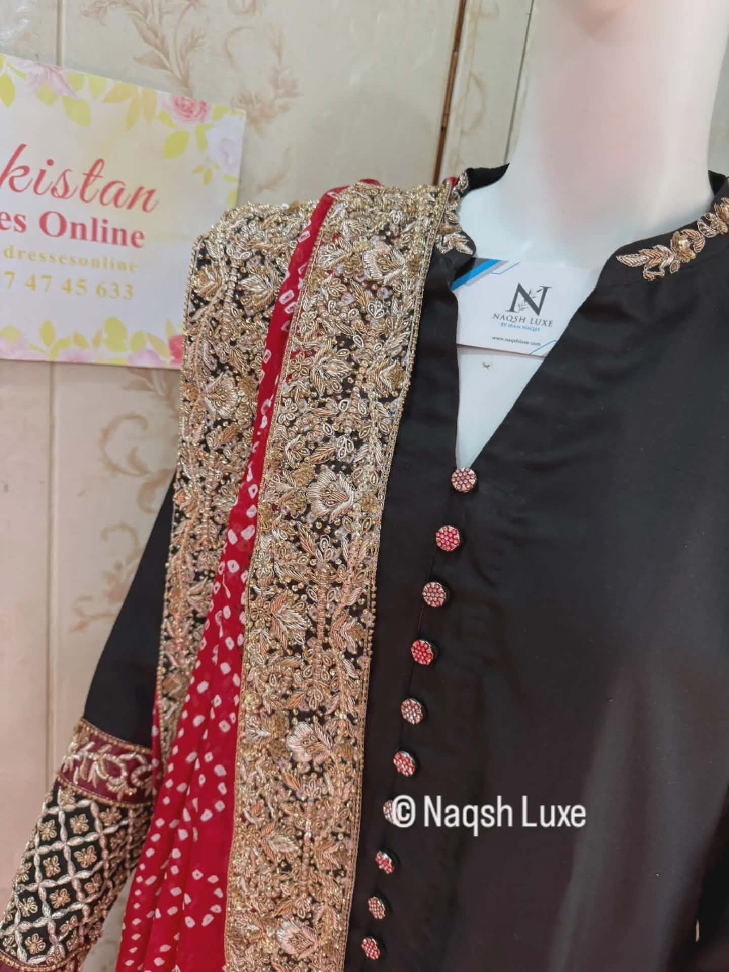 The Pakistani dress is beautifully handcrafted with zari, kora, dabka, stones, pearls and sequins. All the embellishments handsewn with double thread.