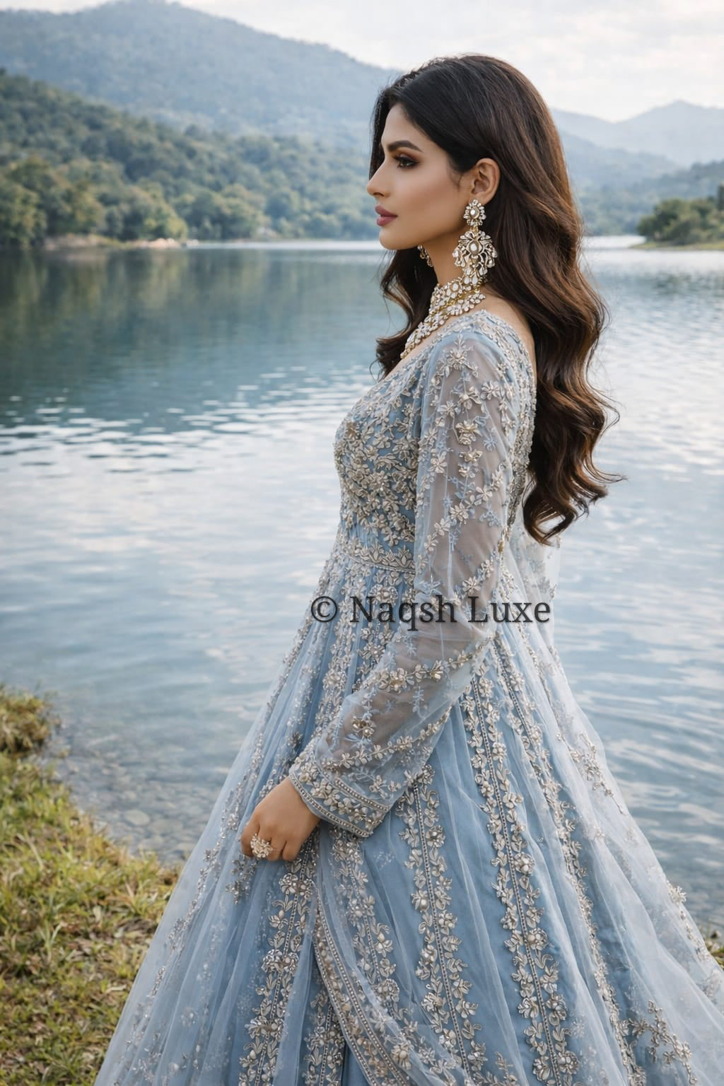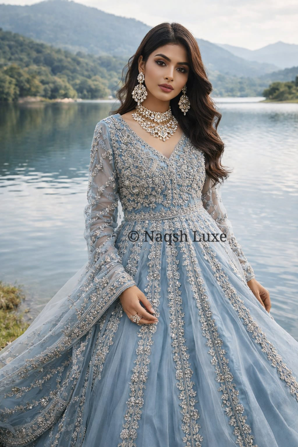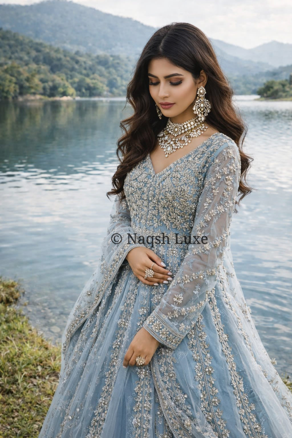 Materials Used: Dabka, zardozi, kora, sequins, crystals, pearls, tilla, stones, resham.