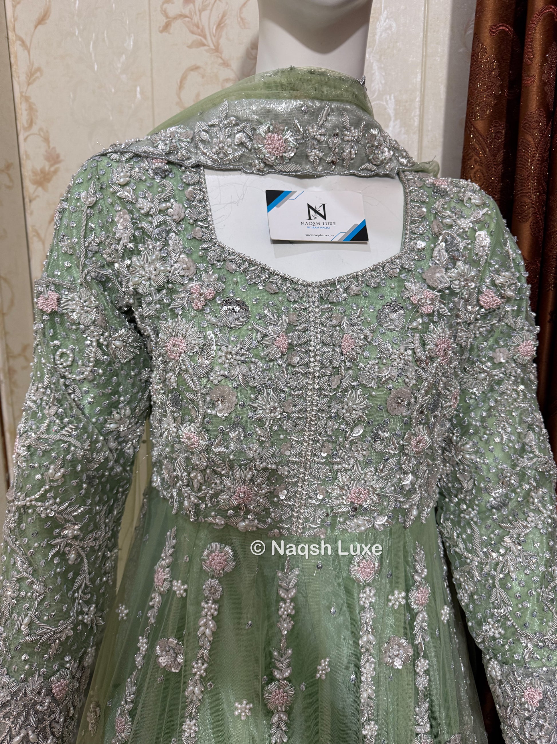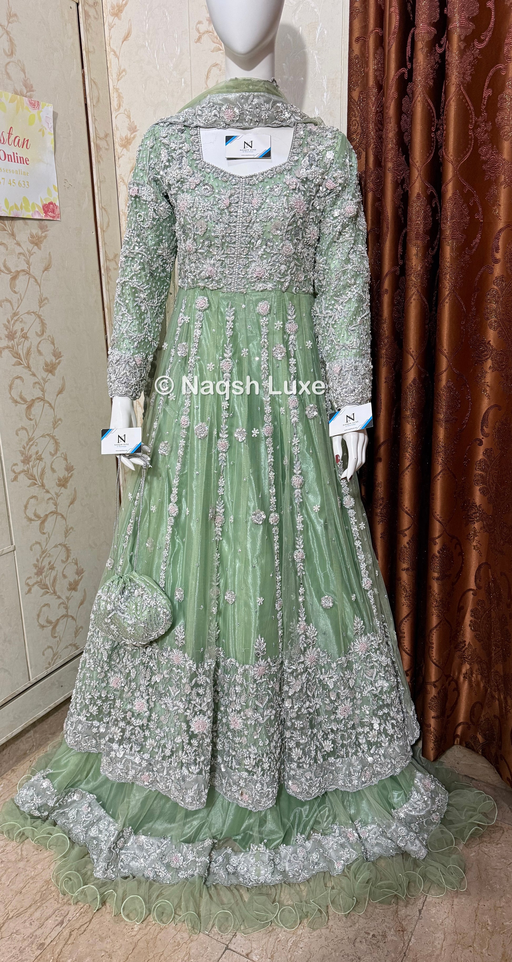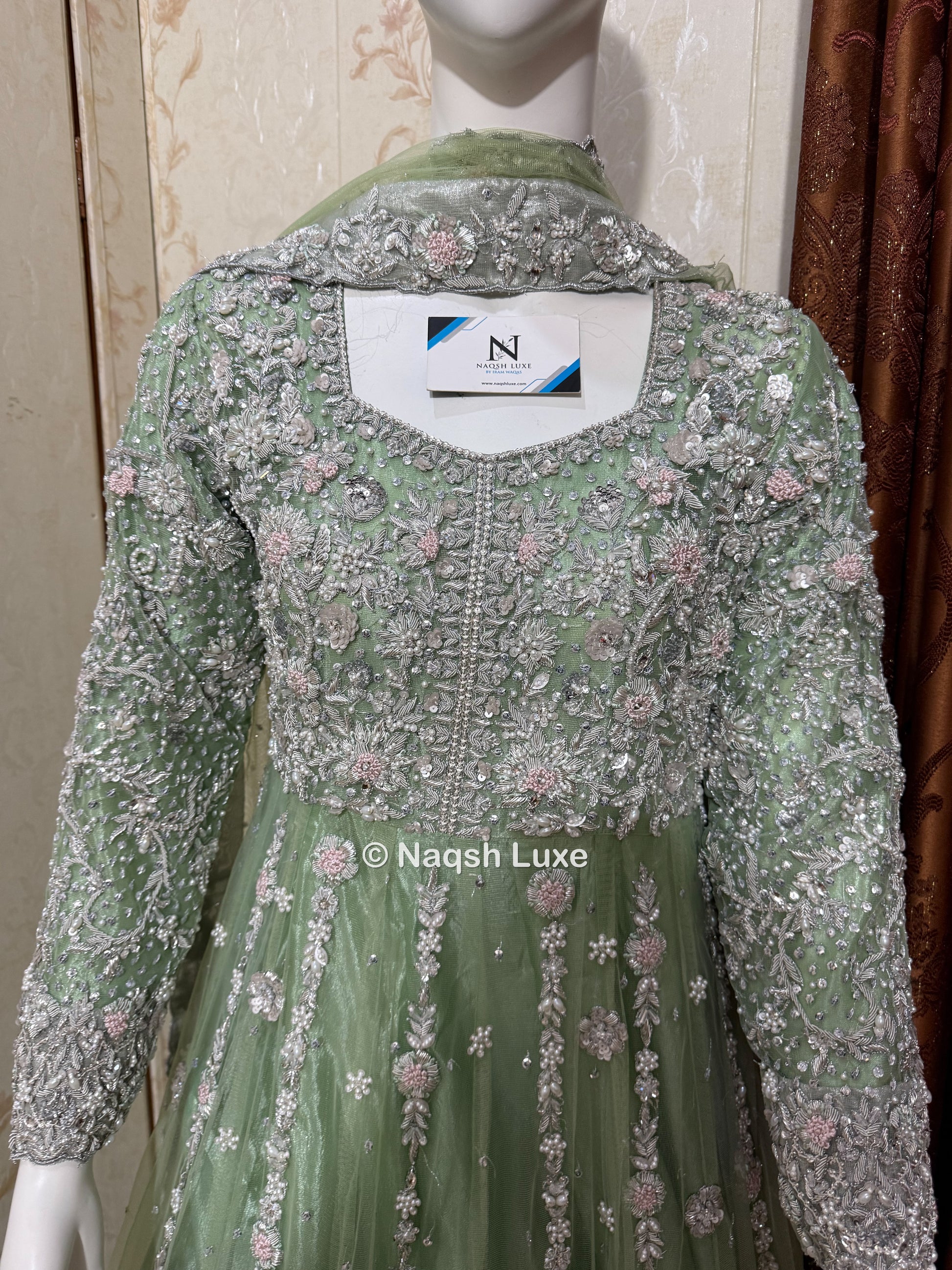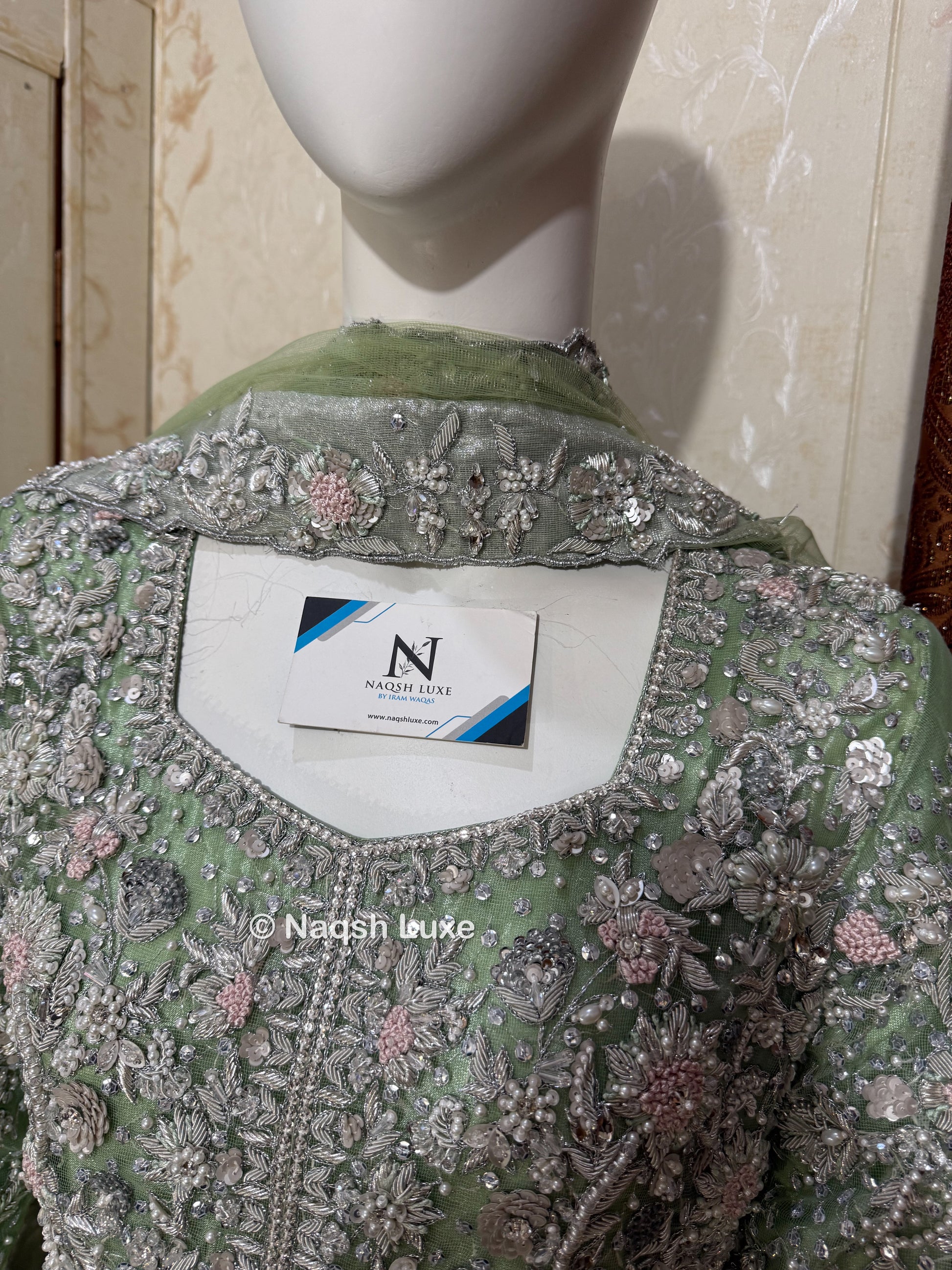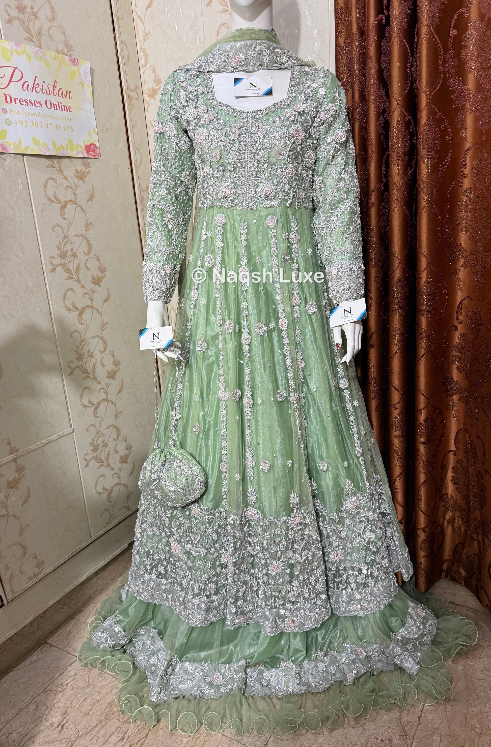 The Pakistani dress is beautifully handcrafted with zari, kora, dabka, stones, pearls and sequins. All the embellishments handsewn with double thread.