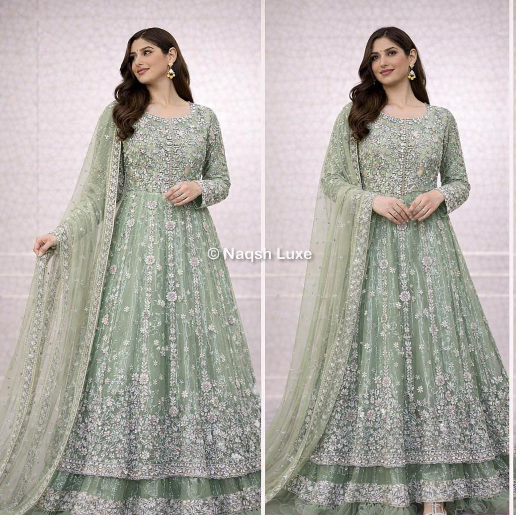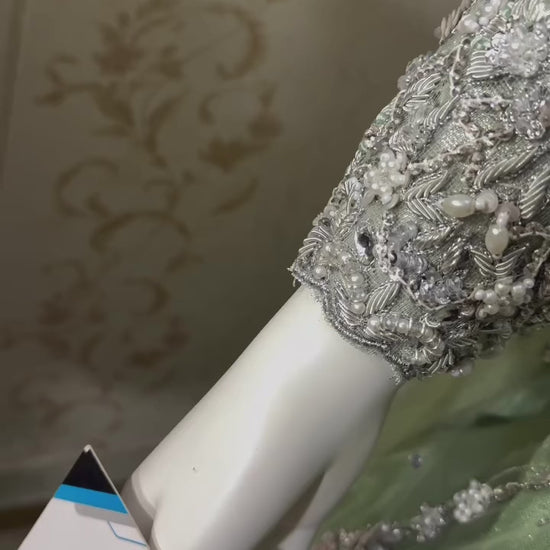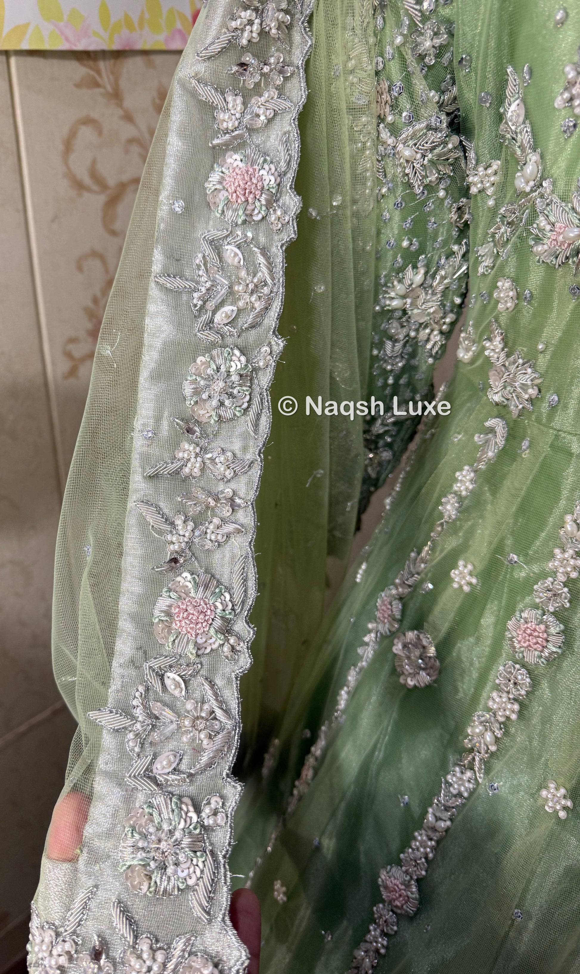 Materials Used: Dabka, zardozi, kora, sequins, crystals, pearls, tilla, stones.