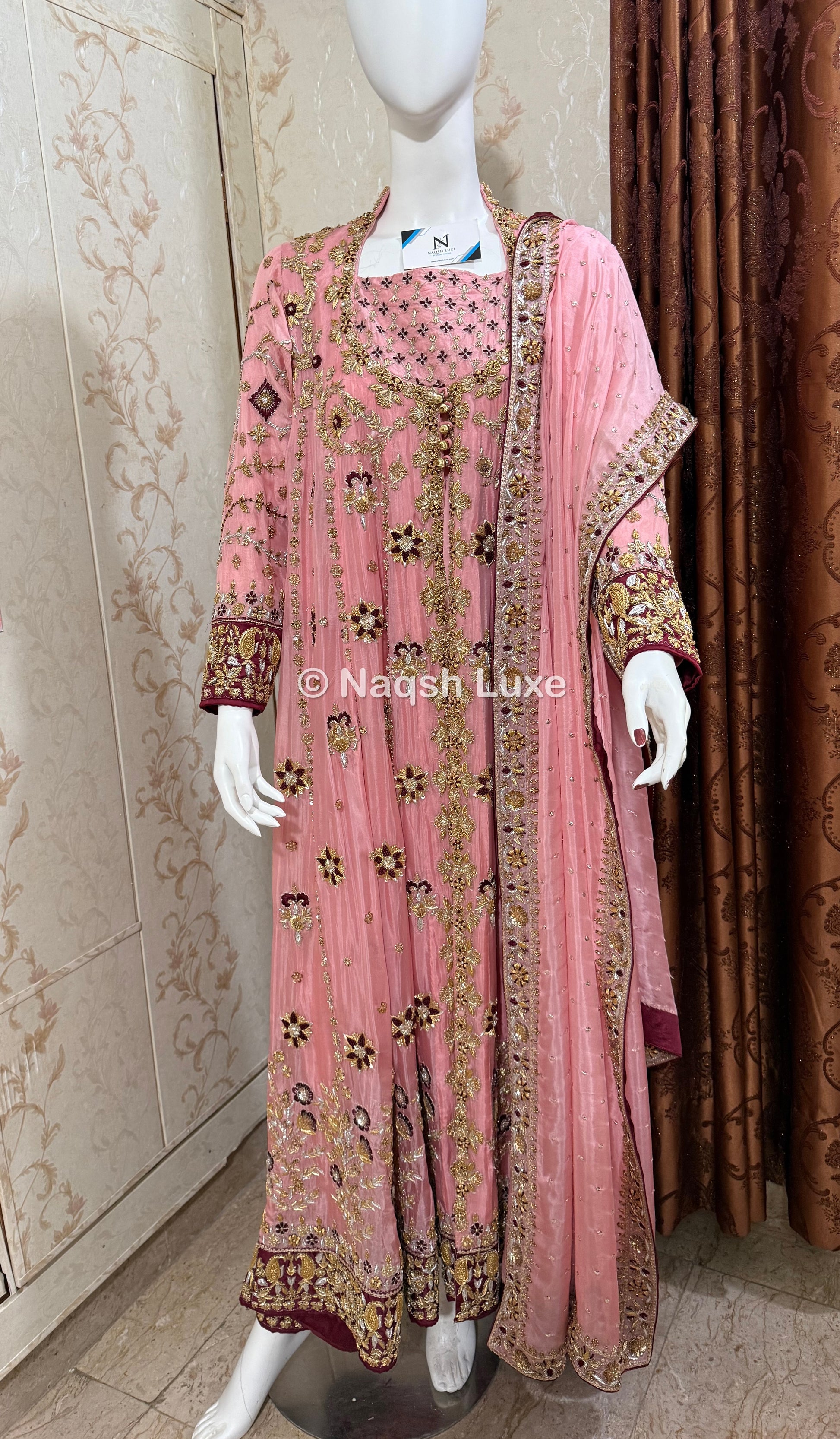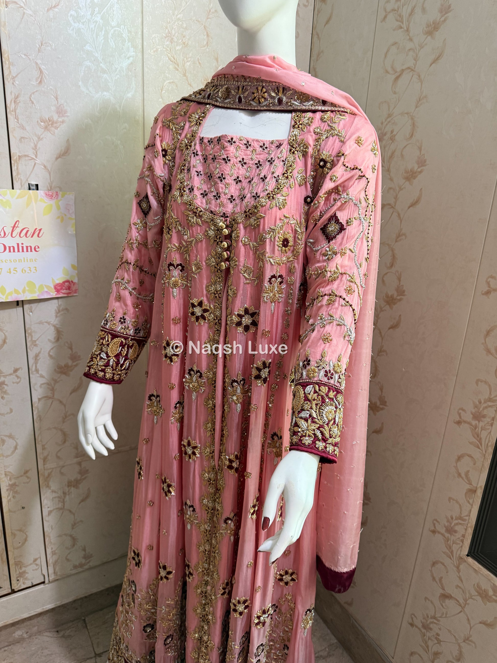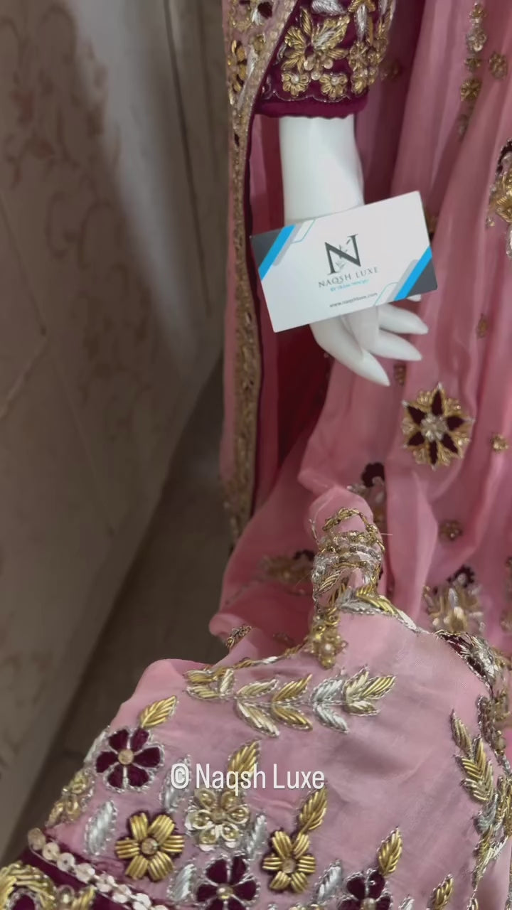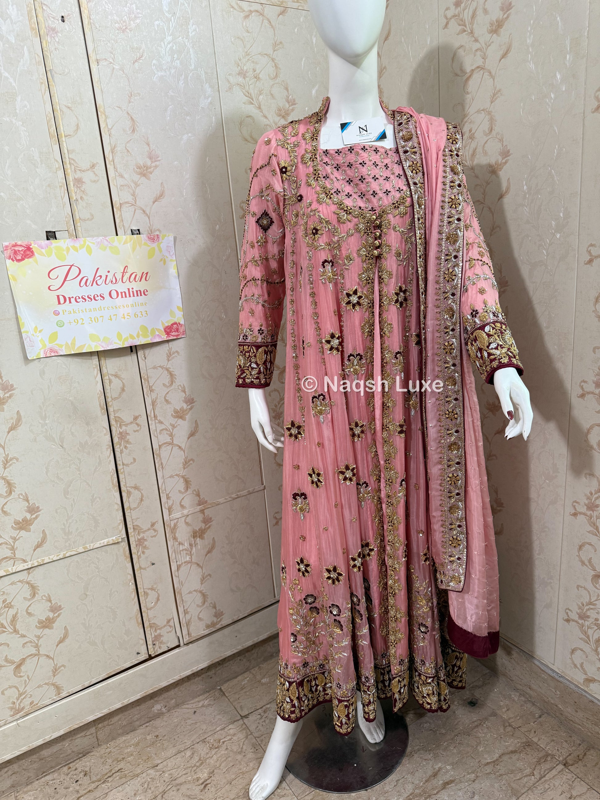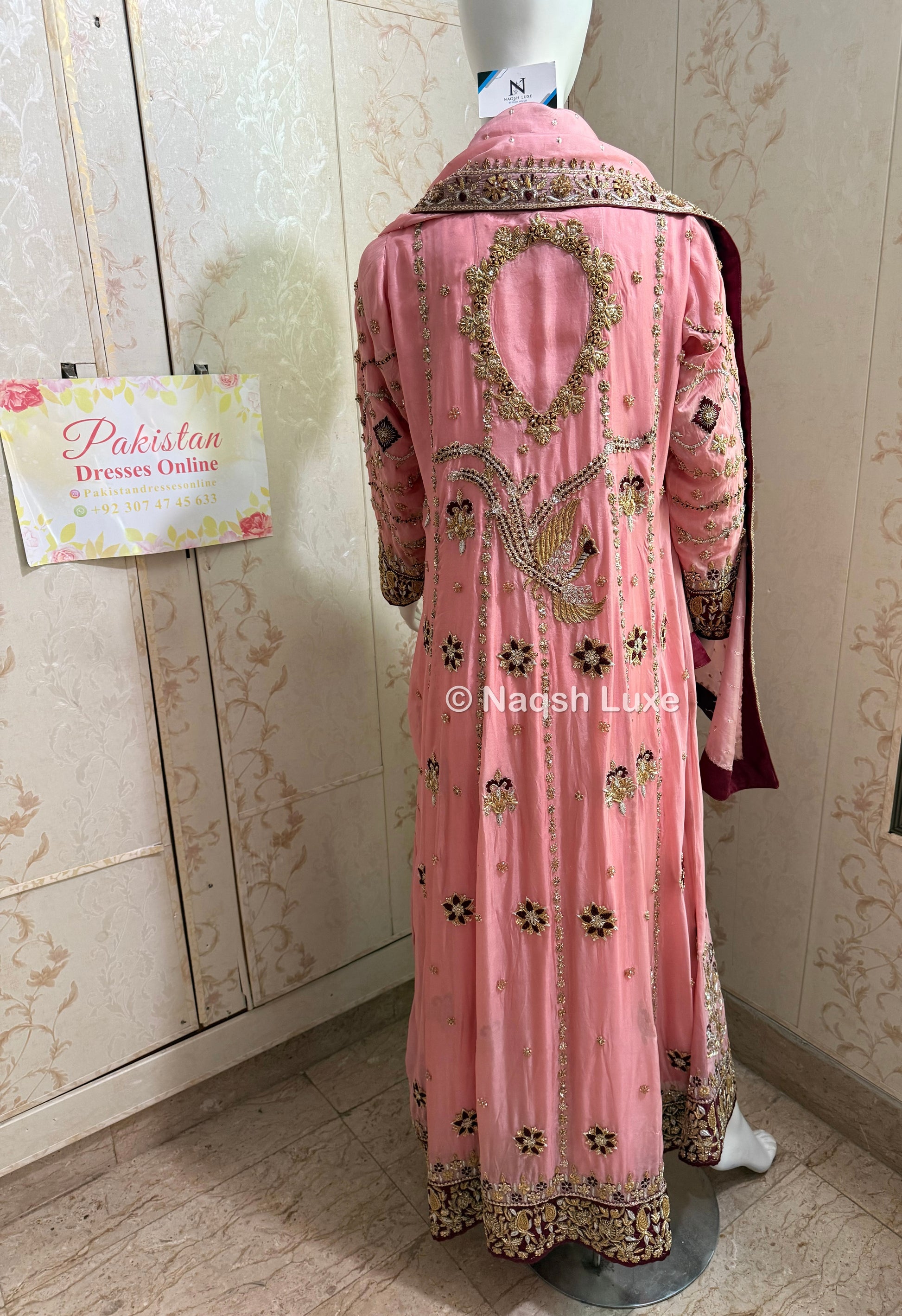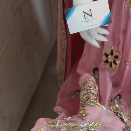 The Pakistani dress is beautifully handcrafted with zari, kora, dabka, stones, pearls and sequins. All the embellishments handsewn with double thread.