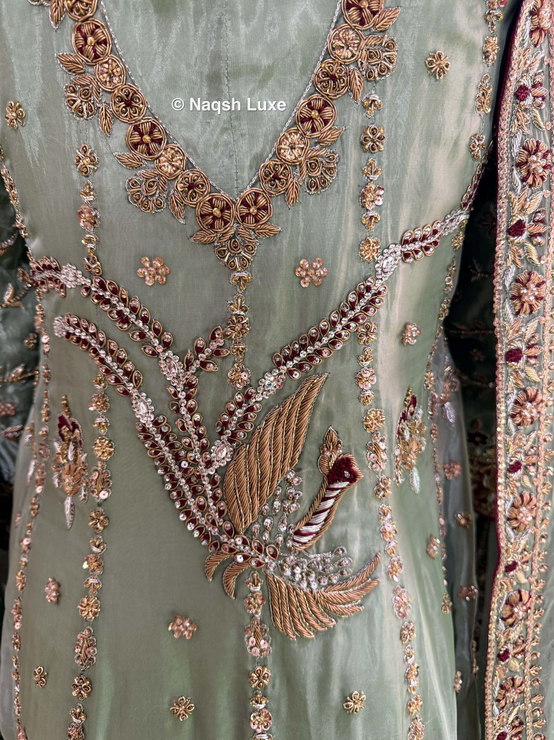 Materials Used: Dabka, zardozi, kora, sequins, crystals, pearls, tilla, stones, resham.