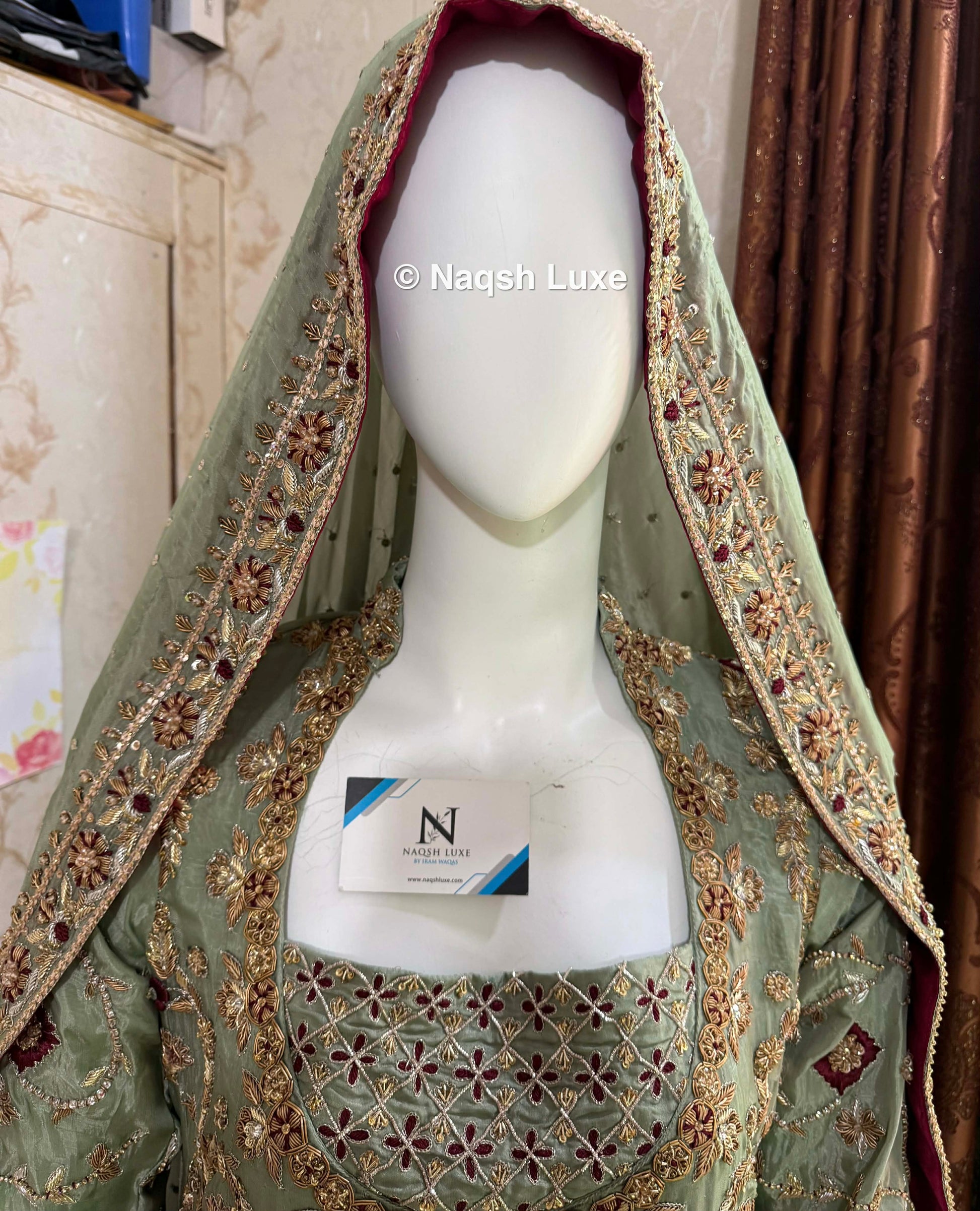 ‘The Pakistani dress is beautifully handcrafted with zari, kora, dabka, stones, pearls and sequins. All the embellishments are handsewn with double thread.
