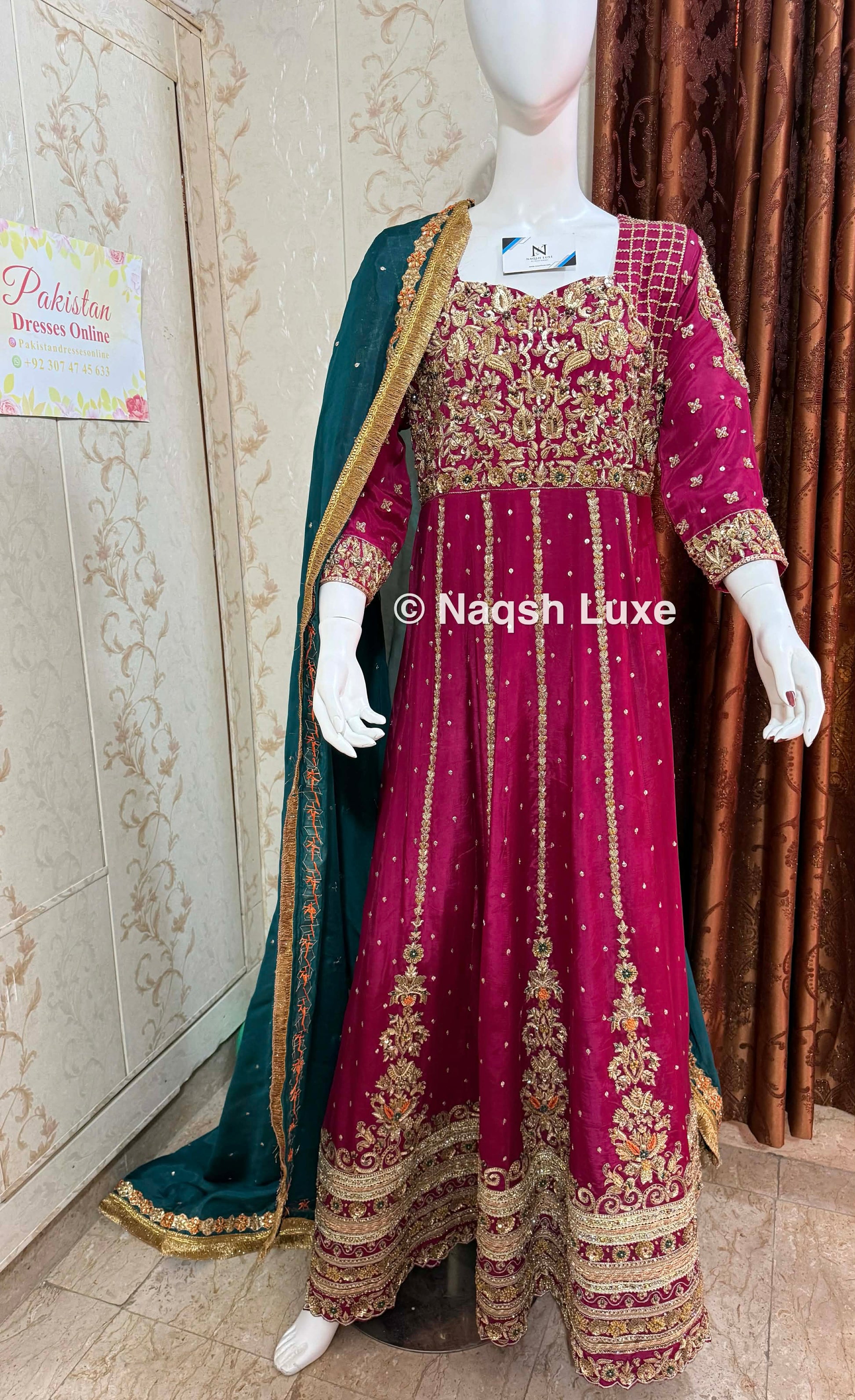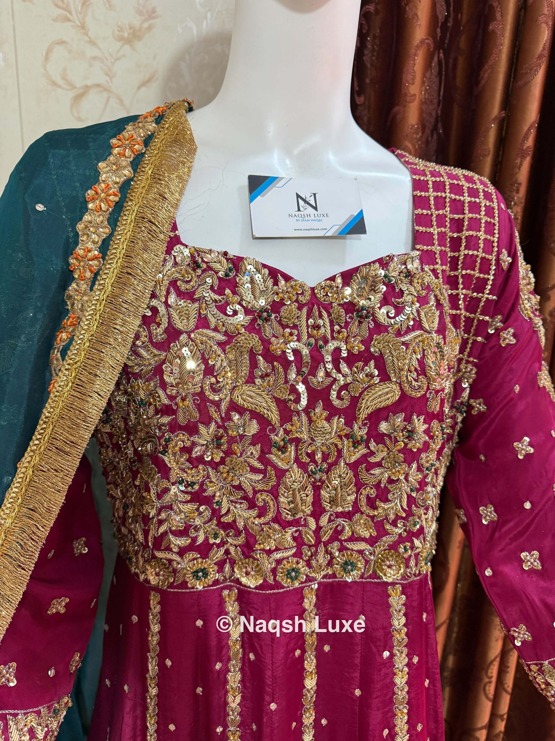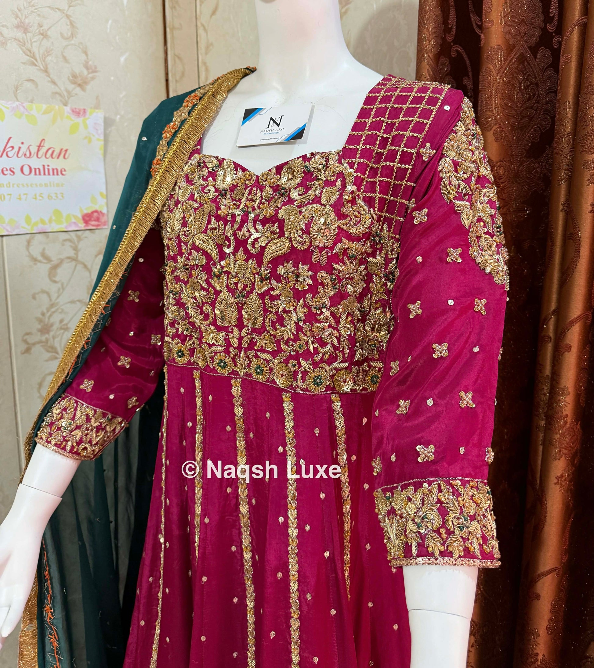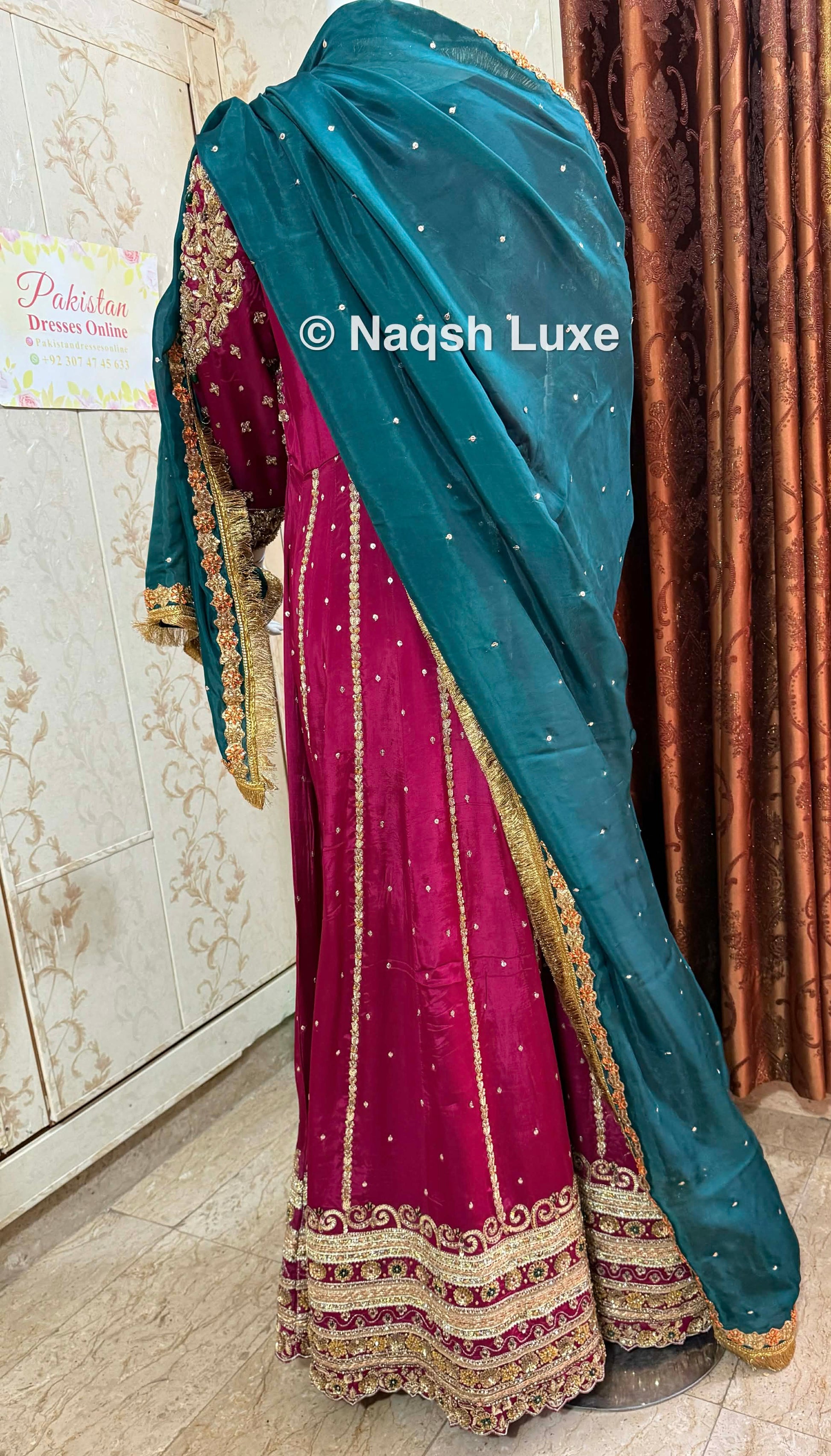 ‘The Pakistani dress is beautifully handcrafted with zari, kora, dabka, stones, pearls and sequins. All the embellishments are handsewn with double thread.