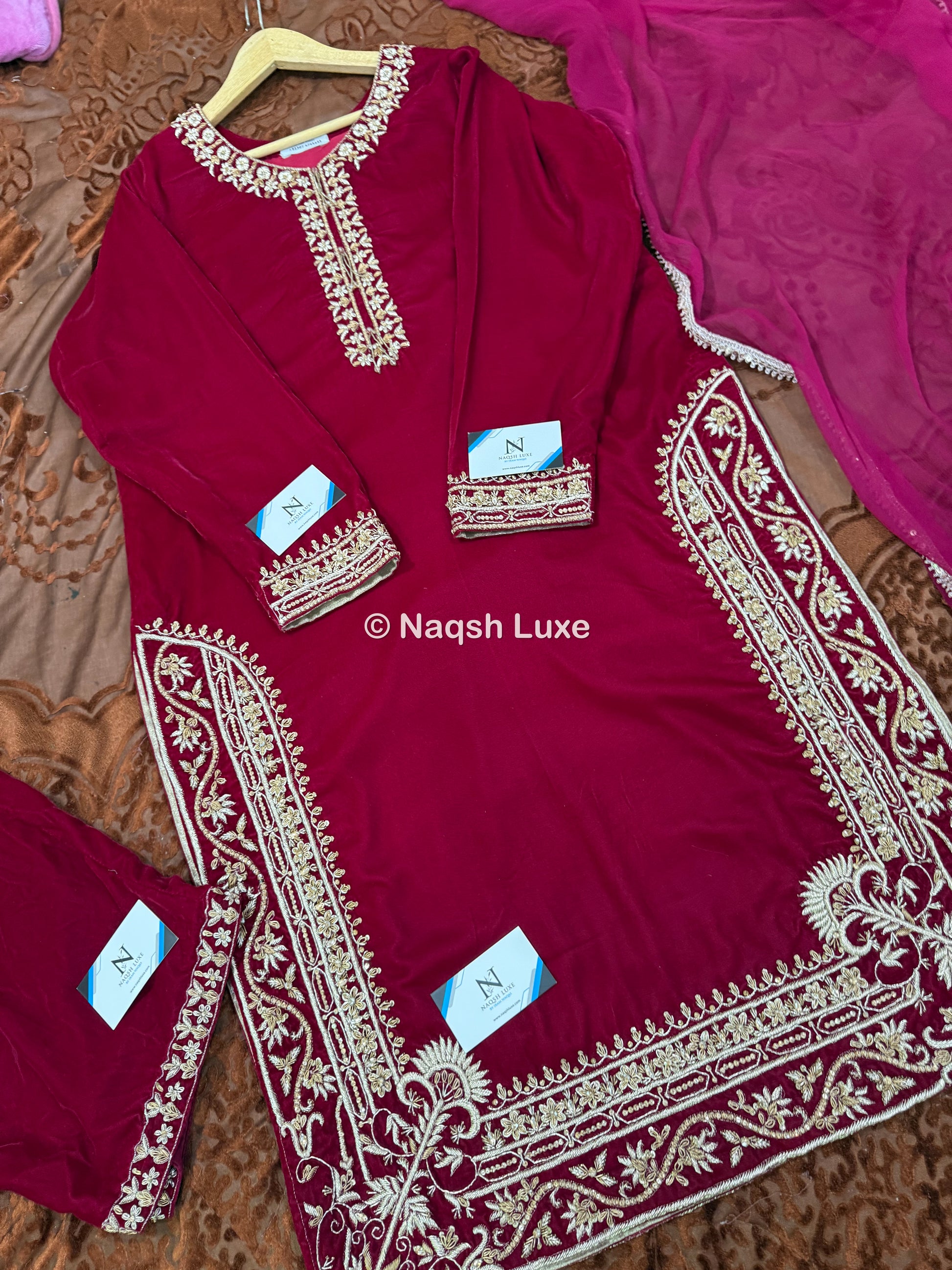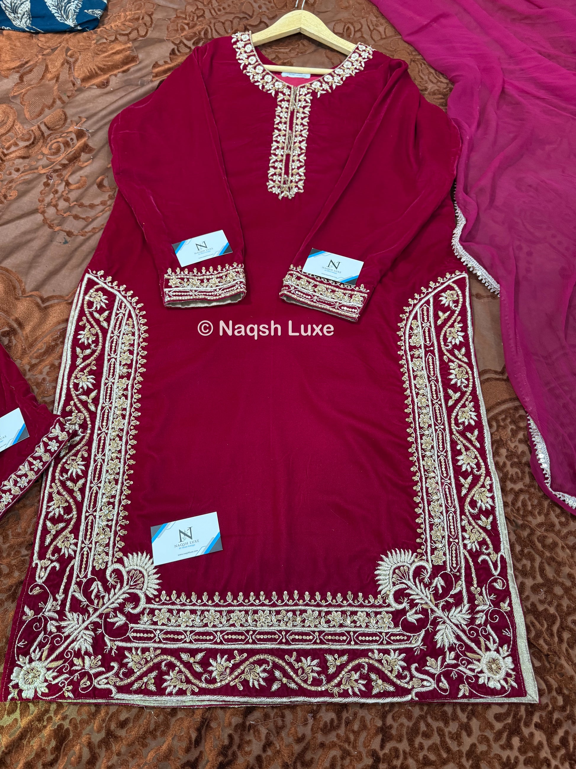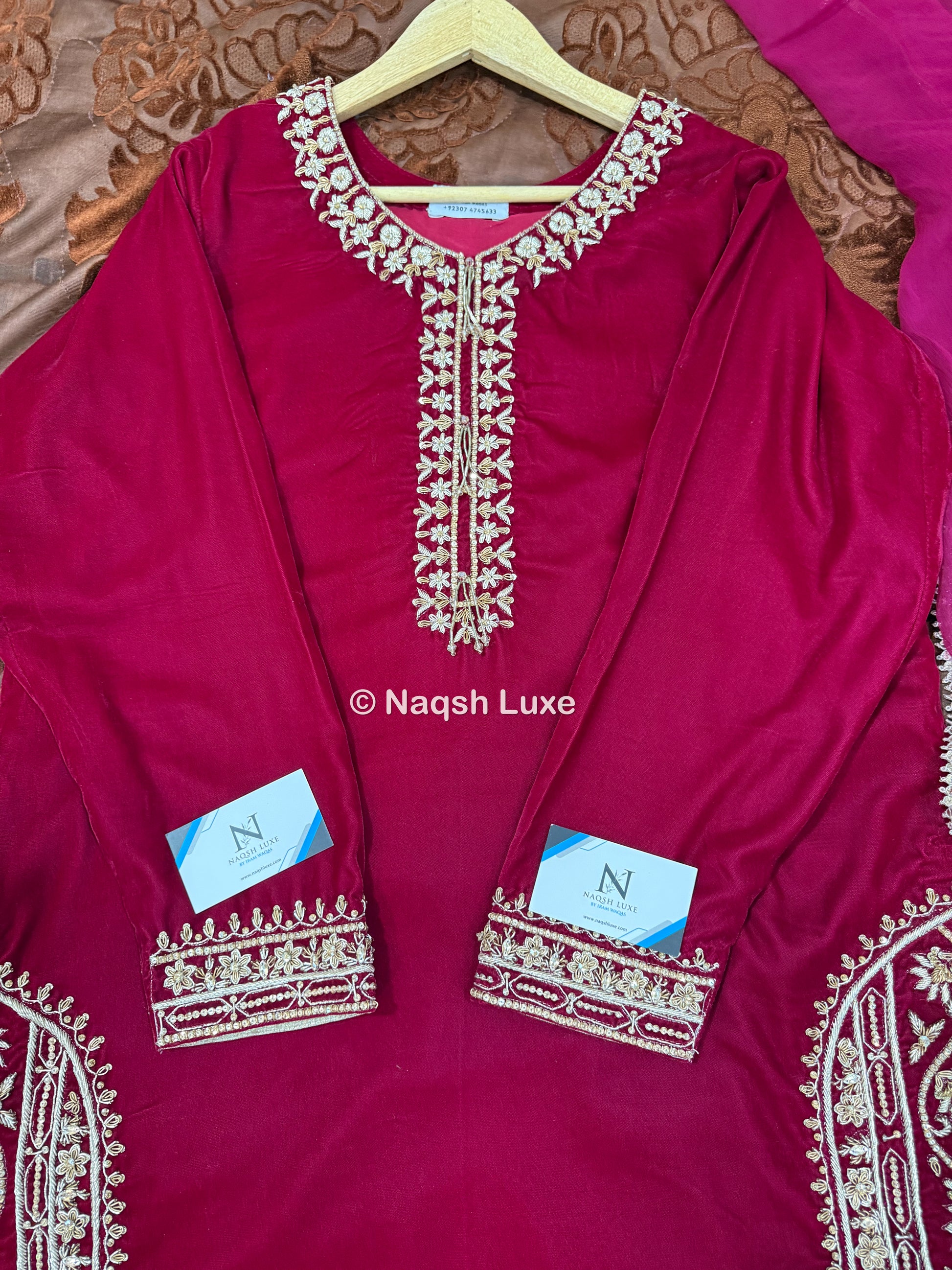 The Pakistani dress is beautifully handcrafted with zari, kora, dabka, stones, pearls and sequins. All the embellishments handsewn with double thread.