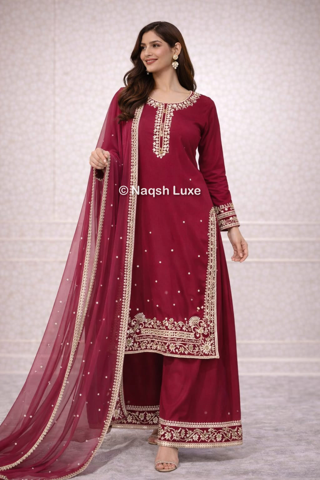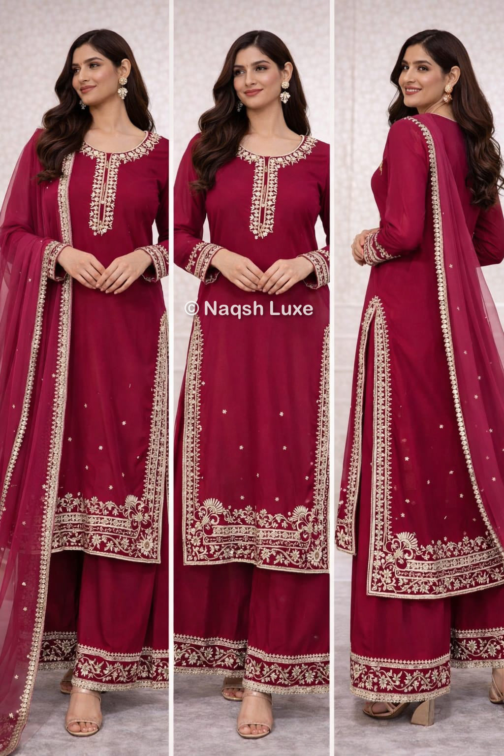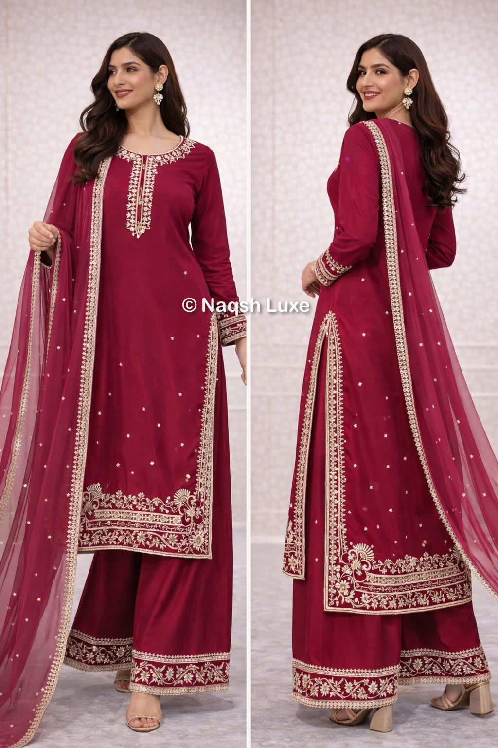 The Pakistani dress is beautifully handcrafted with zari, kora, dabka, stones, pearls and sequins. All the embellishments handsewn with double thread.