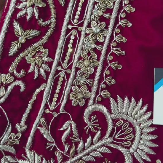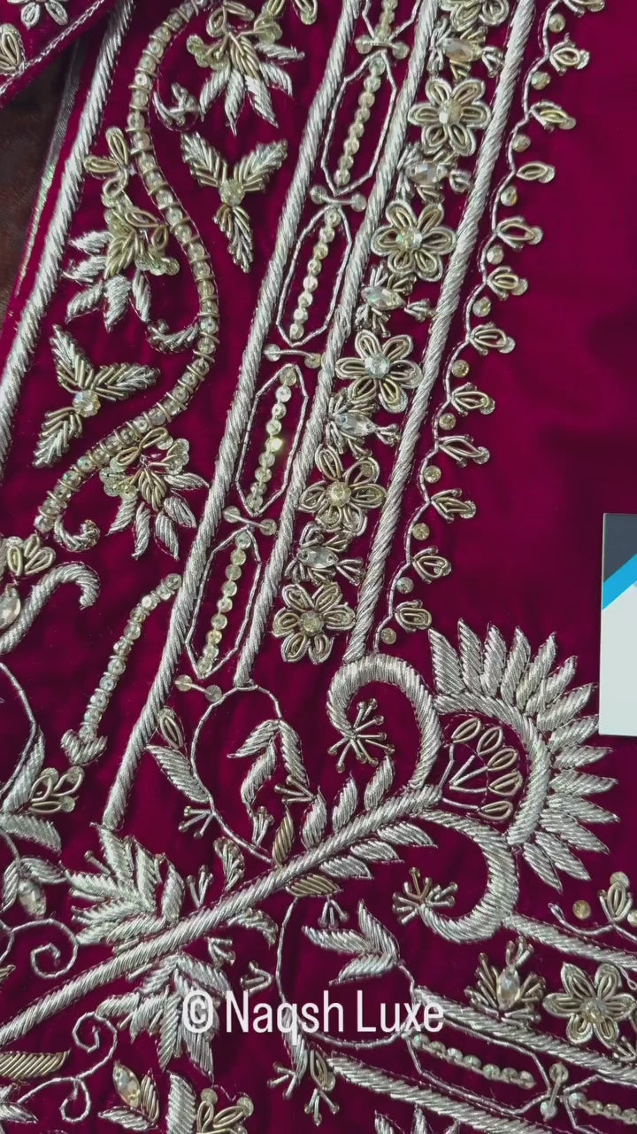 Materials Used: Dabka, zardozi, kora, sequins, crystals, pearls, tilla, stones.