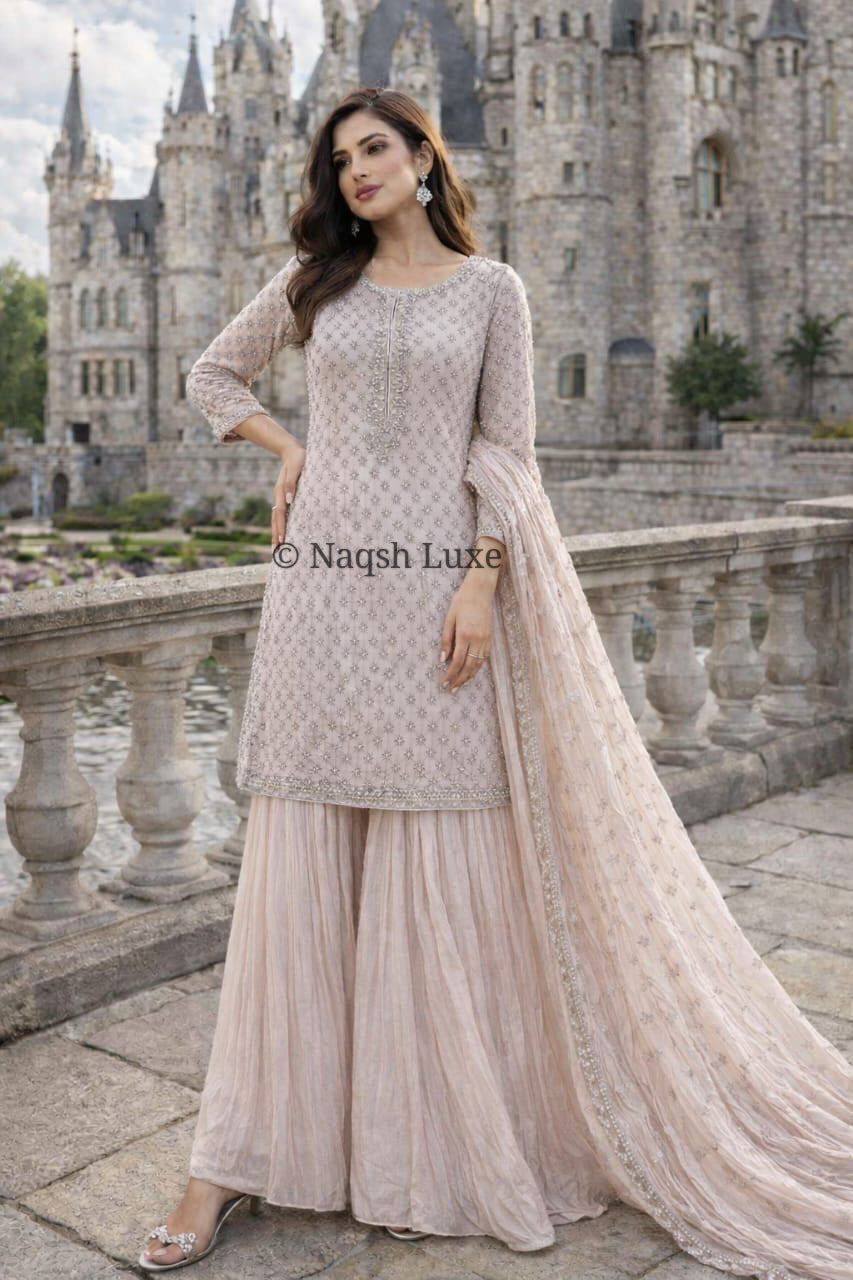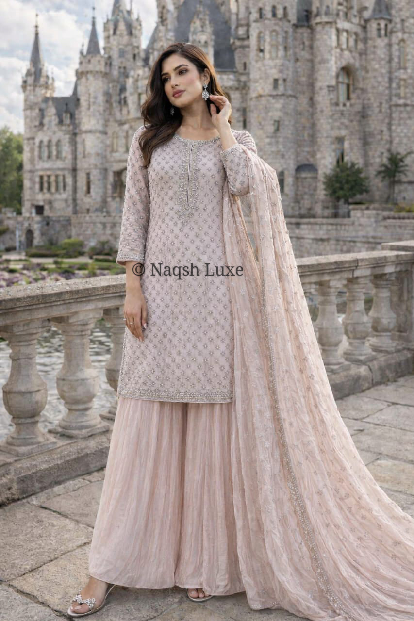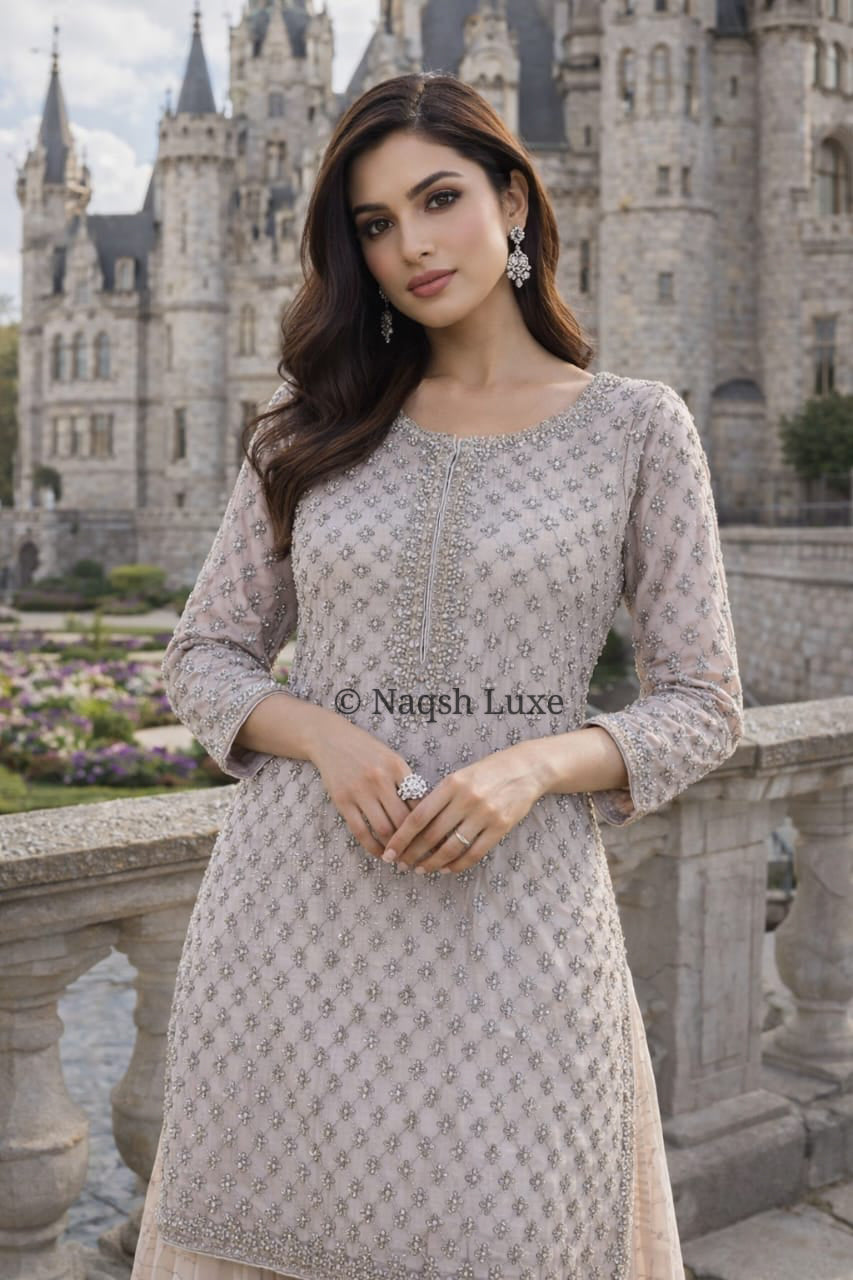 ‘The Pakistani dress is beautifully handcrafted with zari, kora, dabka, stones, pearls and sequins. All the embellishments are handsewn with double thread.