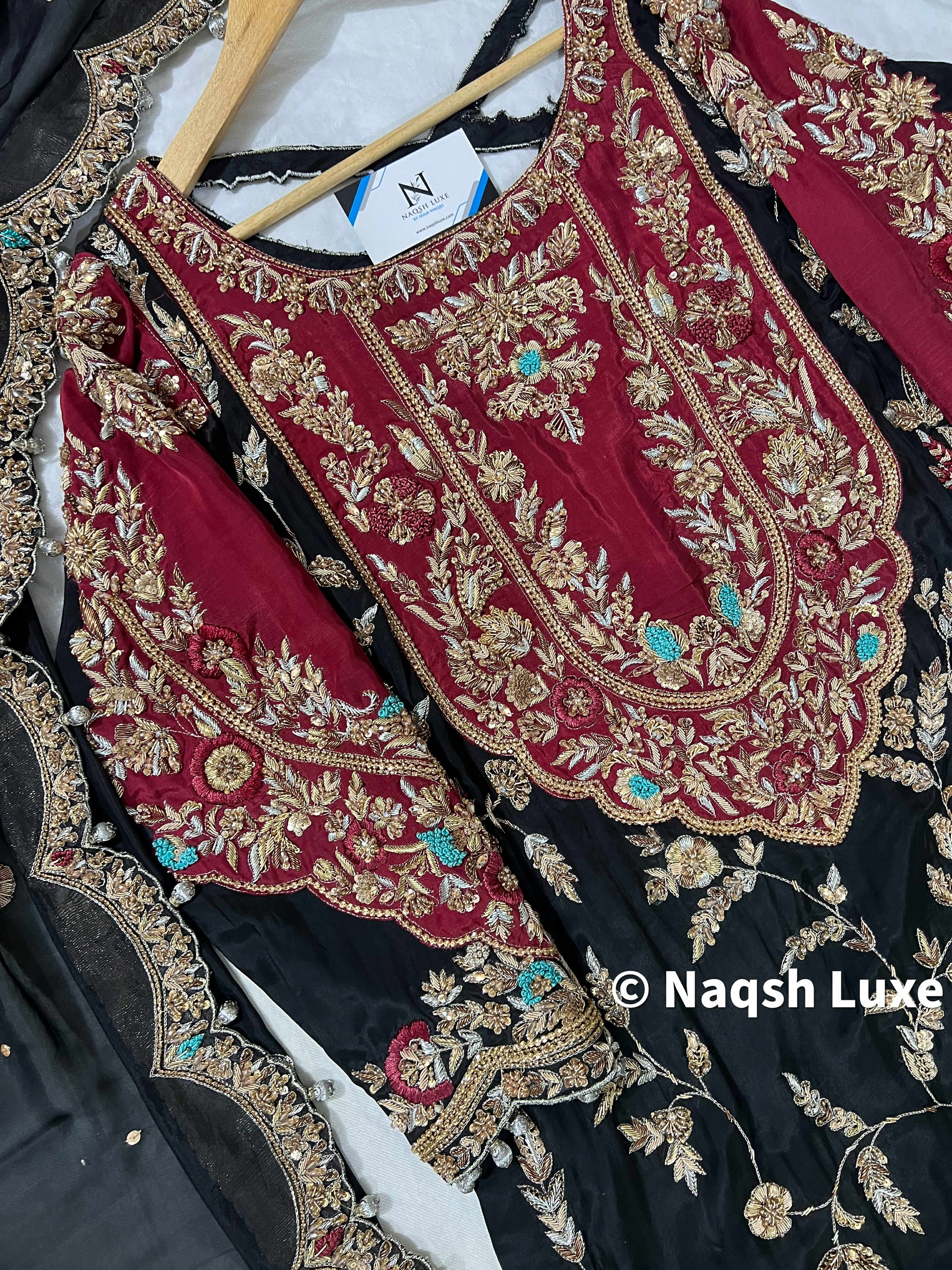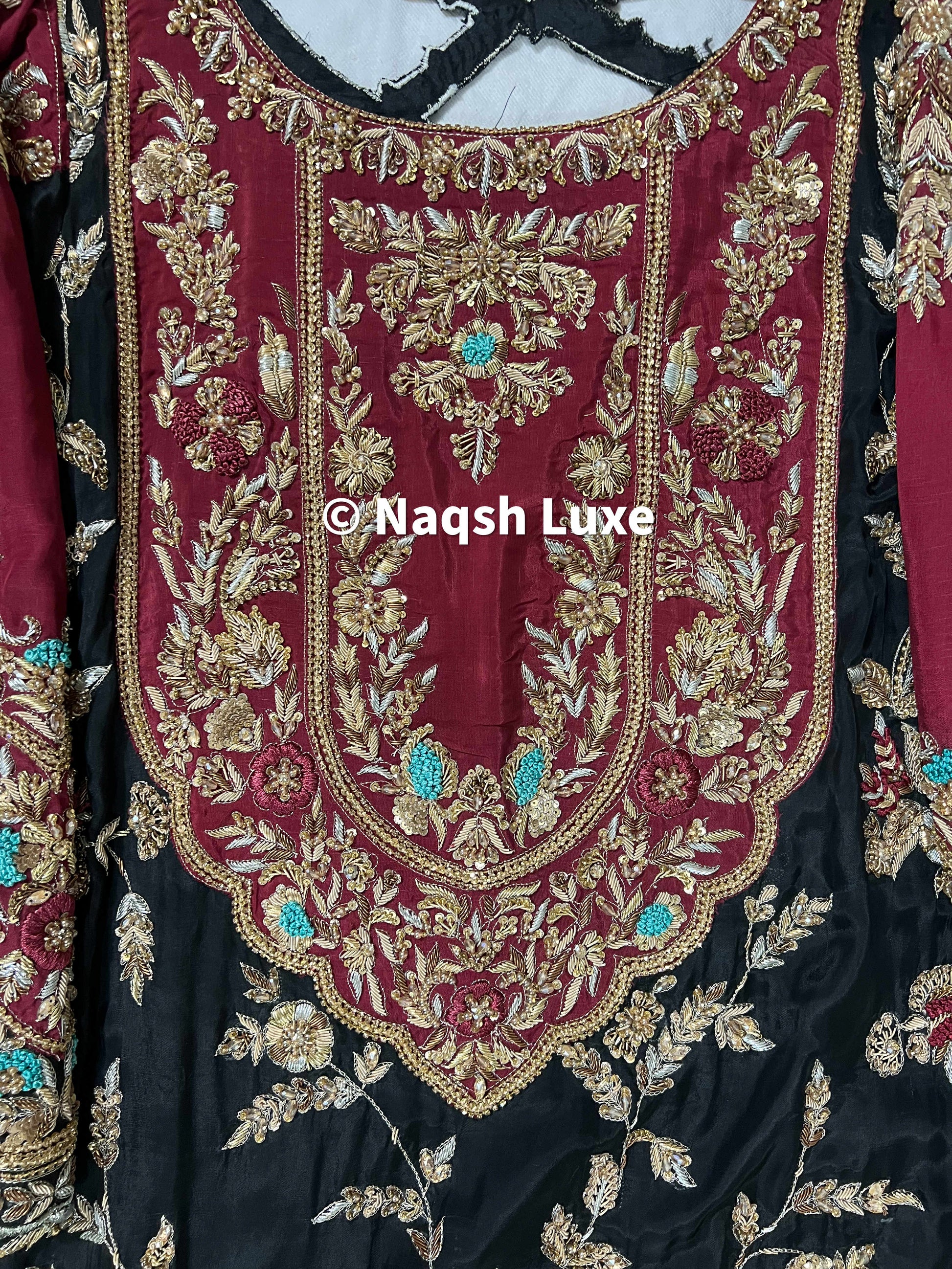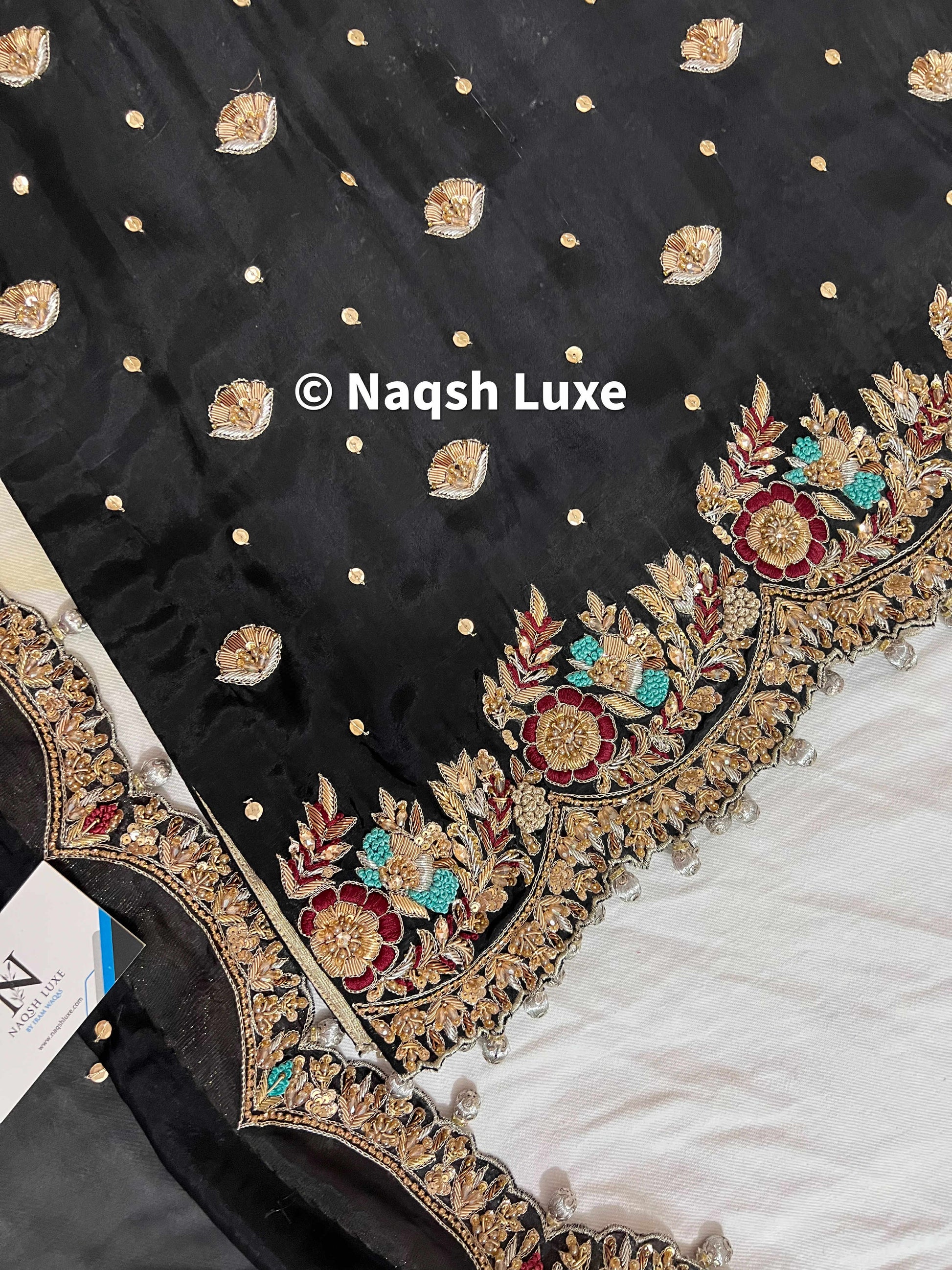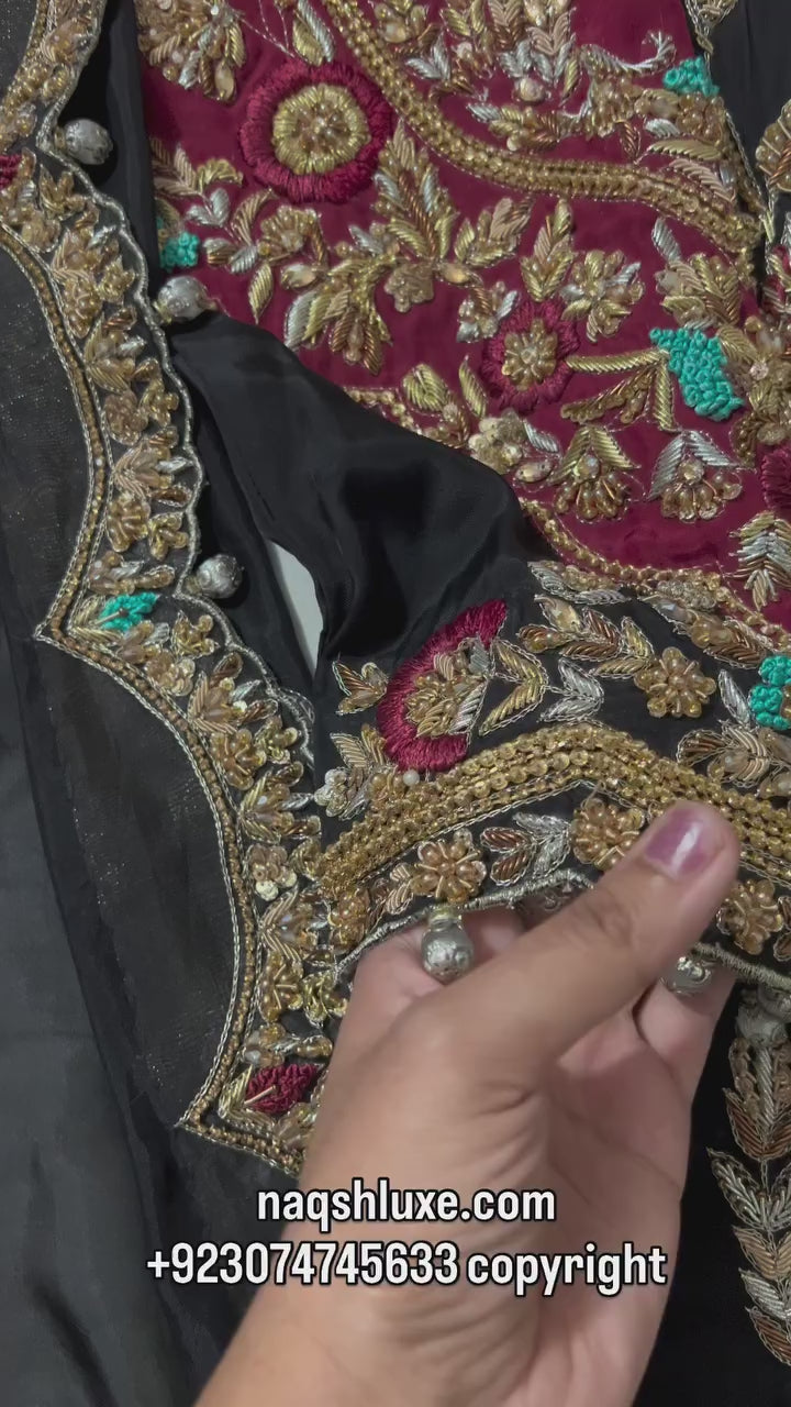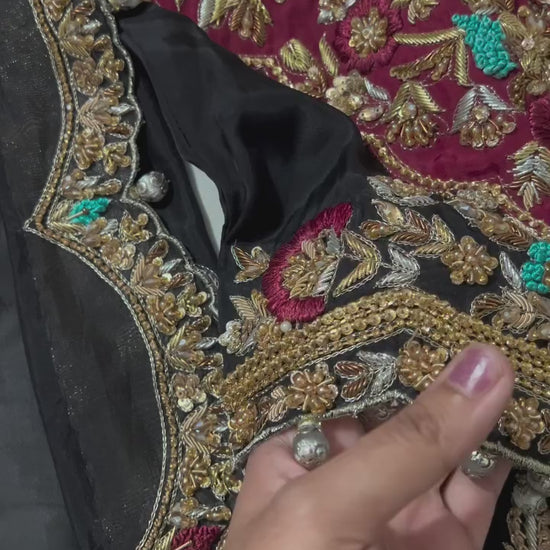 Materials Used: Dabka, zardozi, kora, sequins, crystals, pearls, tilla, stones, resham.