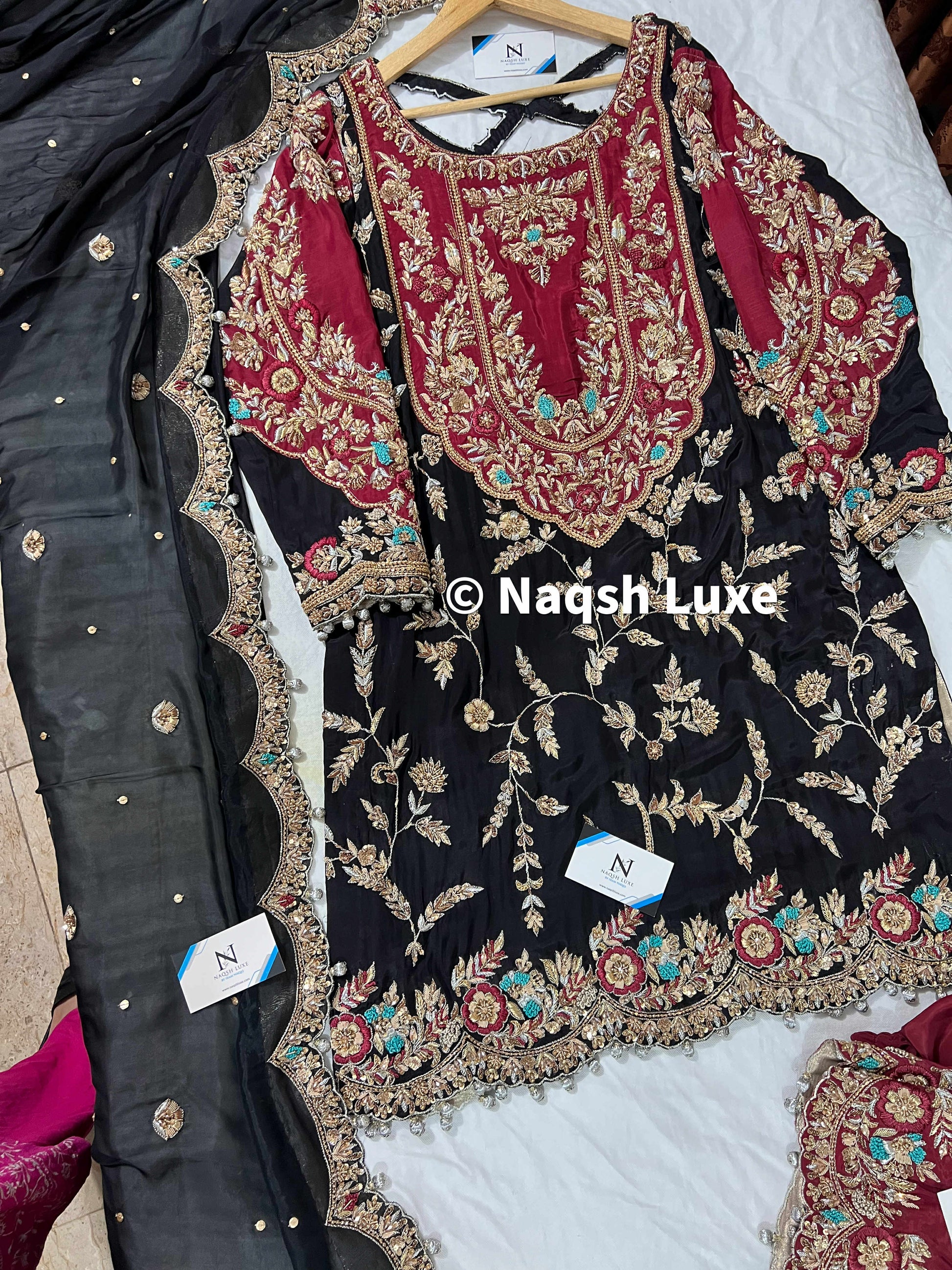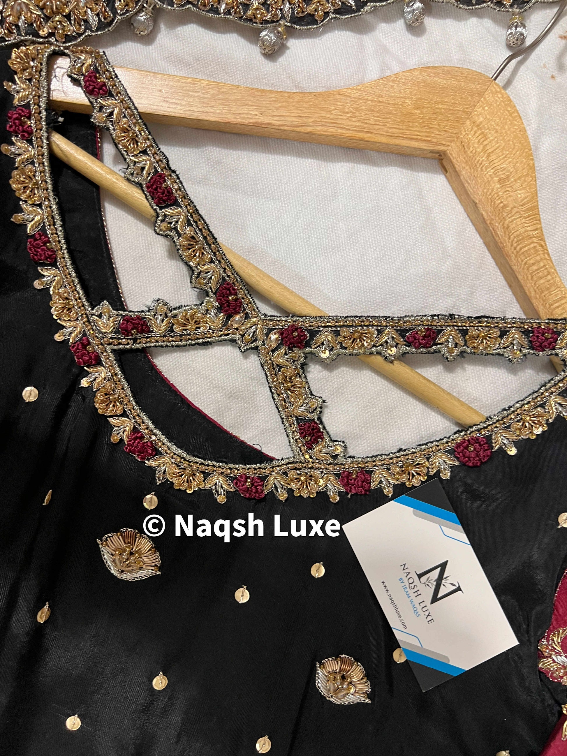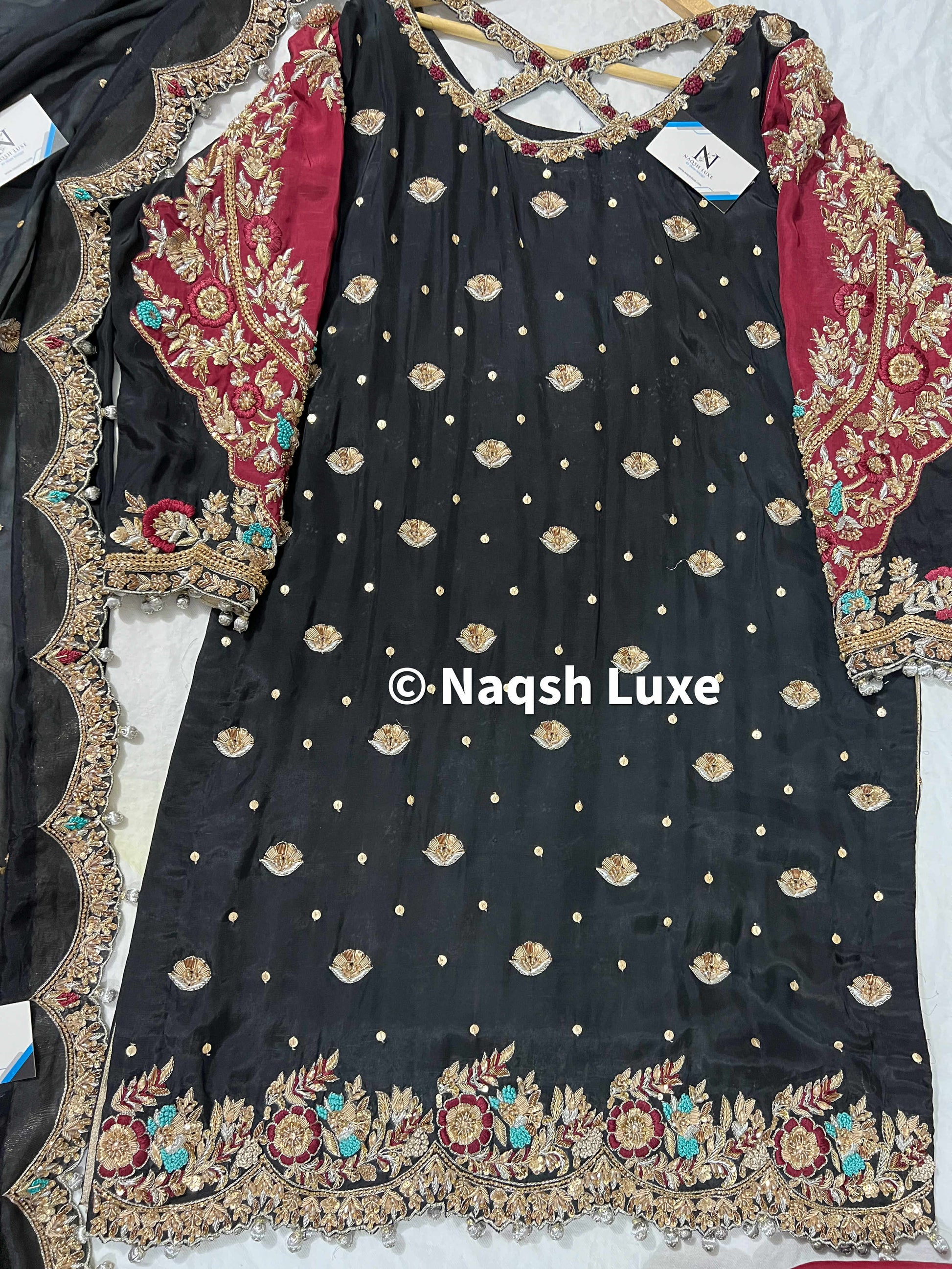 Materials Used: Dabka, zardozi, kora, sequins, crystals, pearls, tilla, stones, resham.