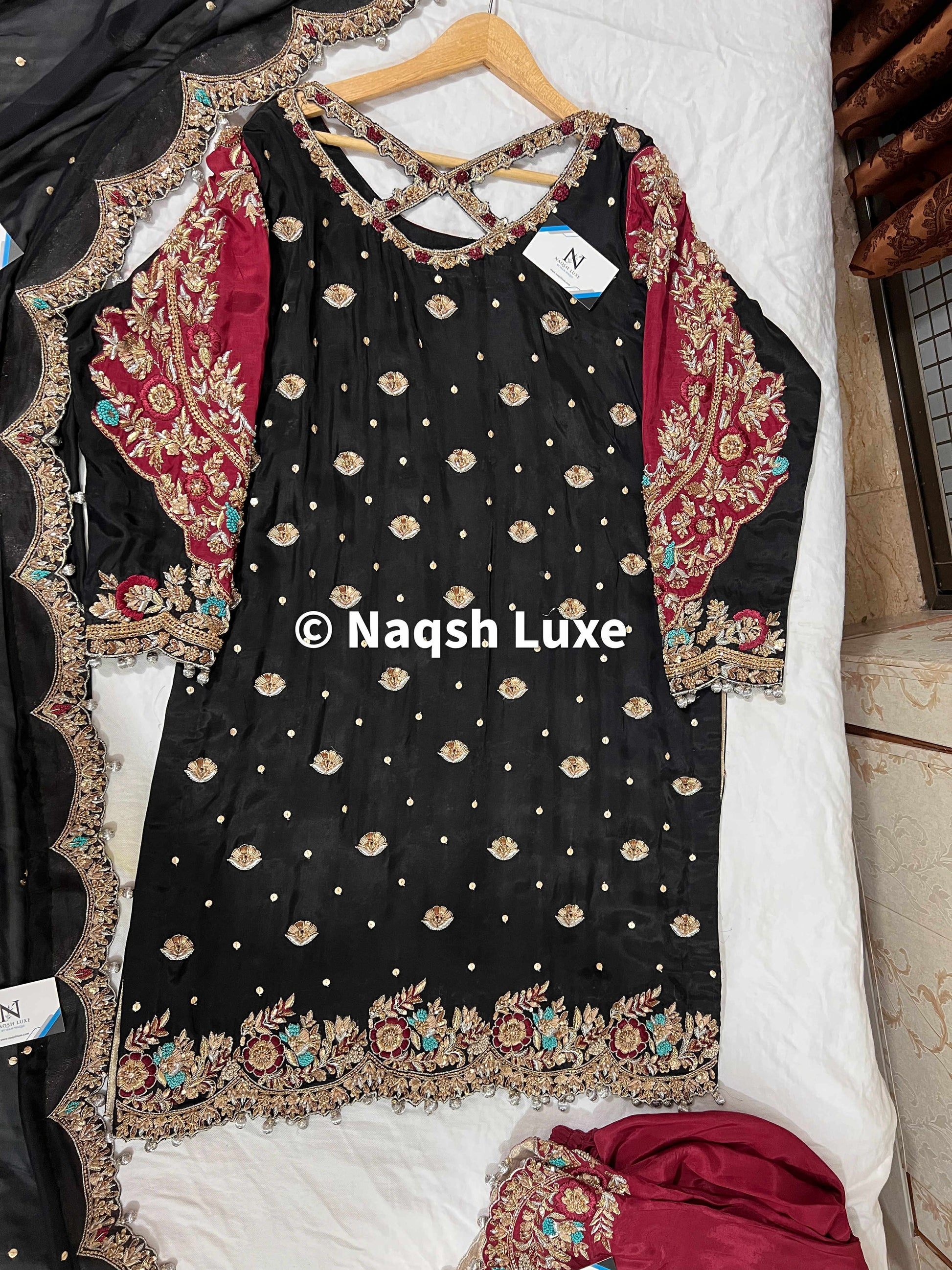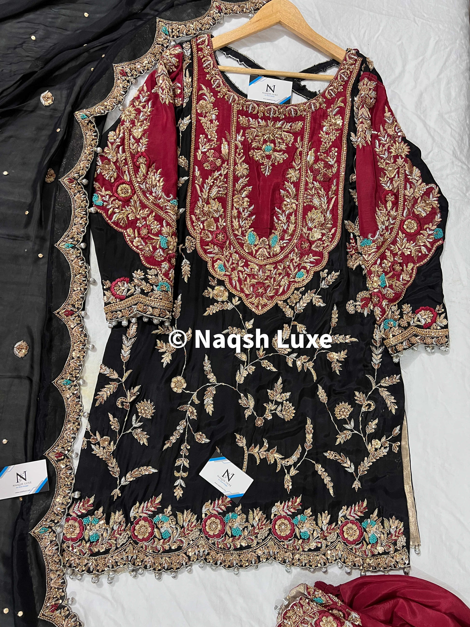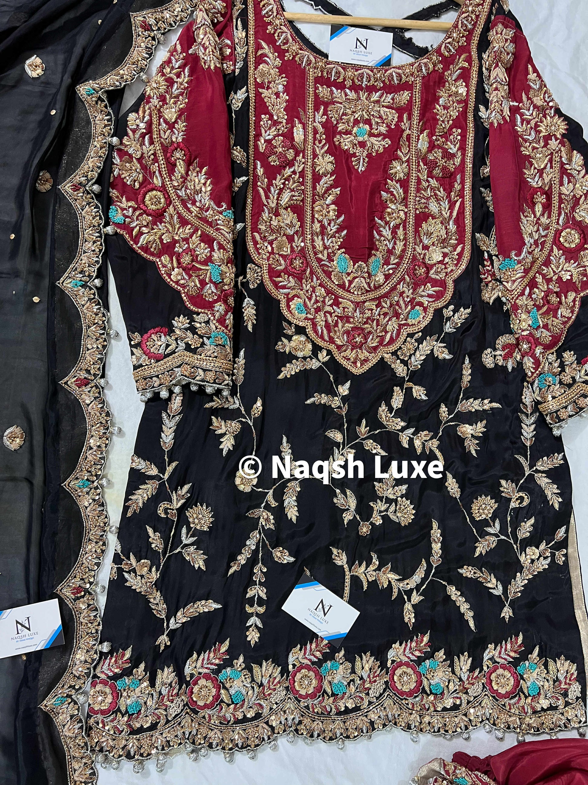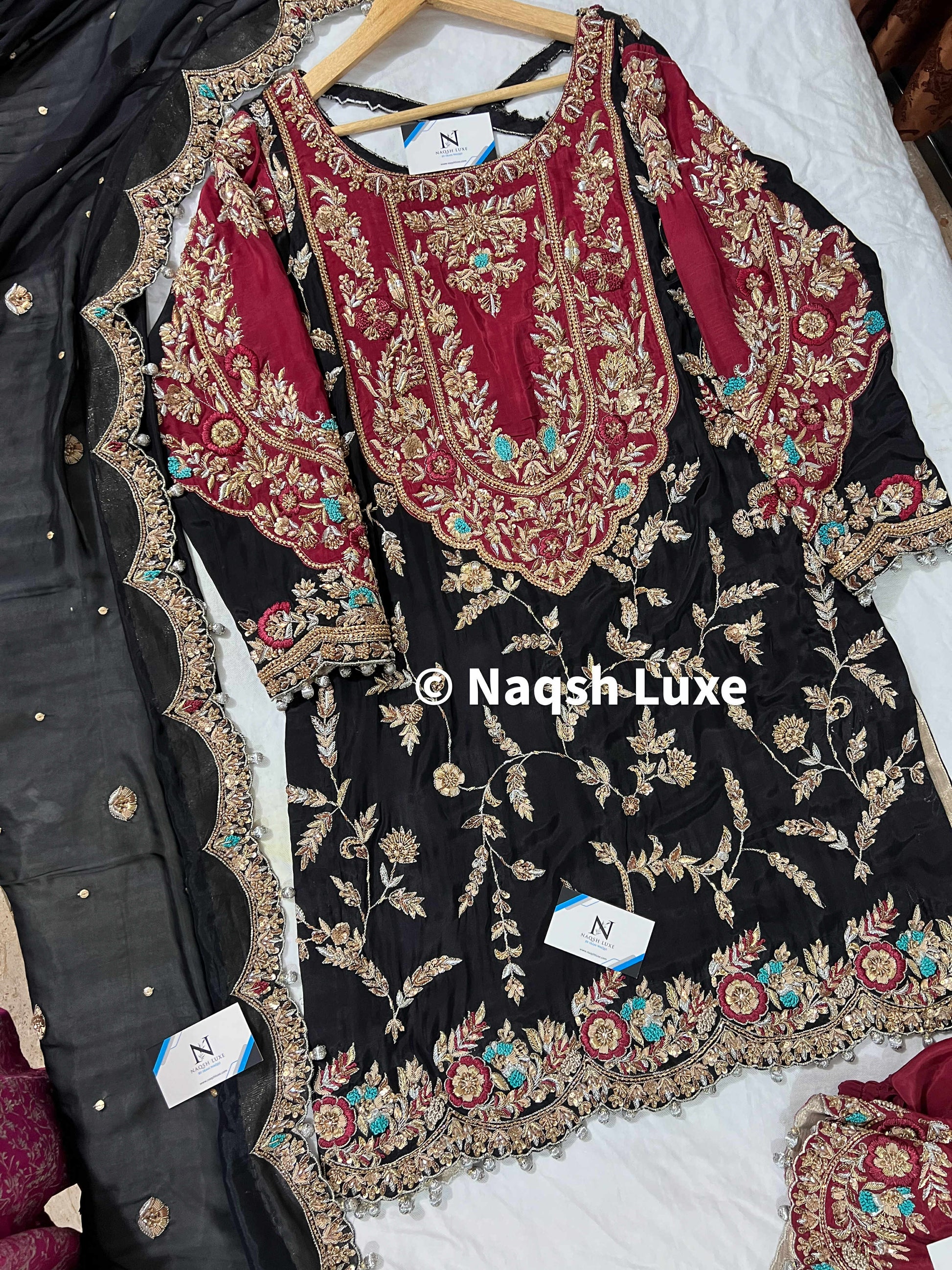 Materials Used: Dabka, zardozi, kora, sequins, crystals, pearls, tilla, stones, resham.
