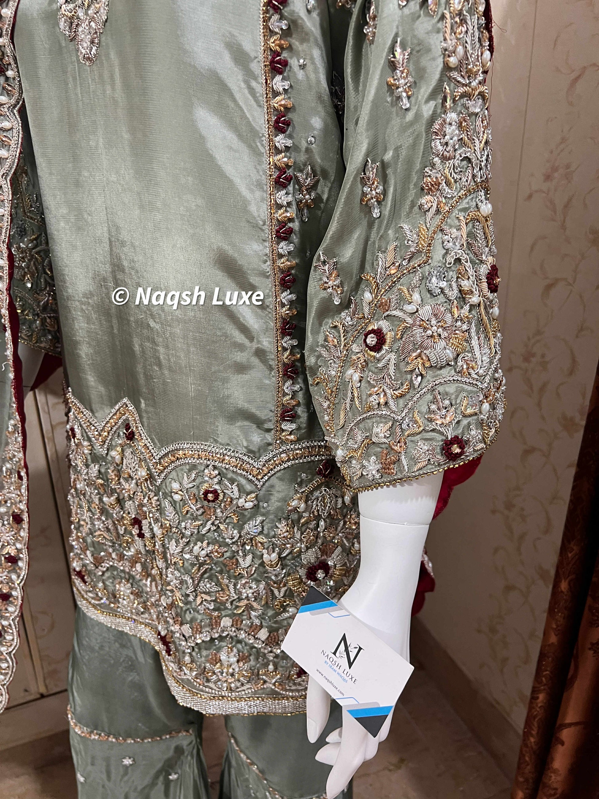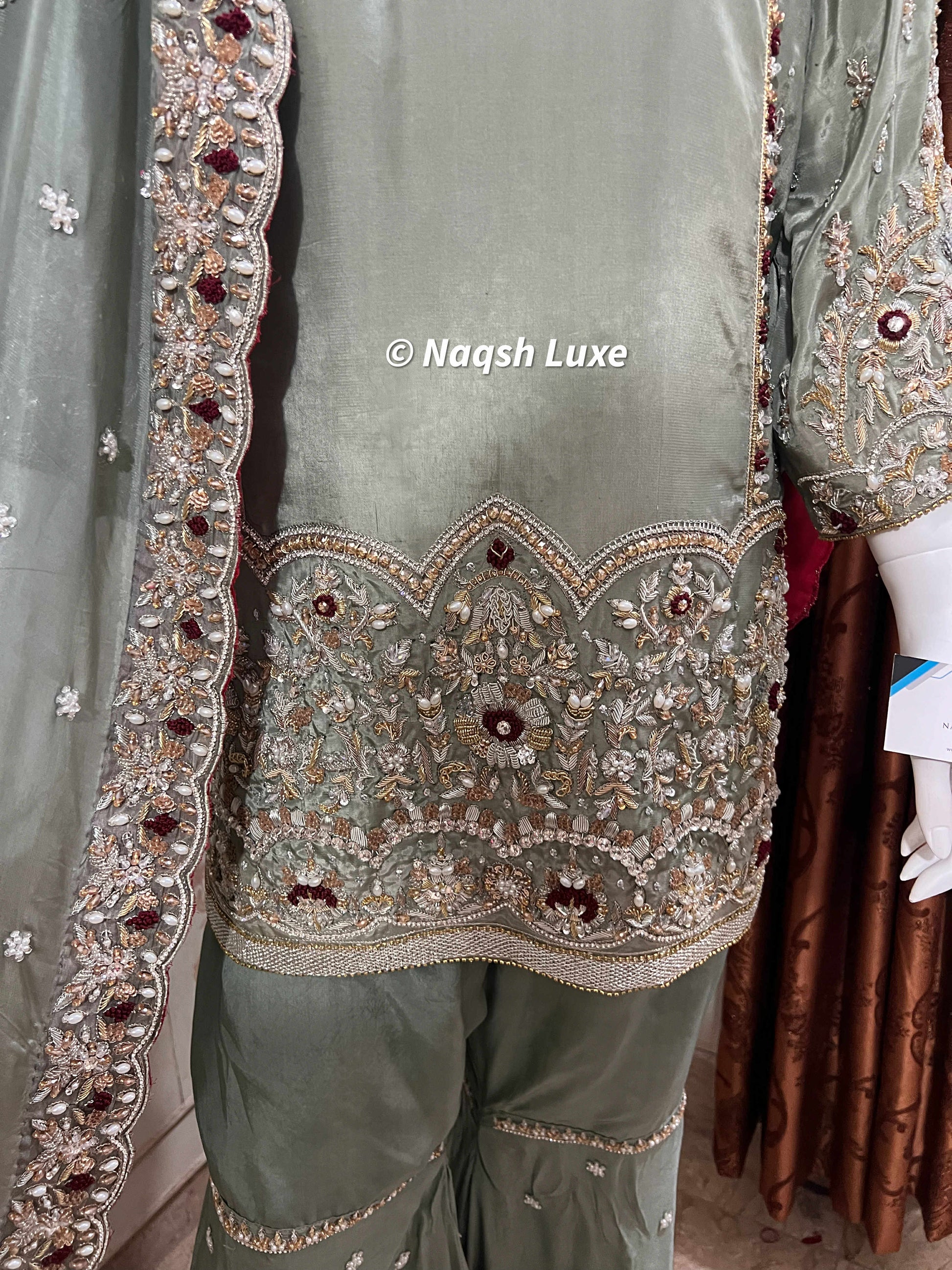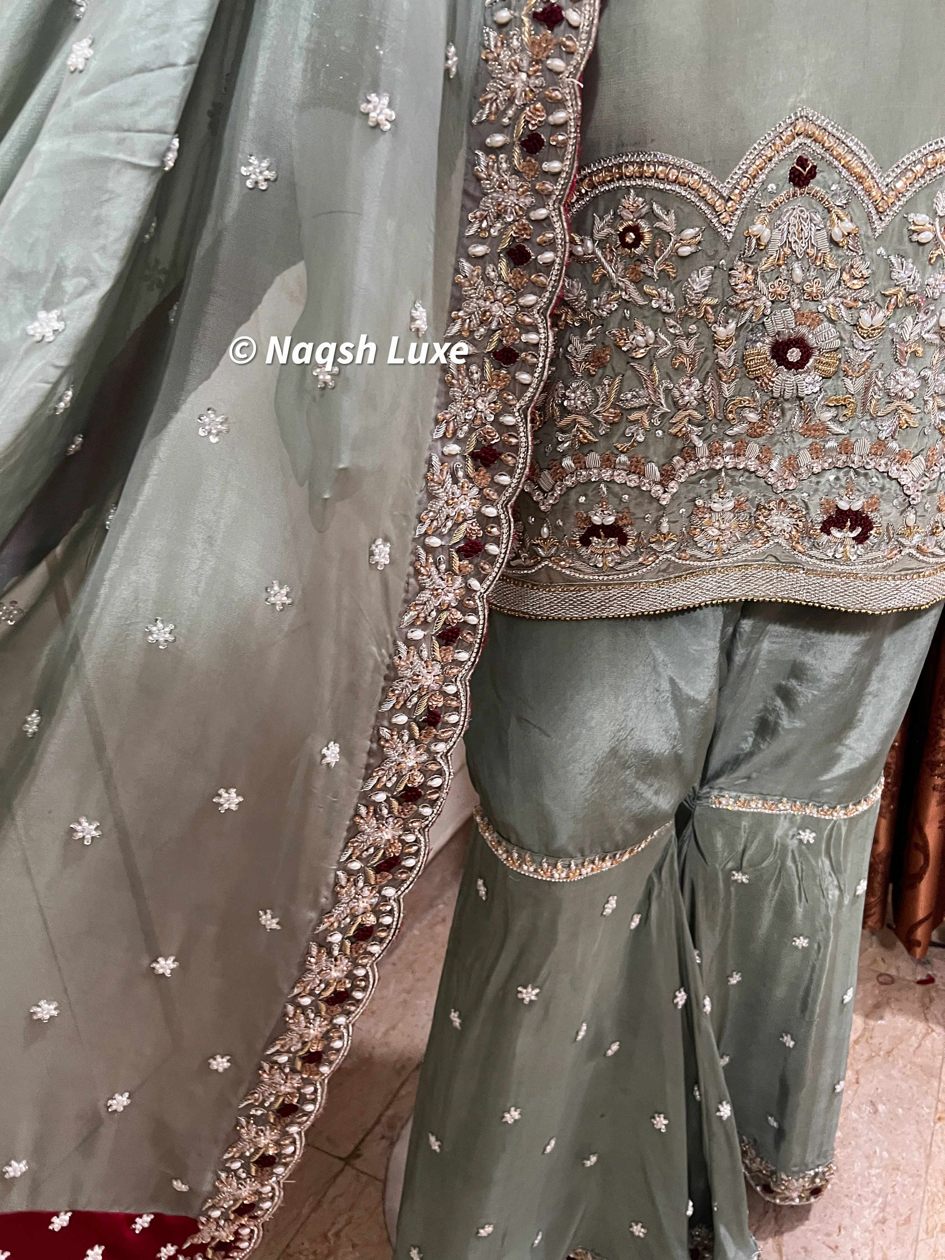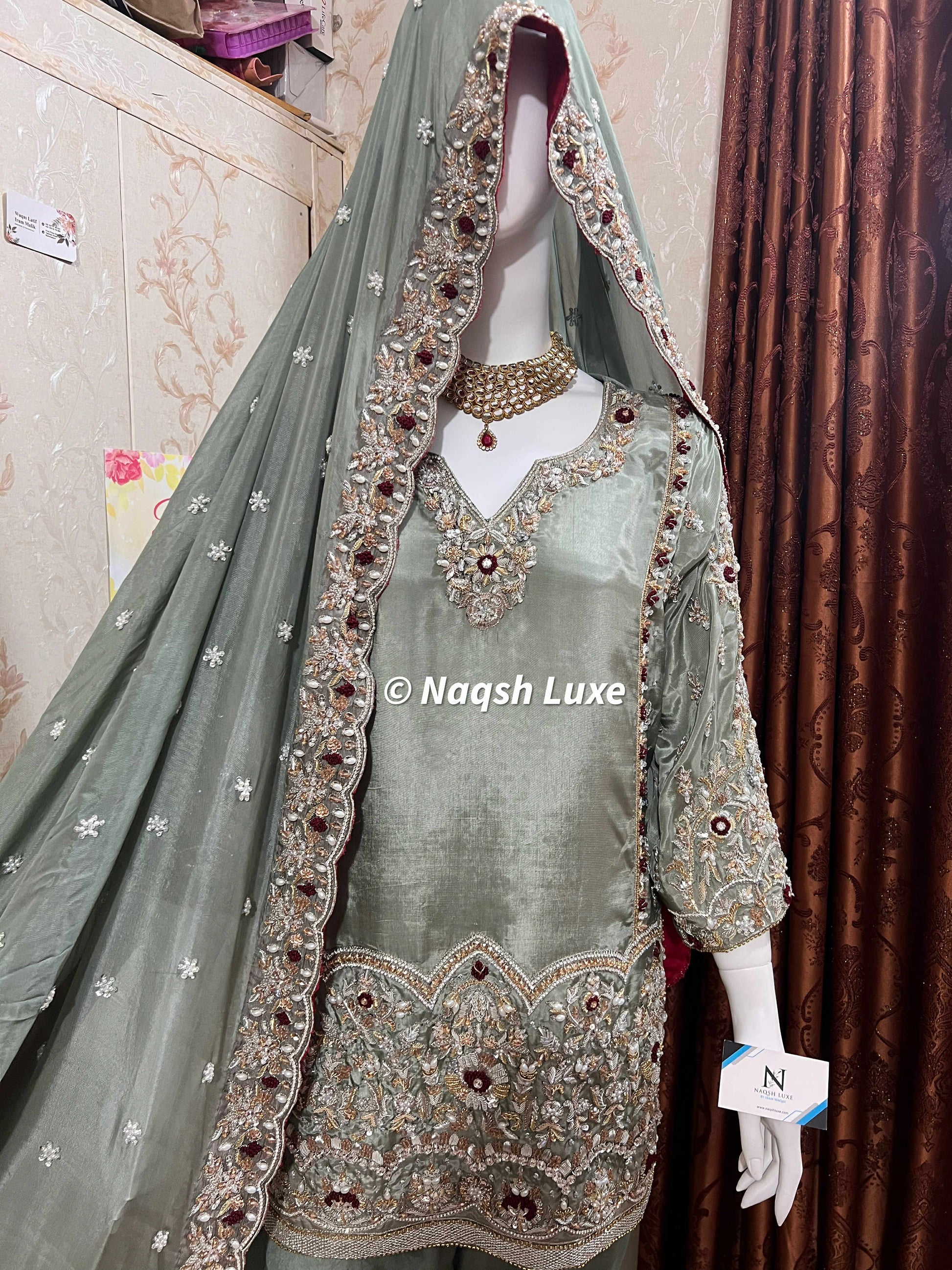 ‘The Pakistani dress is beautifully handcrafted with zari, kora, dabka, stones, pearls and sequins. All the embellishments are handsewn with double thread.