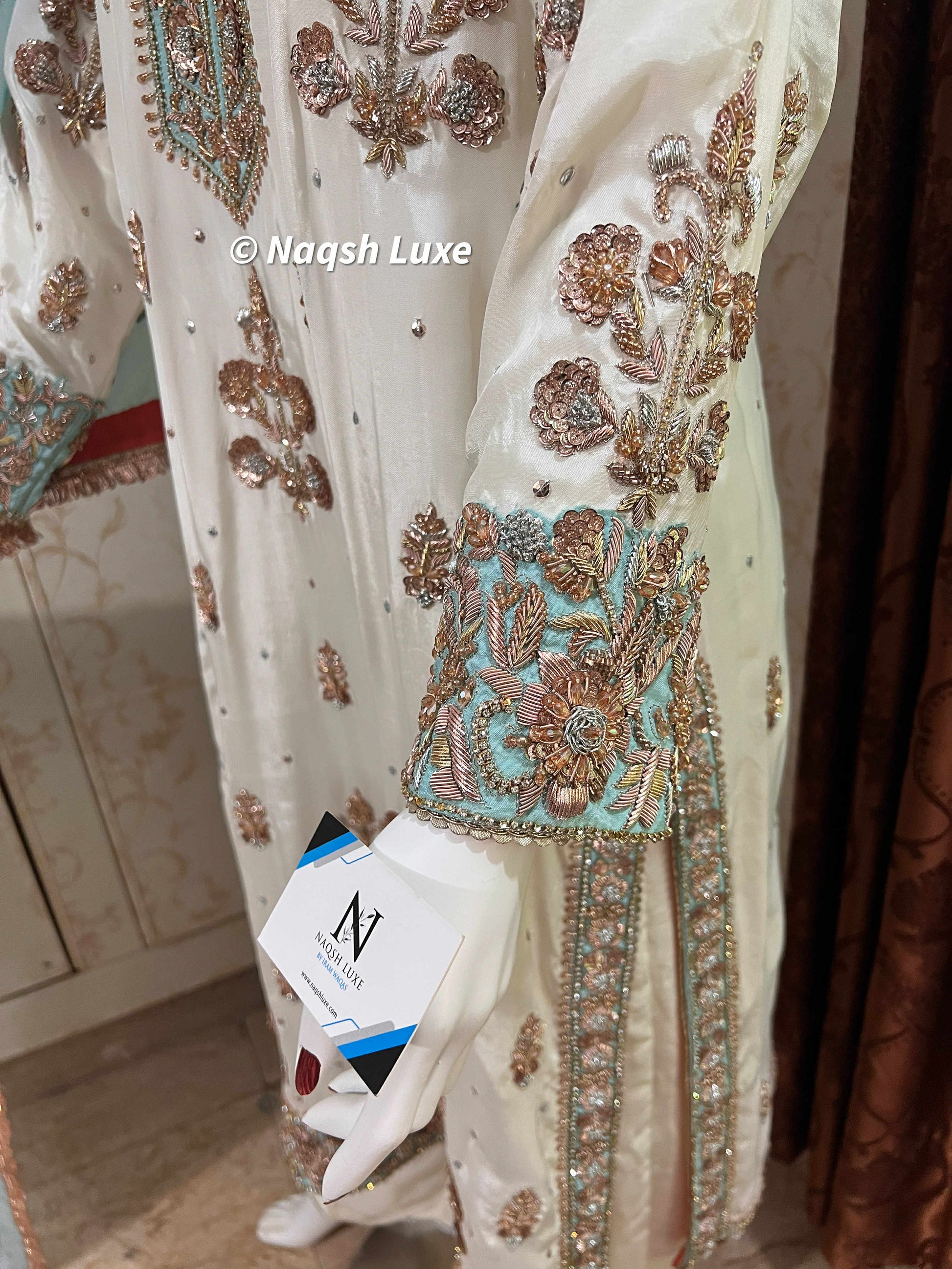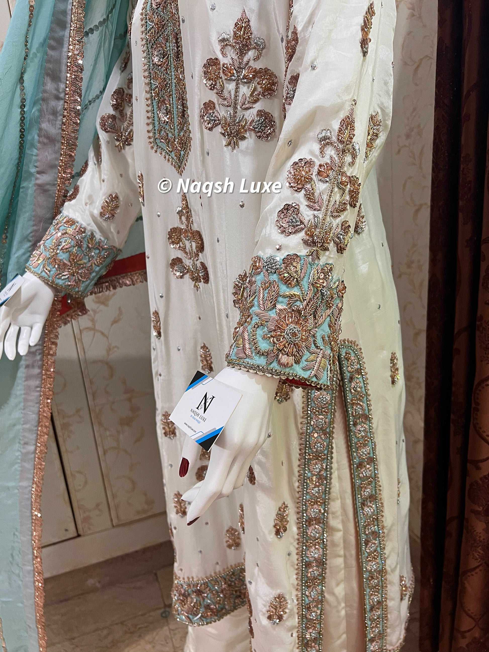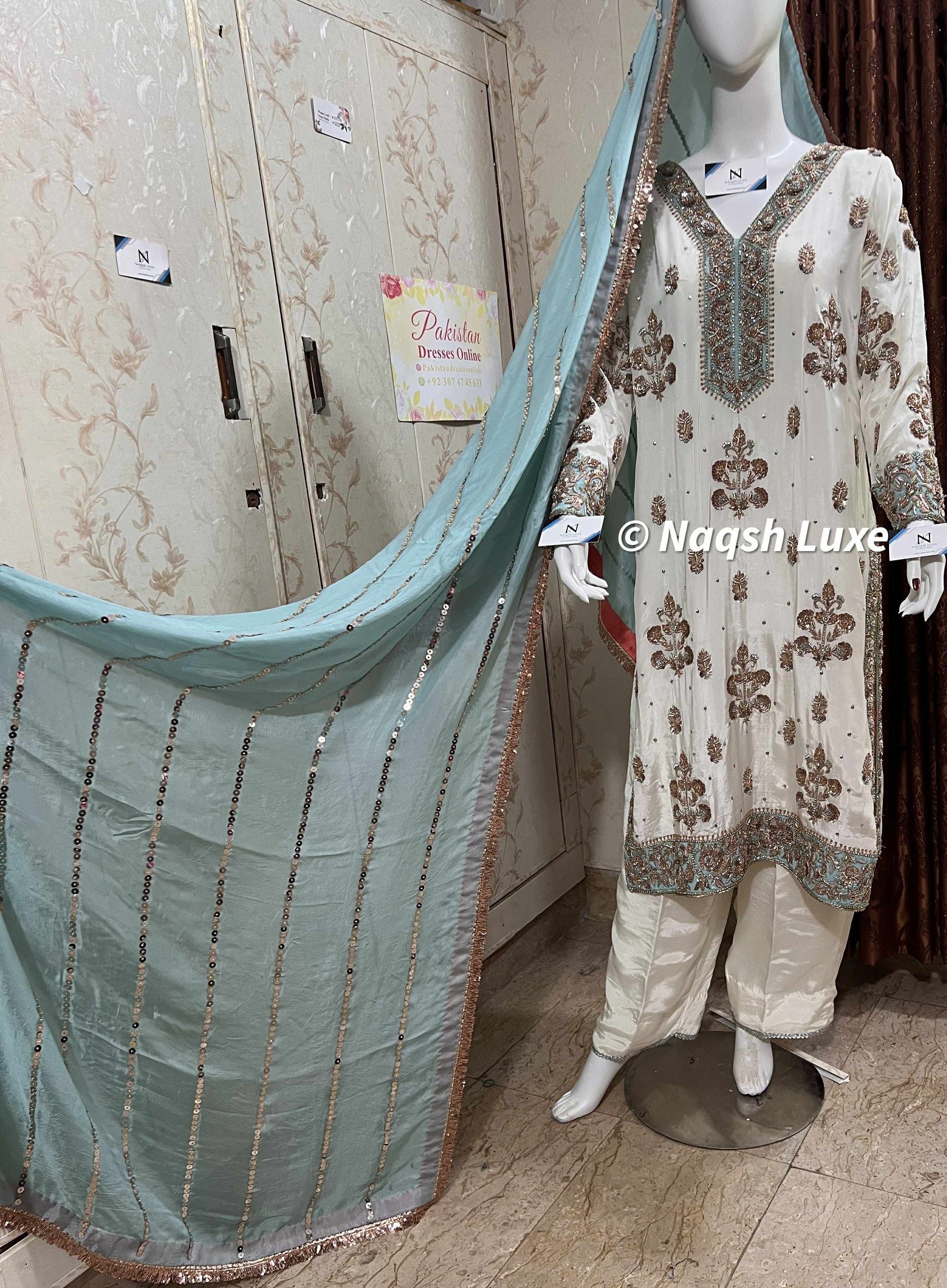 ‘The Pakistani dress is beautifully handcrafted with zari, kora, dabka, stones, pearls and sequins. All the embellishments are handsewn with double thread.