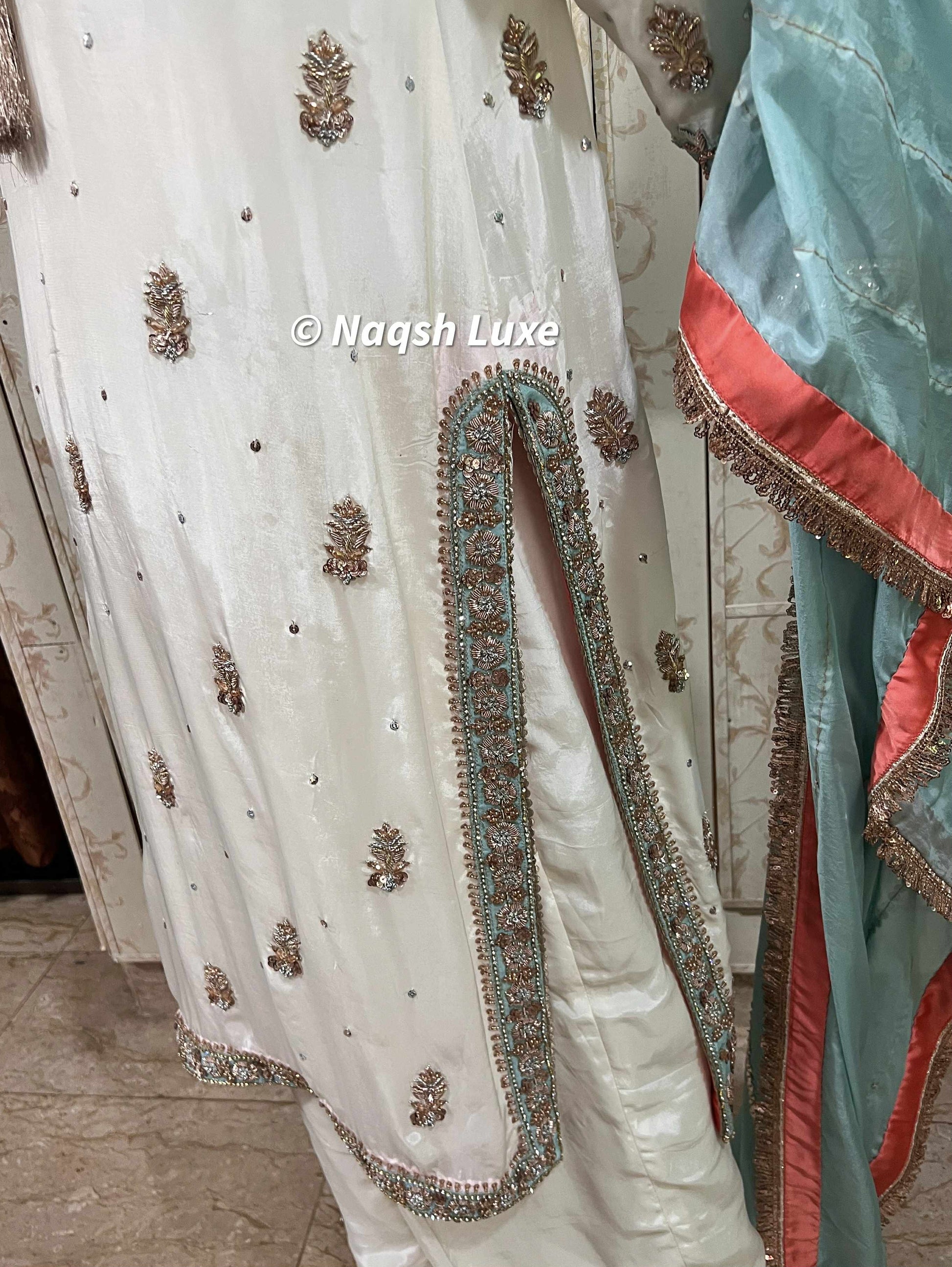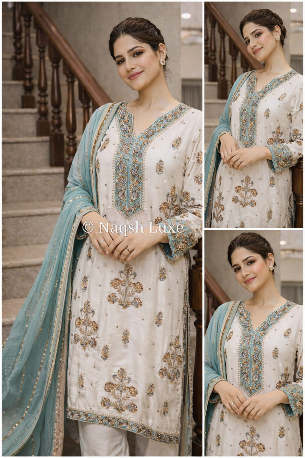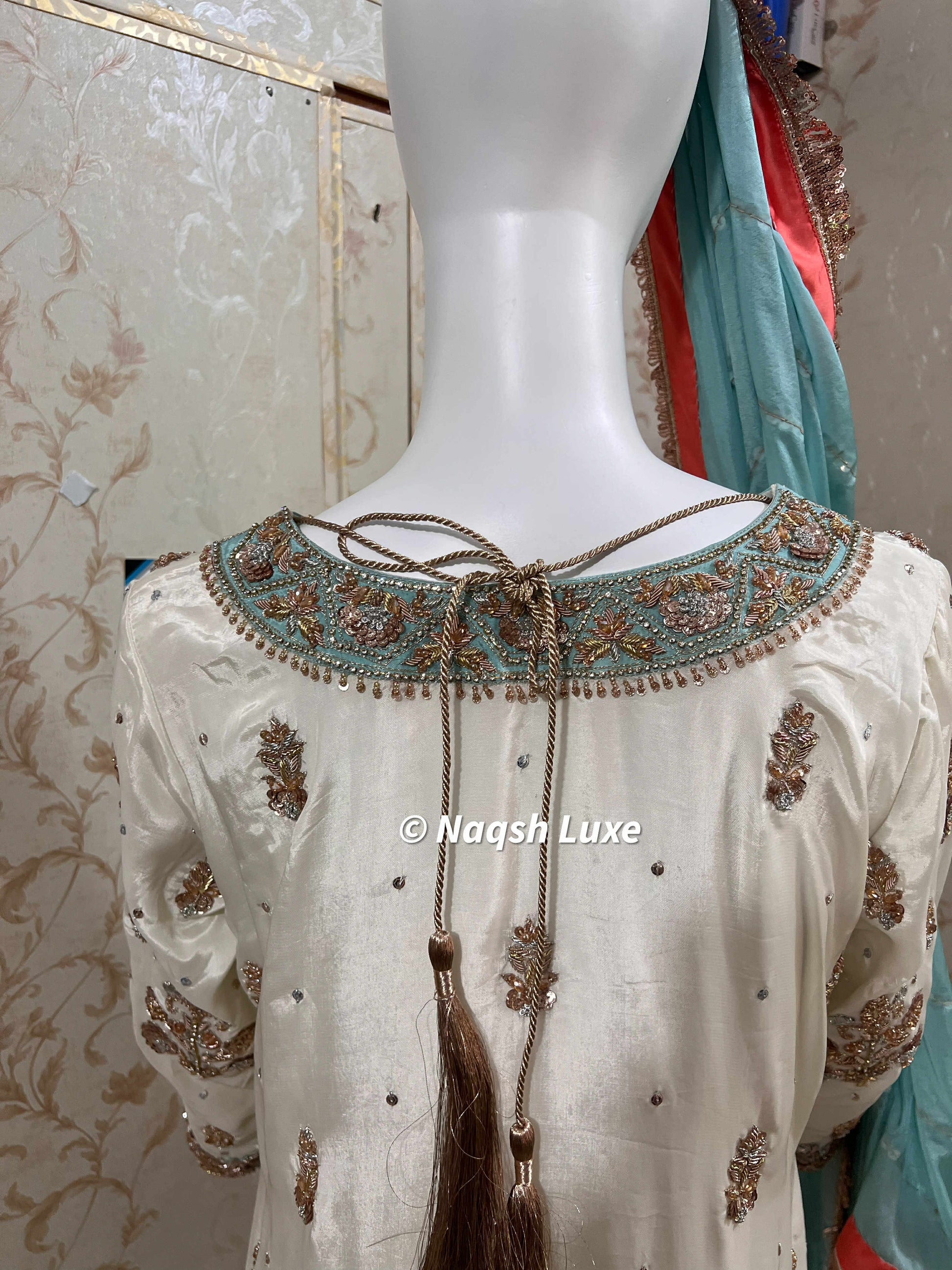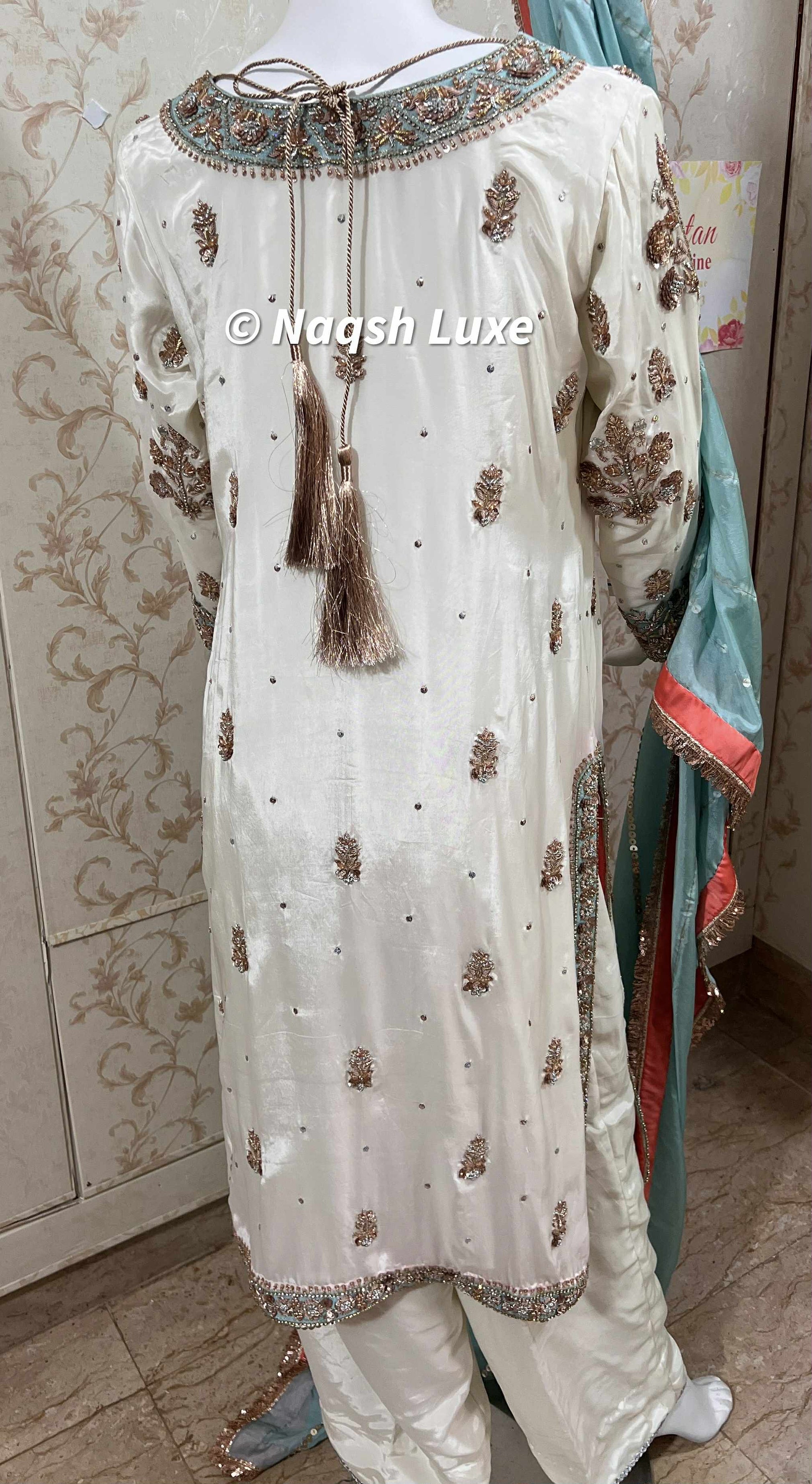 ‘The Pakistani dress is beautifully handcrafted with zari, kora, dabka, stones, pearls and sequins. All the embellishments are handsewn with double thread.
