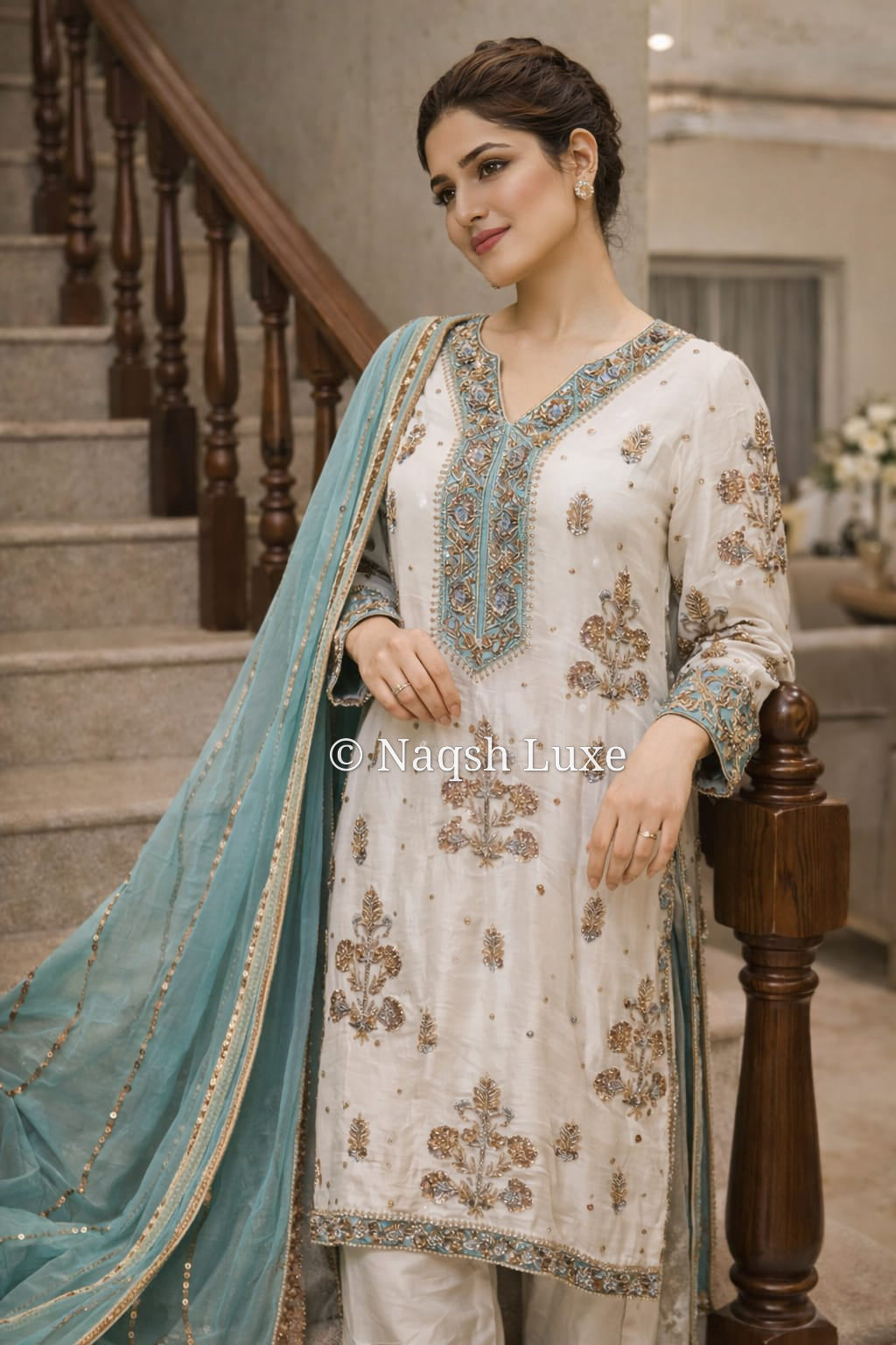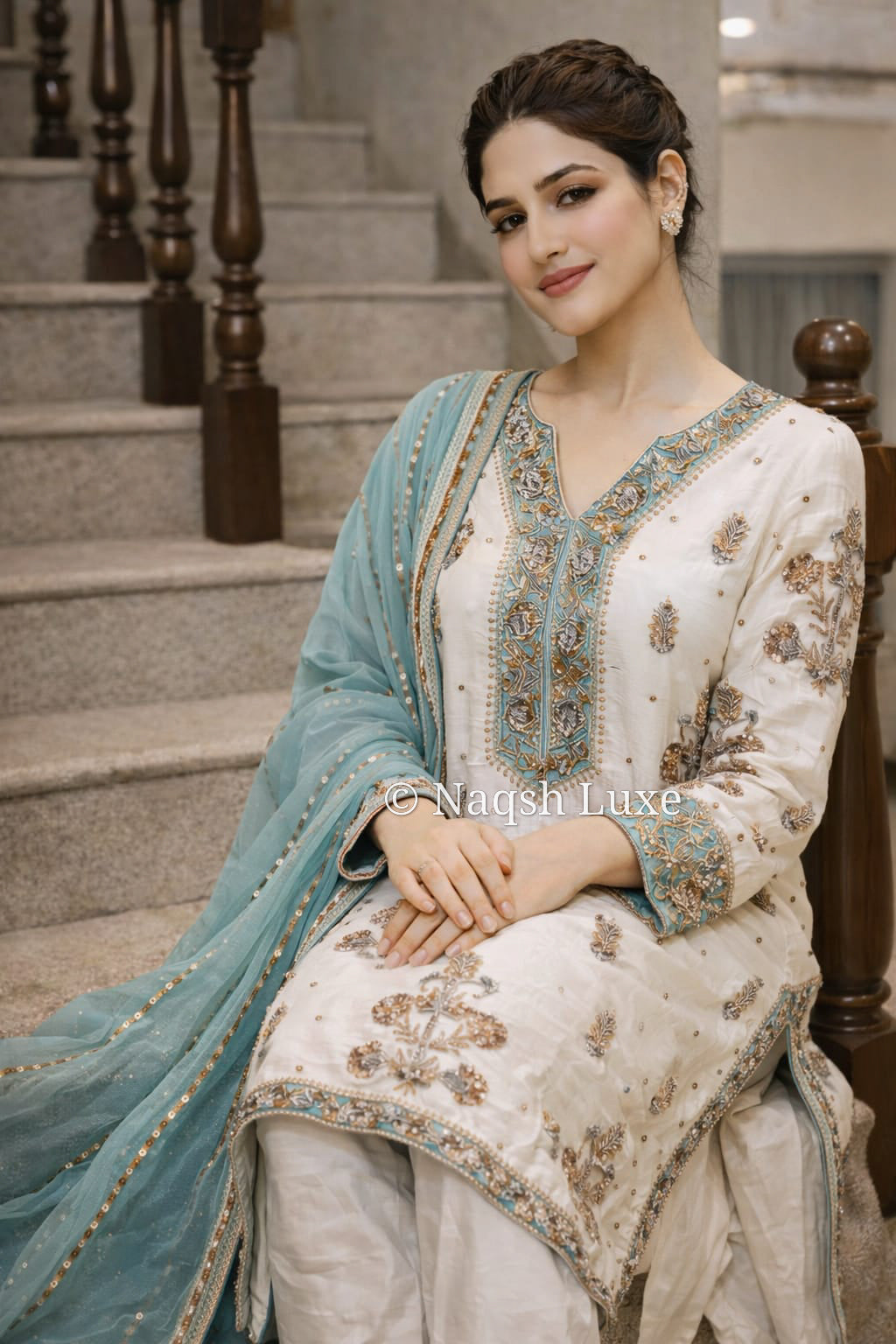 Materials Used: Dabka, zardozi, kora, sequins, crystals, pearls, tilla, stones, resham.
