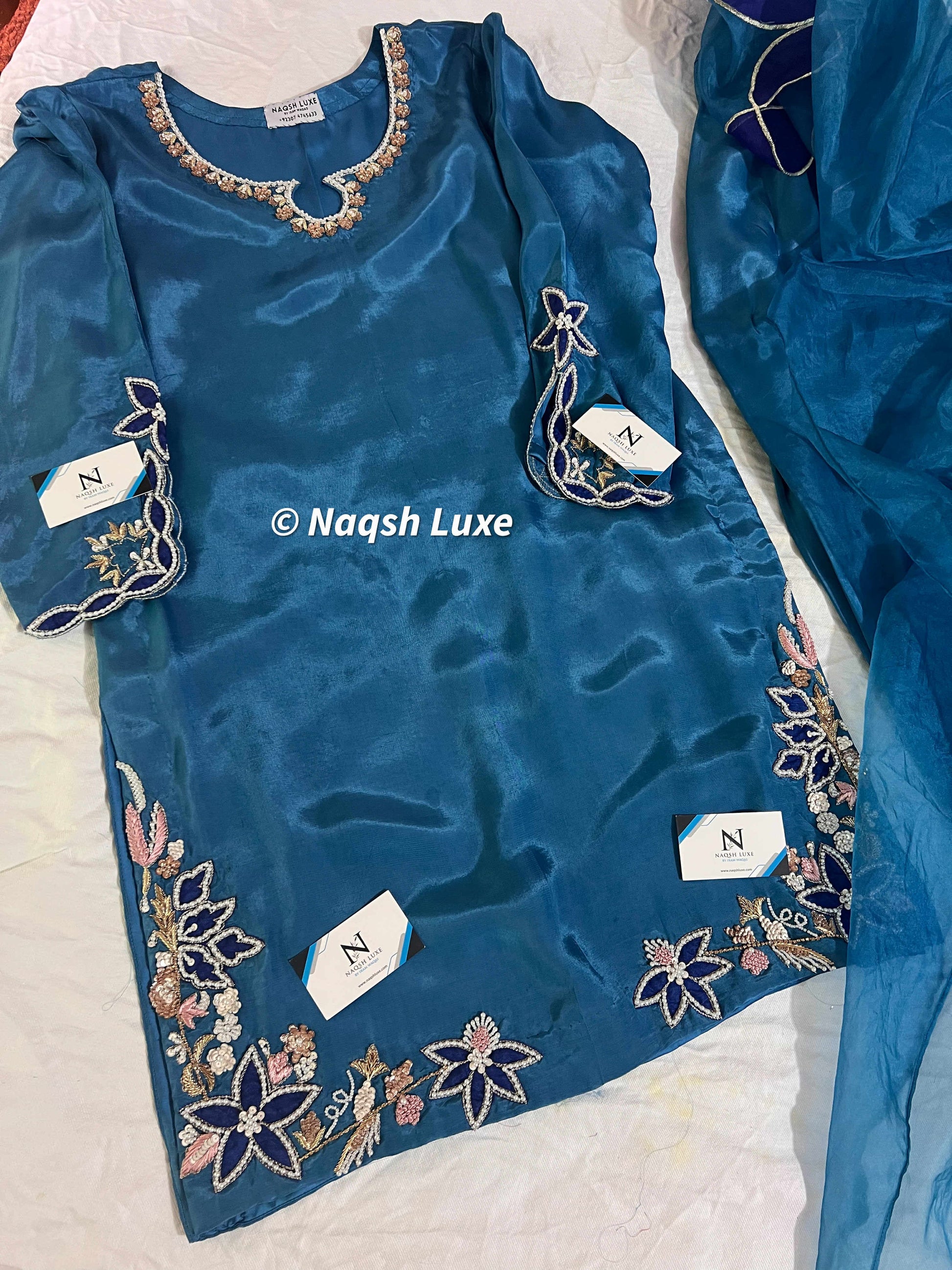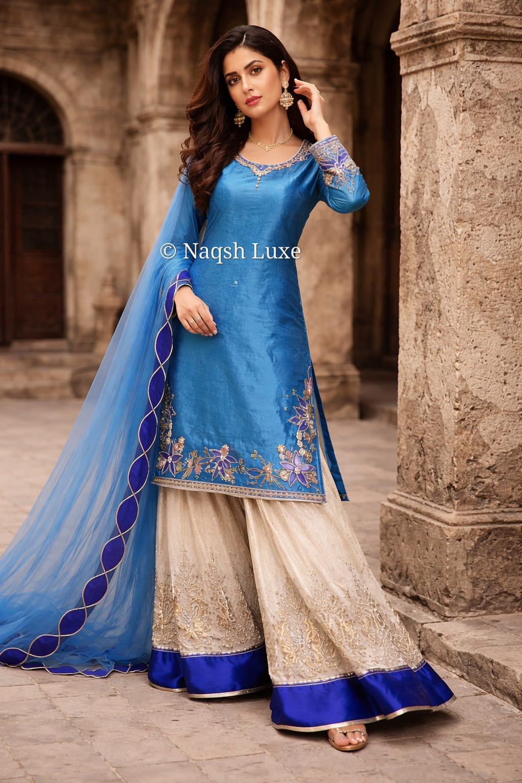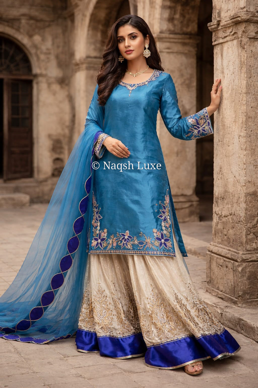 The Pakistani dress is beautifully handcrafted with zari, kora, dabka, stones, pearls and sequins. All the embellishments handsewn with double thread.