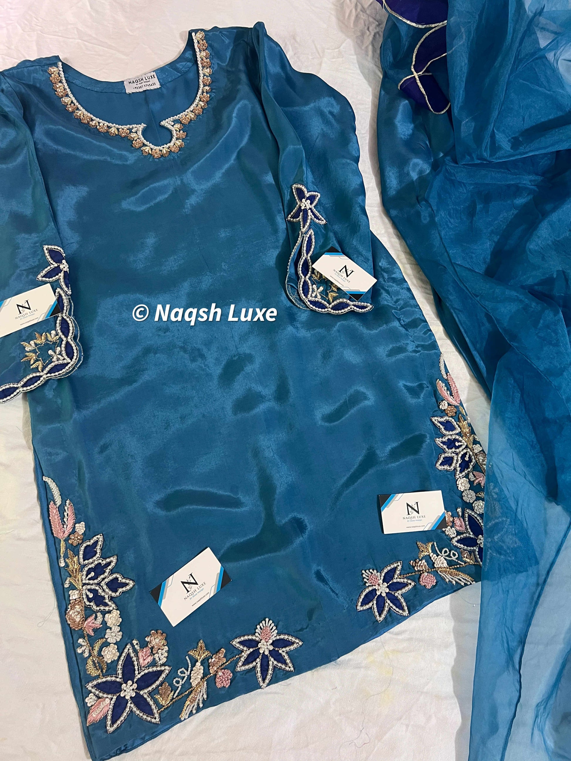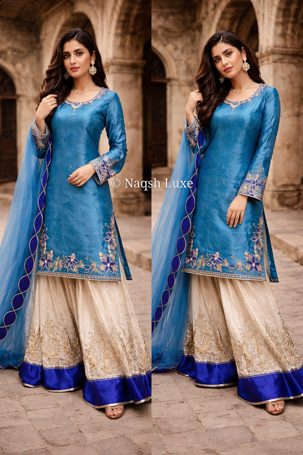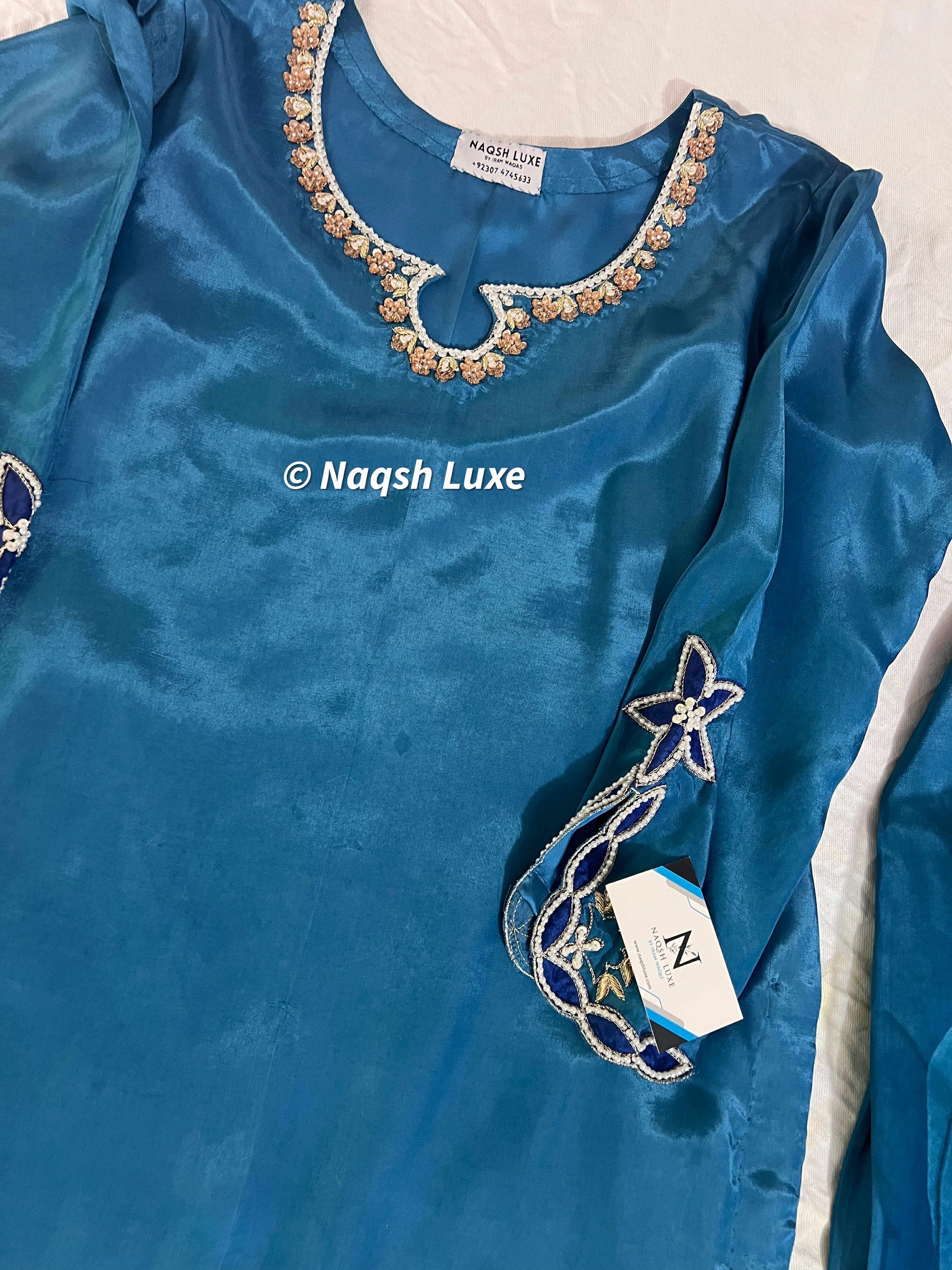 The Pakistani dress is beautifully handcrafted with zari, kora, dabka, stones, pearls and sequins. All the embellishments handsewn with double thread.