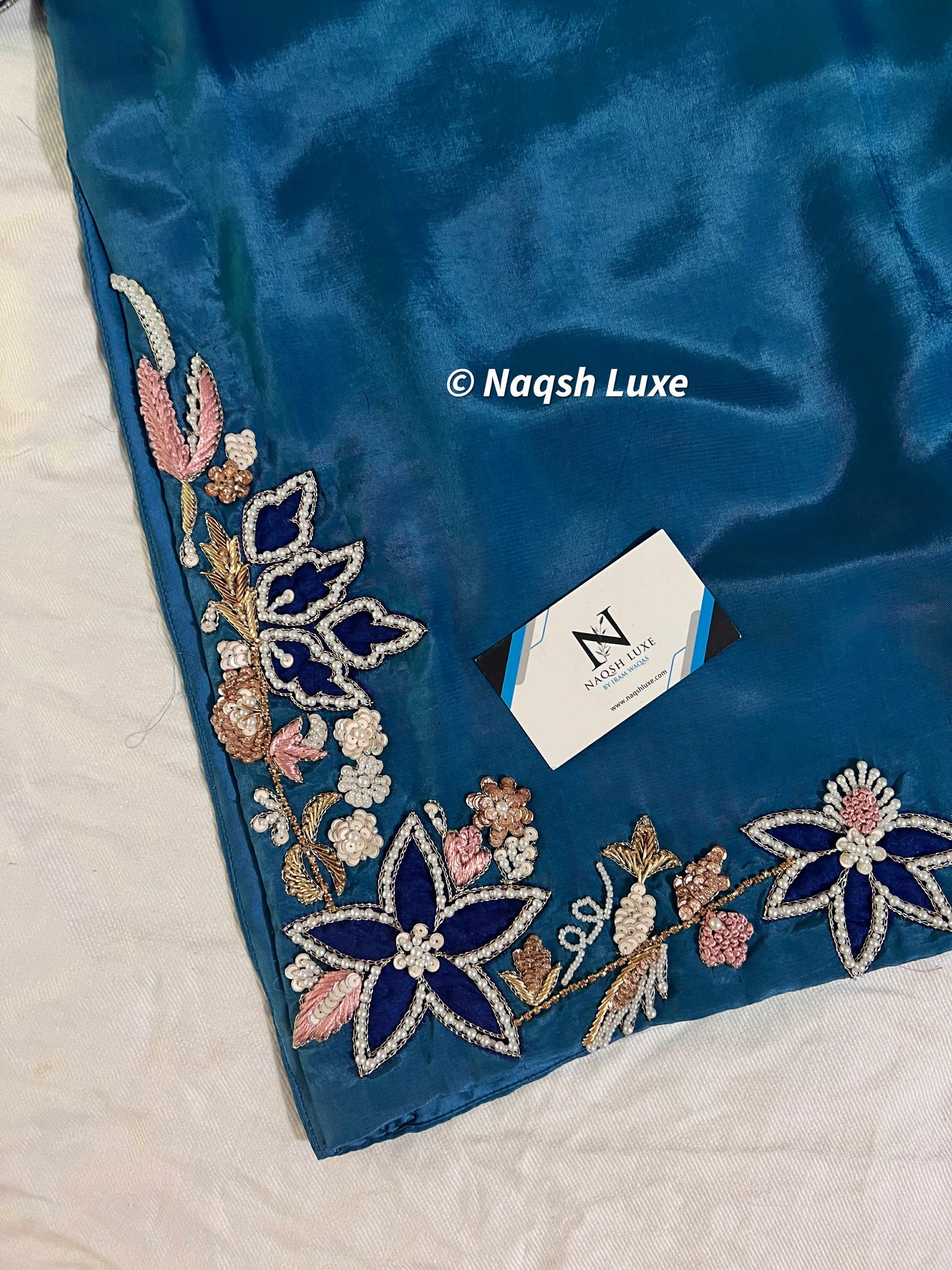 Materials Used: Dabka, zardozi, kora, sequins, crystals, pearls, tilla, stones.