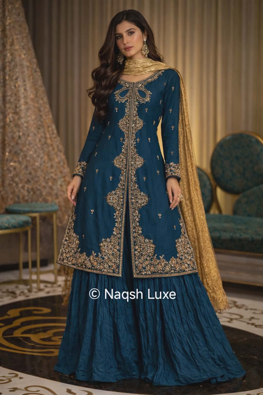 A timeless statement of elegance in deep teal, adorned with intricate gold dabka embroidery that reflects pure craftsmanship. Paired with flowing crushed sharara pants and a shimmering gold crushed dupatta, this ensemble captures regal grace with modern sophistication. Perfect for festive soirées and wedding celebrations where luxury meets tradition.