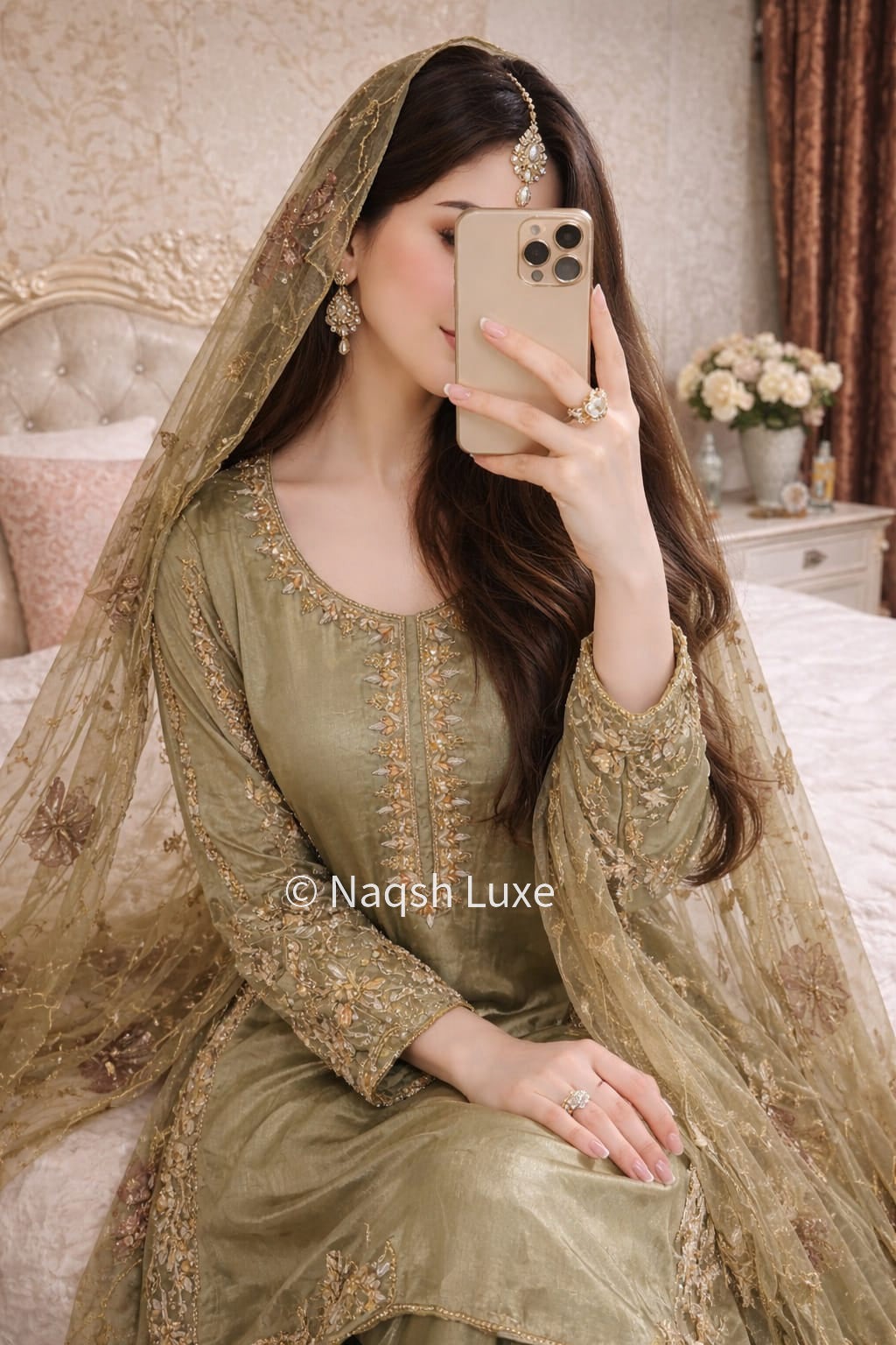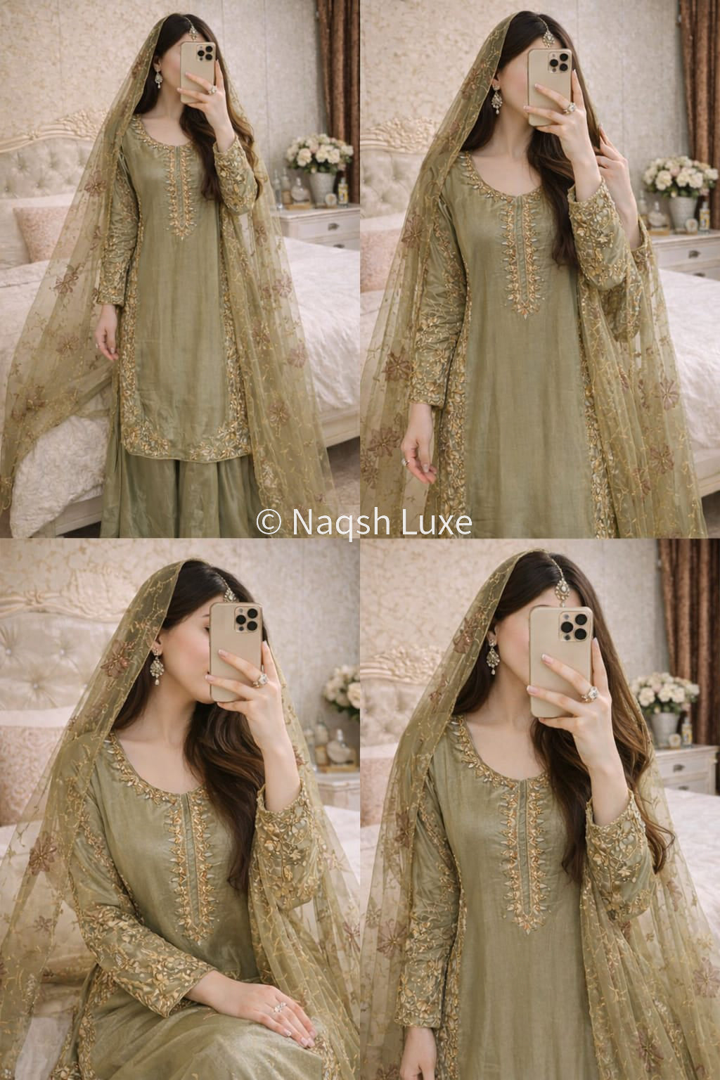 ‘The Pakistani dress is beautifully handcrafted with zari, kora, dabka, stones, pearls and sequins. All the embellishments are handsewn with double thread.