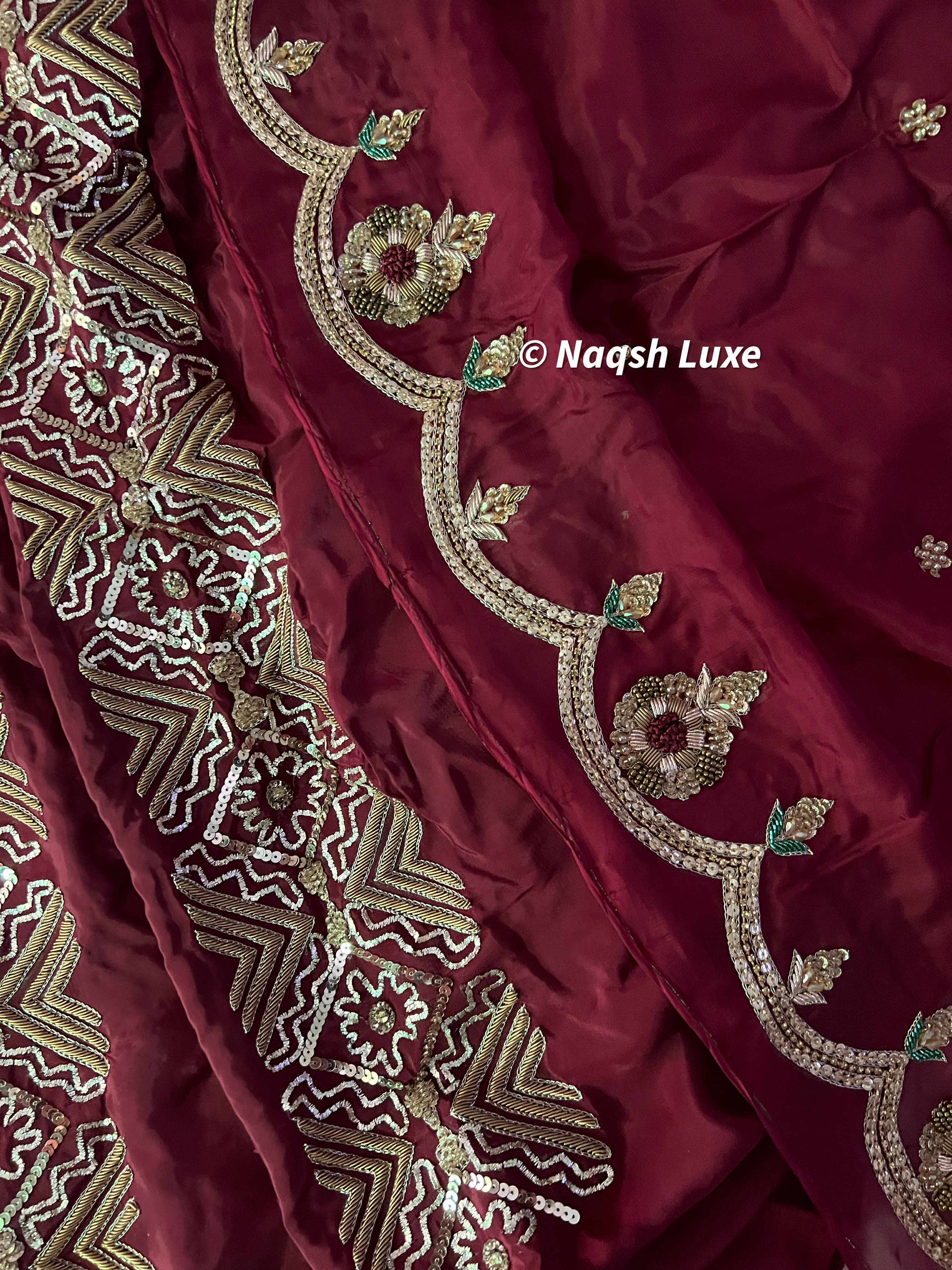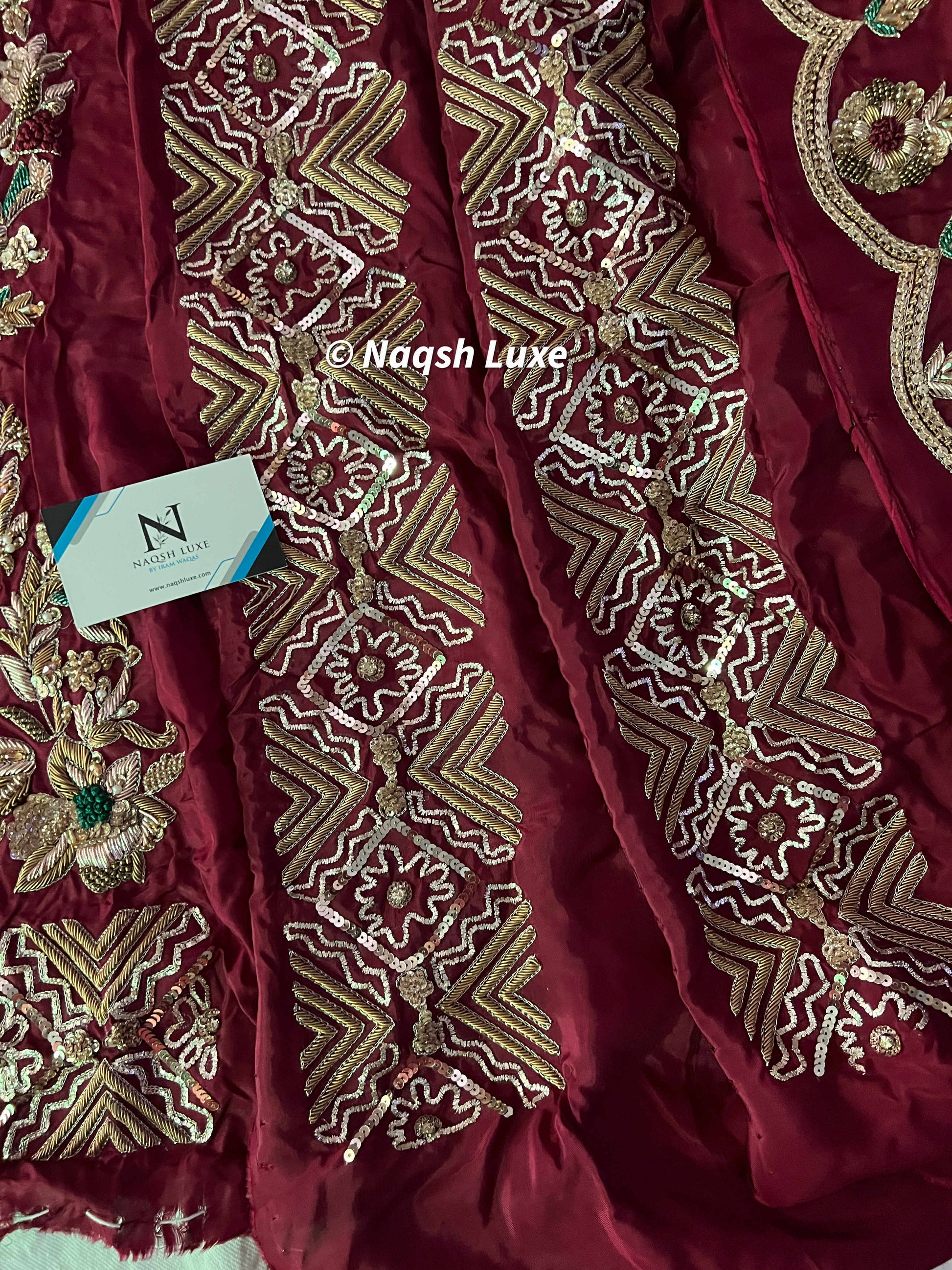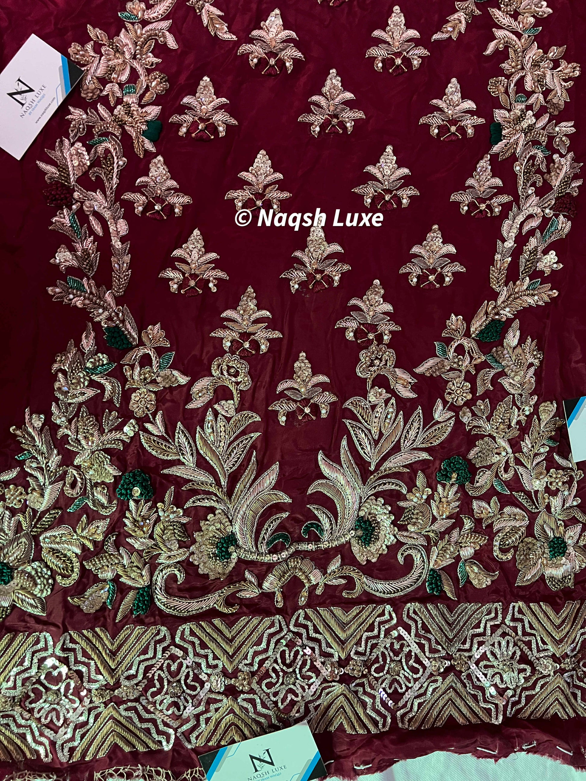 Materials Used: Dabka, zardozi, kora, sequins, crystals, pearls, tilla, stones, resham.