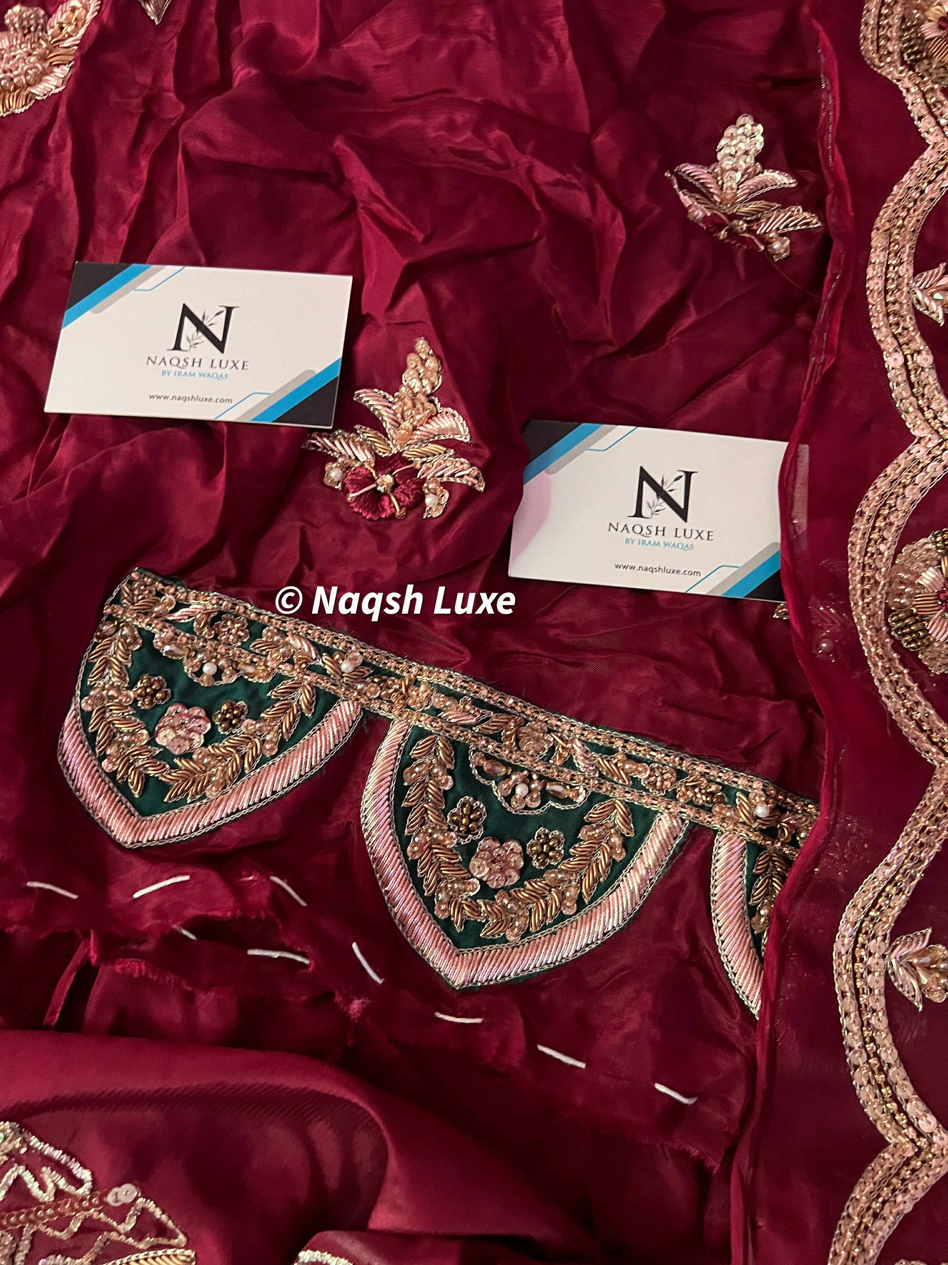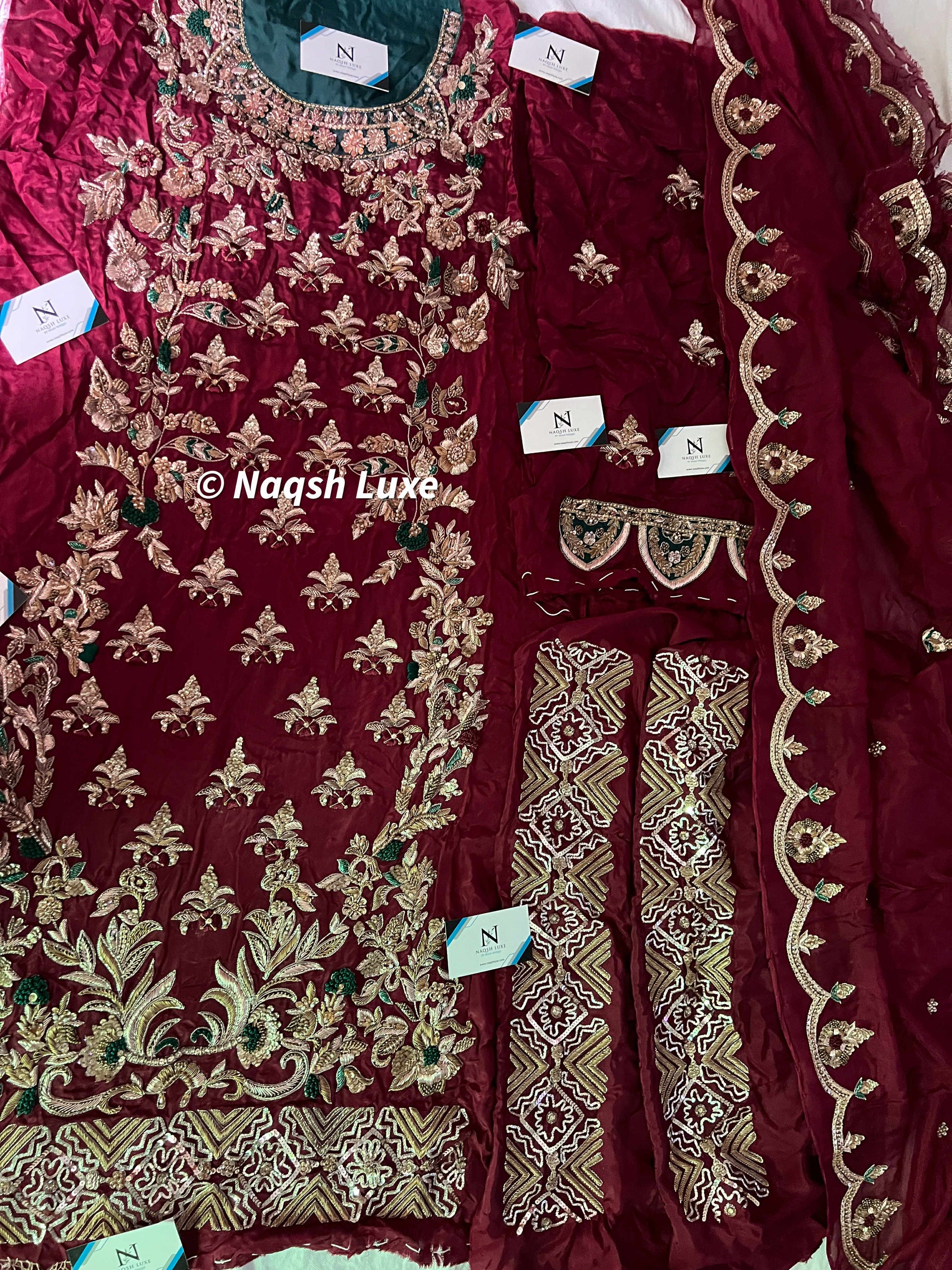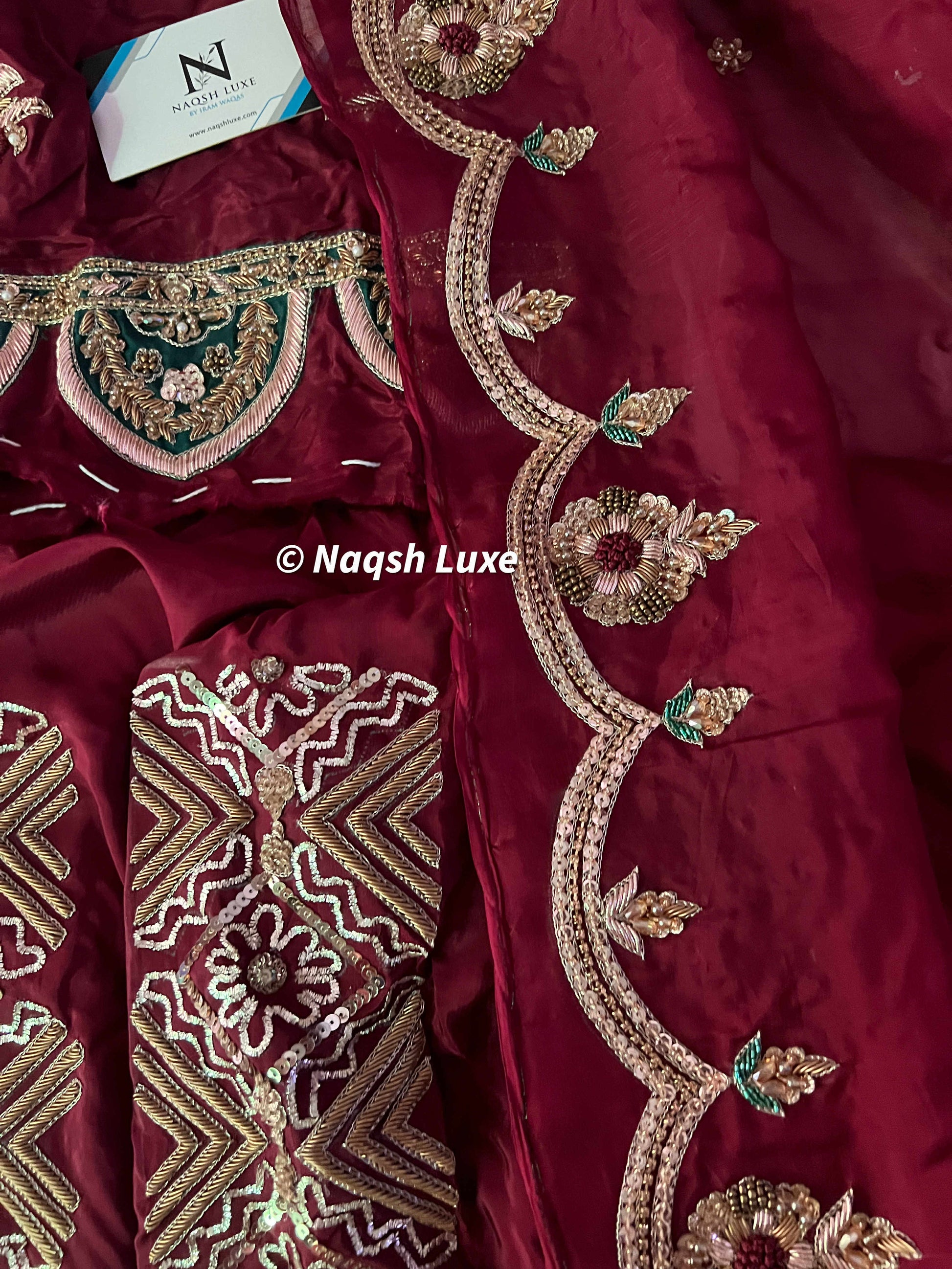Materials Used: Dabka, zardozi, kora, sequins, crystals, pearls, tilla, stones, resham.